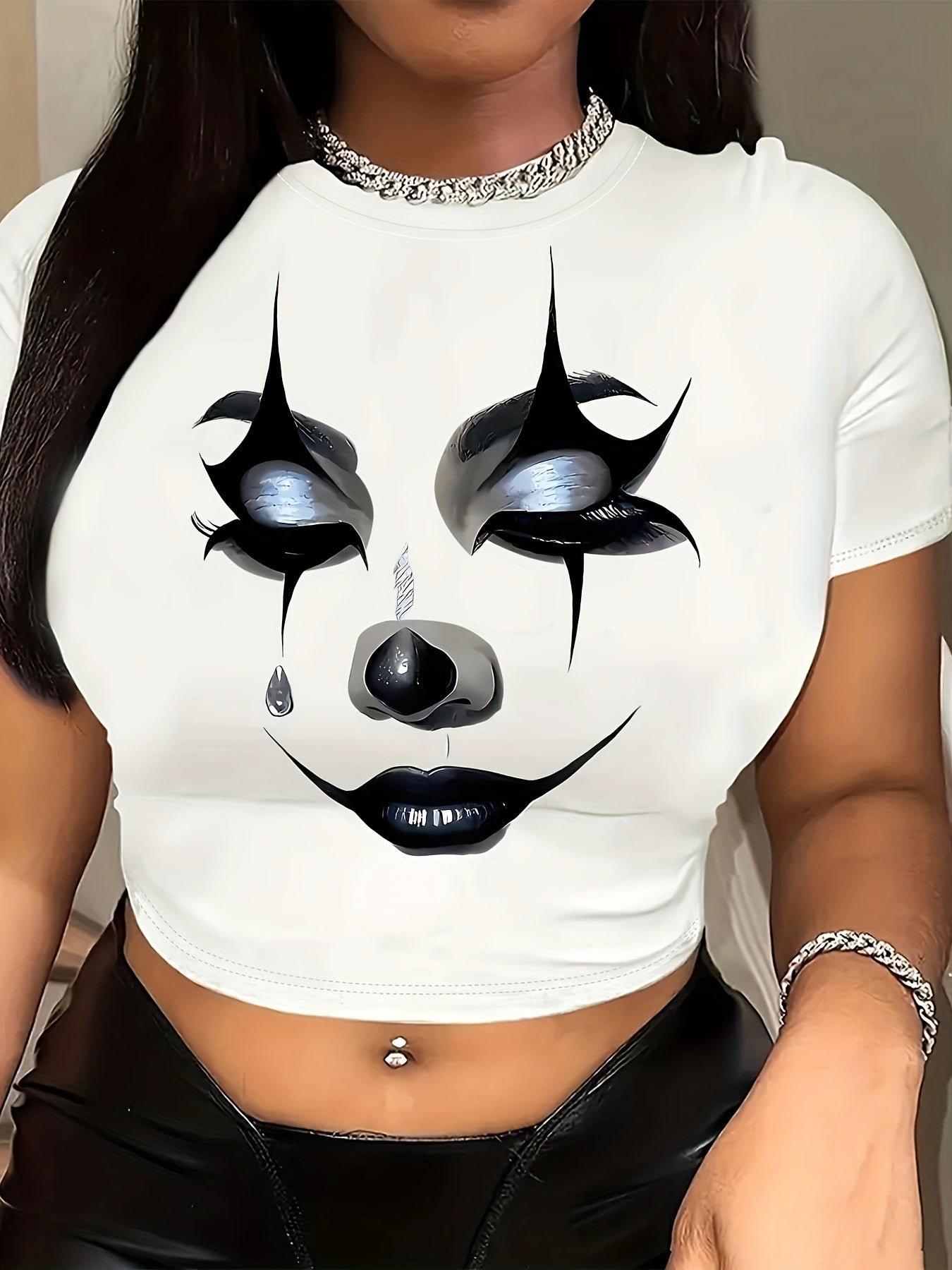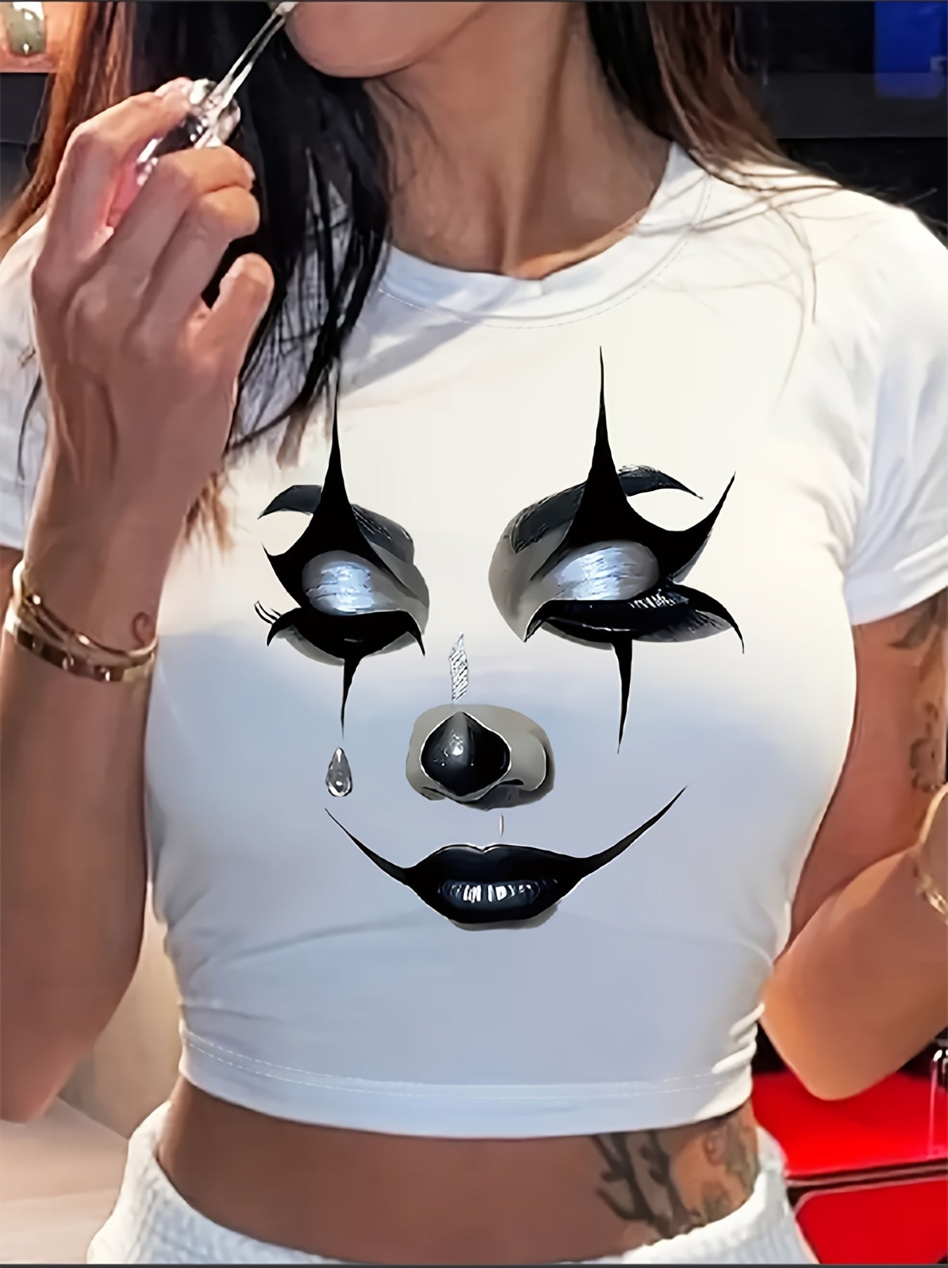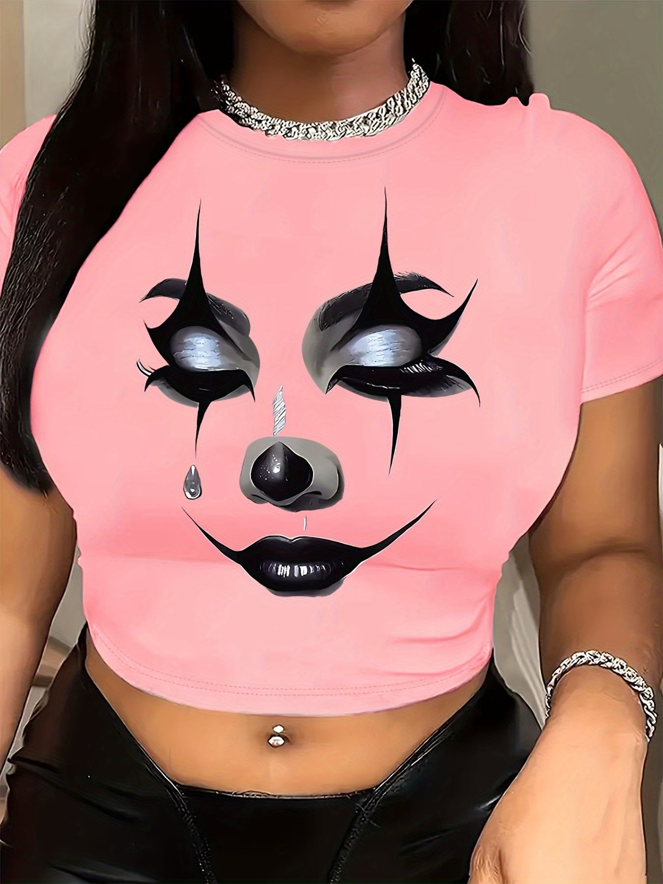 Clown Face Print Crew Neck T-Shirt, Casual Short Sleeve T-Shirt For Spring & Summer, Women's Clothing