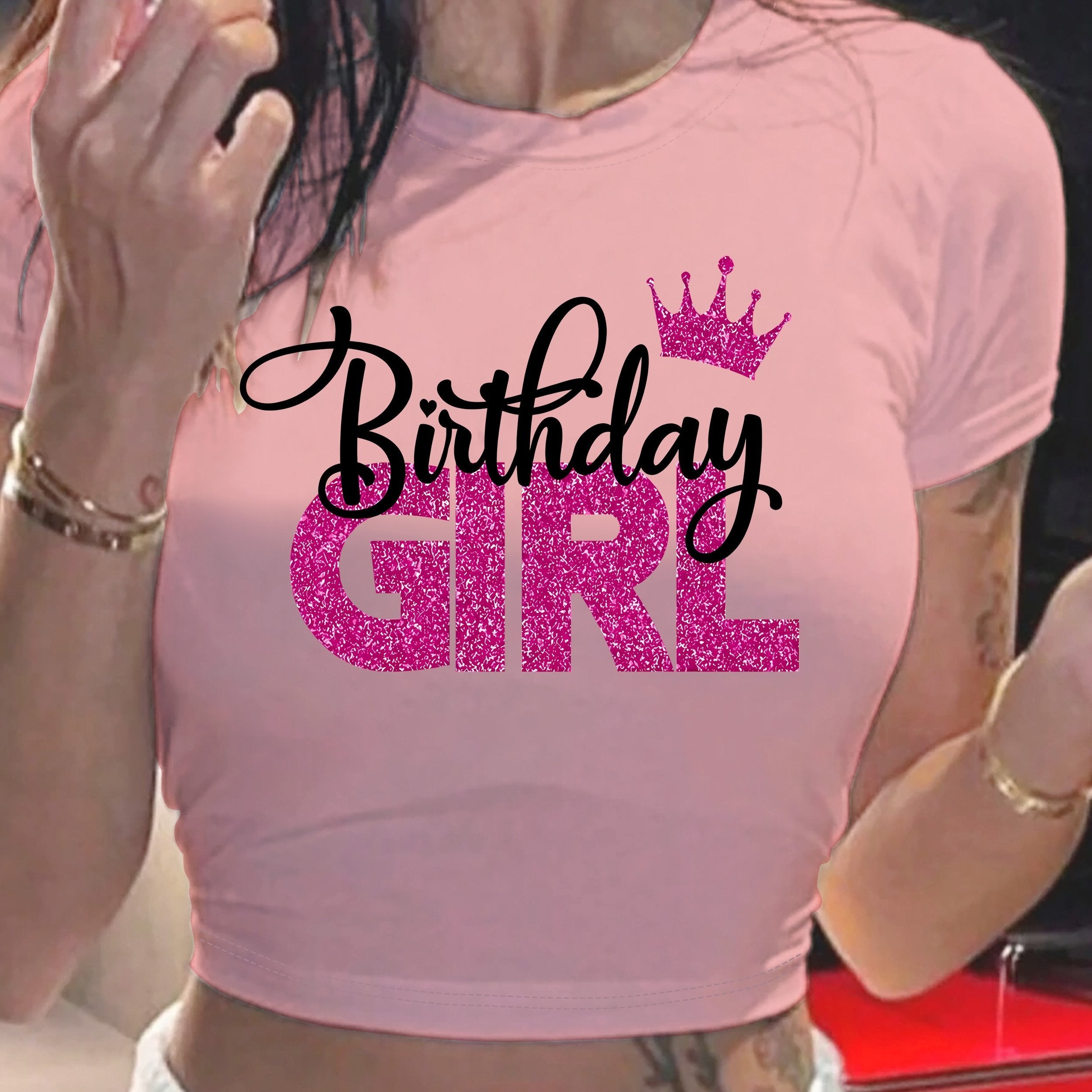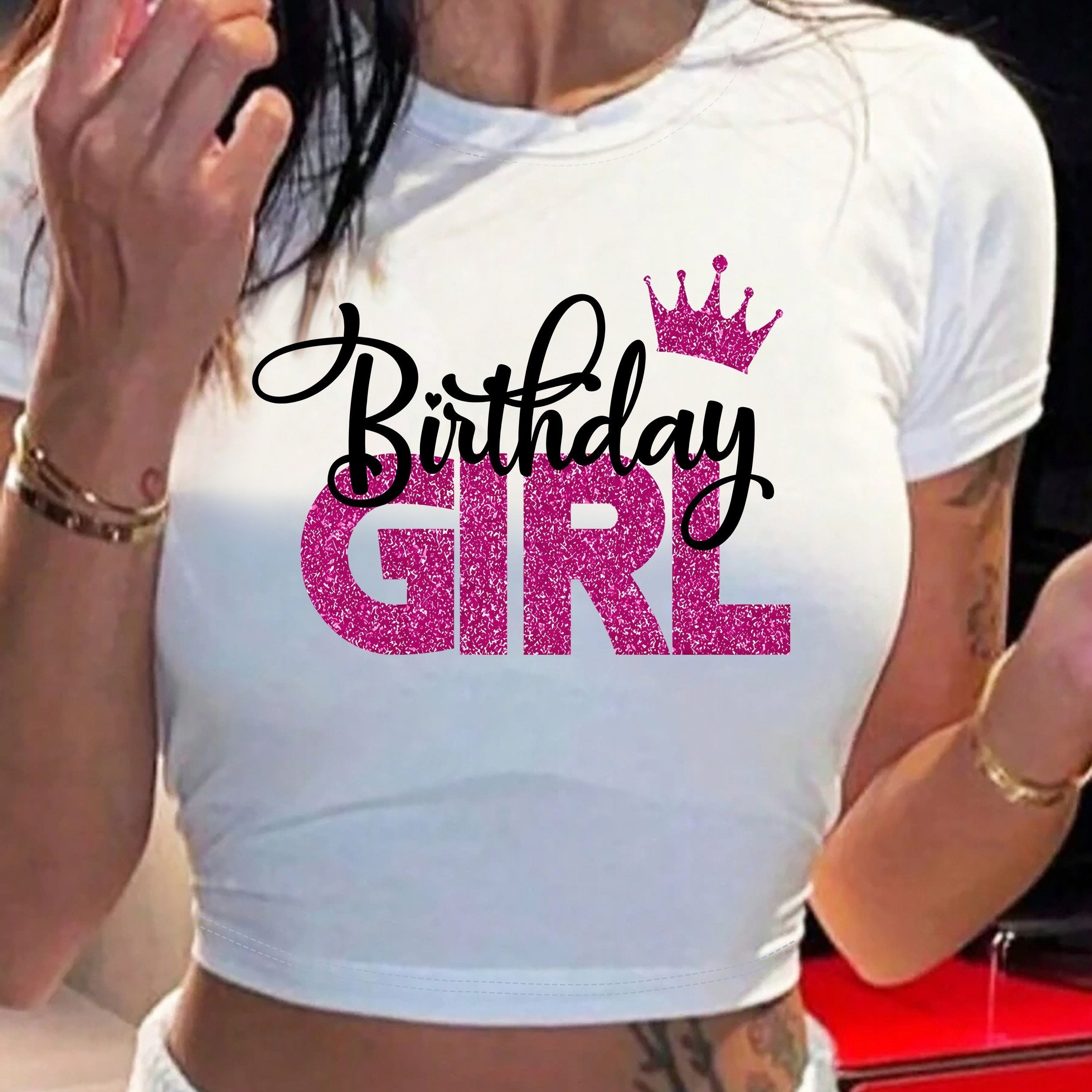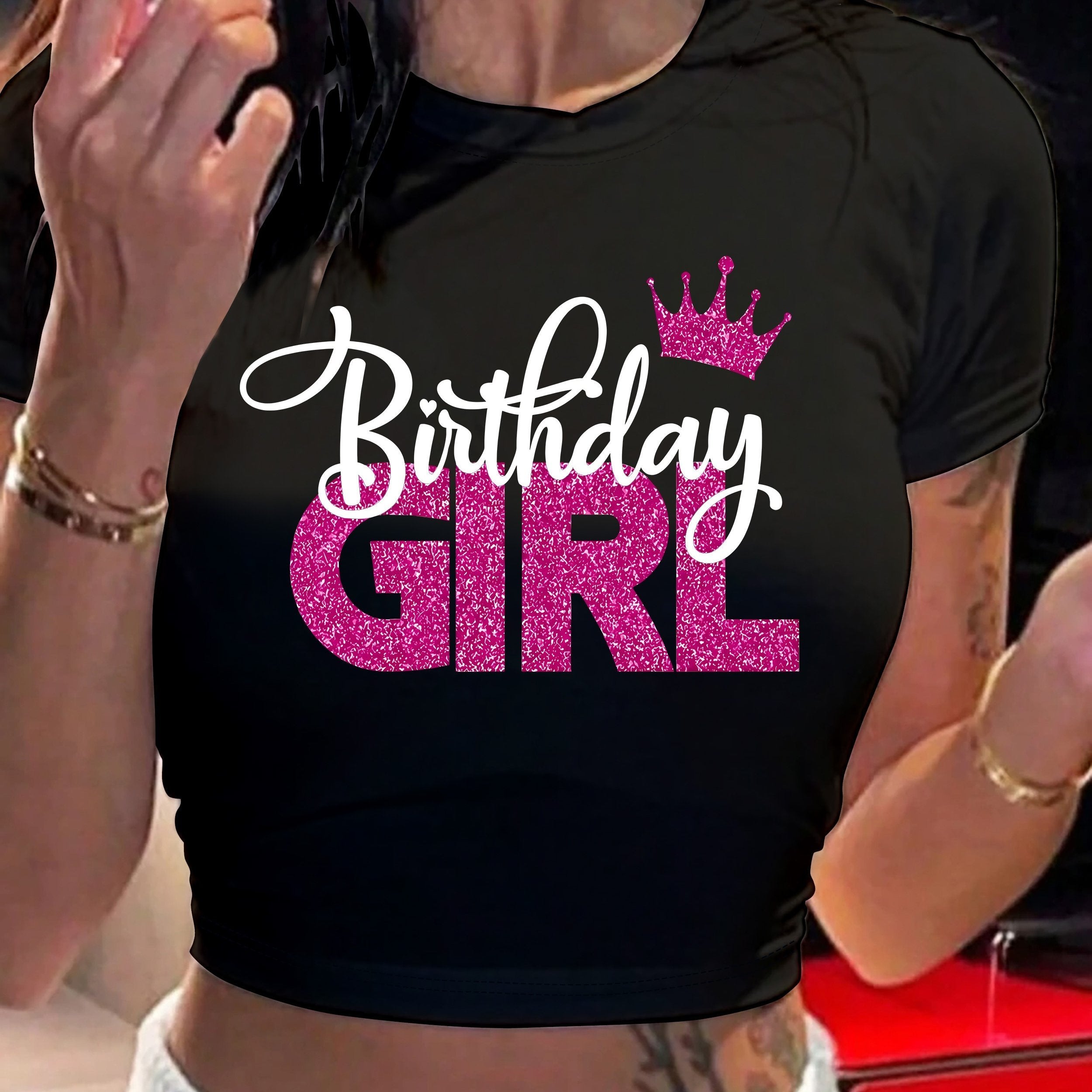 Girl's Birthday Print Crew Neck T-shirt, Casual Short Sleeve Crop Top For Spring & Summer, Women's Clothing