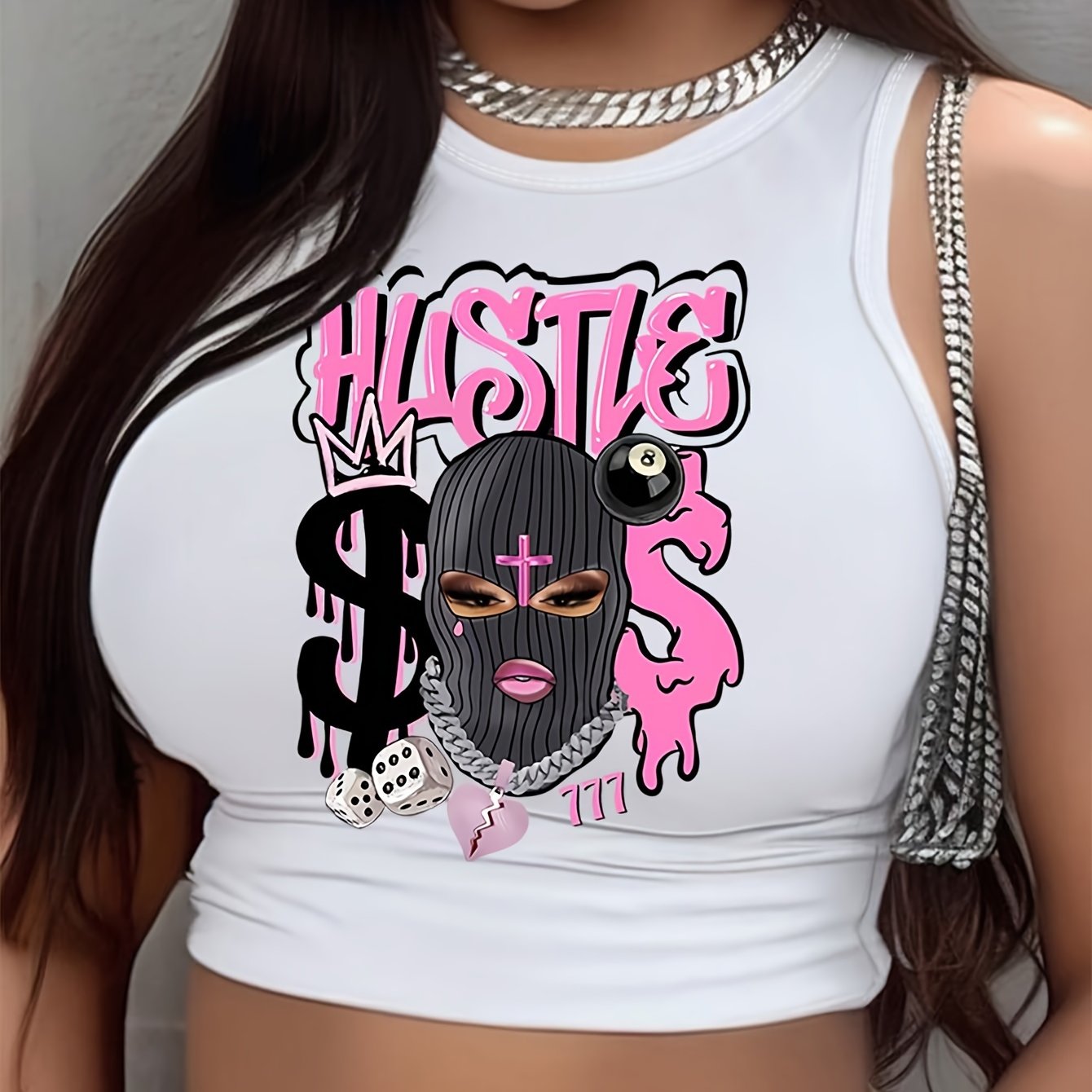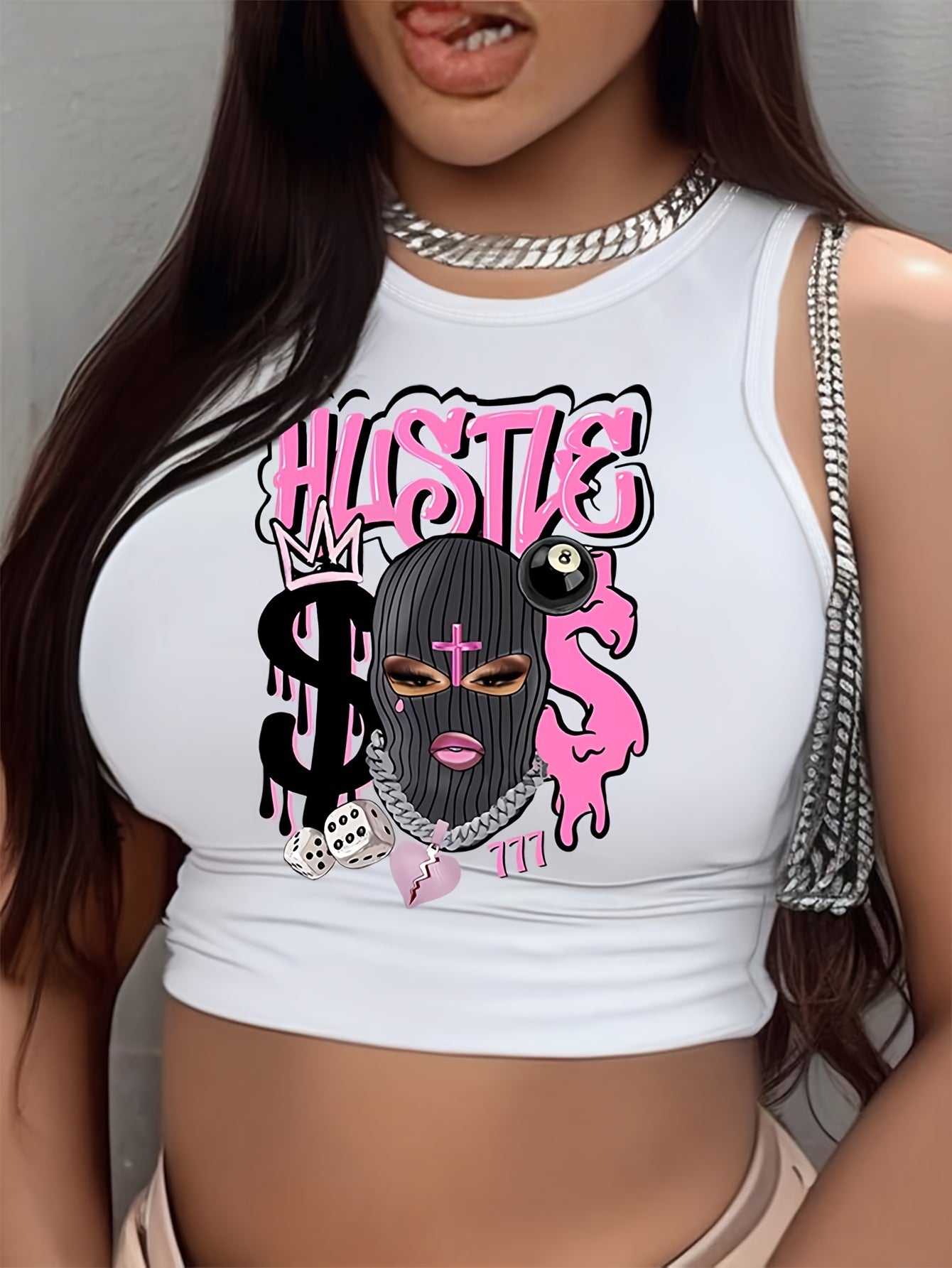 HUSTLE & Figure Print Crew Neck Tank Top, Casual Sleeveless Crop Tank Top For Spring & Summer, Women's Clothing