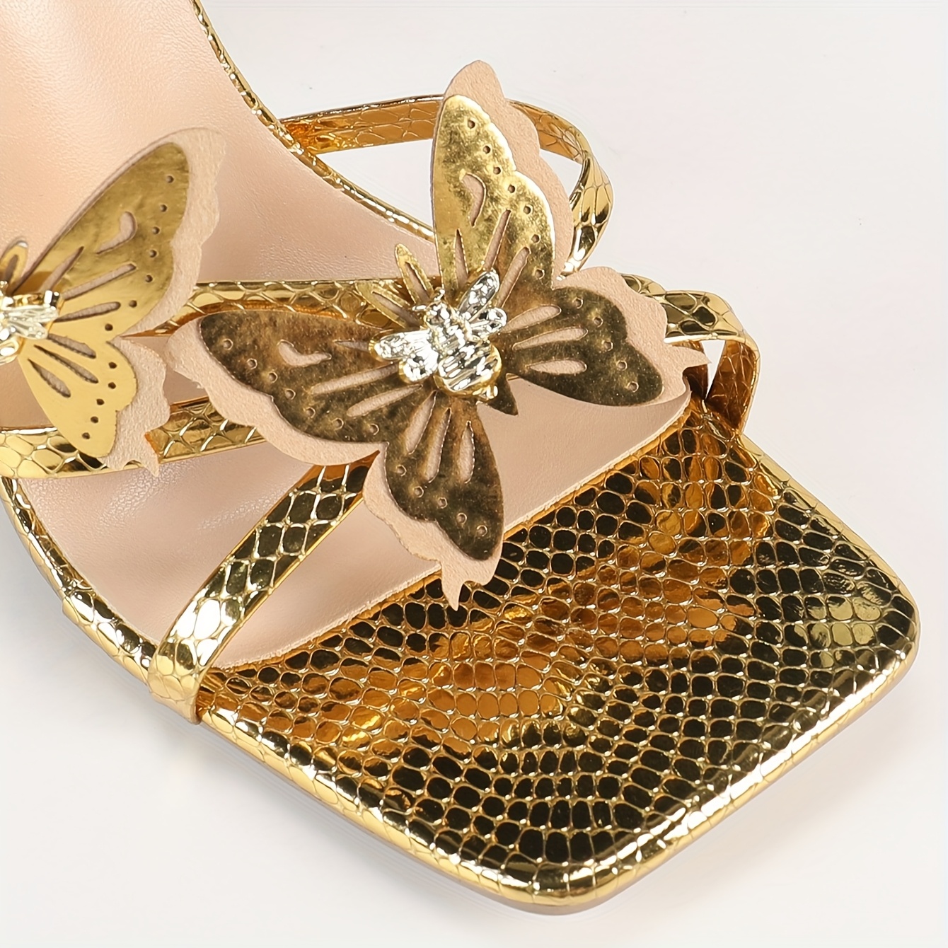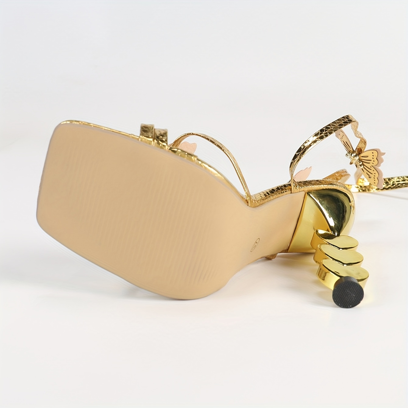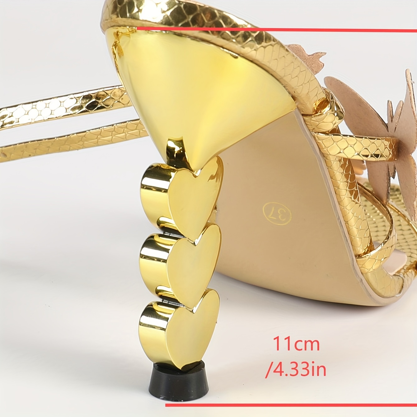 Women's Metallic Golden Ankle Wrap High Heel Sandals with Butterfly & Bow Accents, Heart-Shaped Heel for Evening Parties/Wedding Prom Dress Shoes