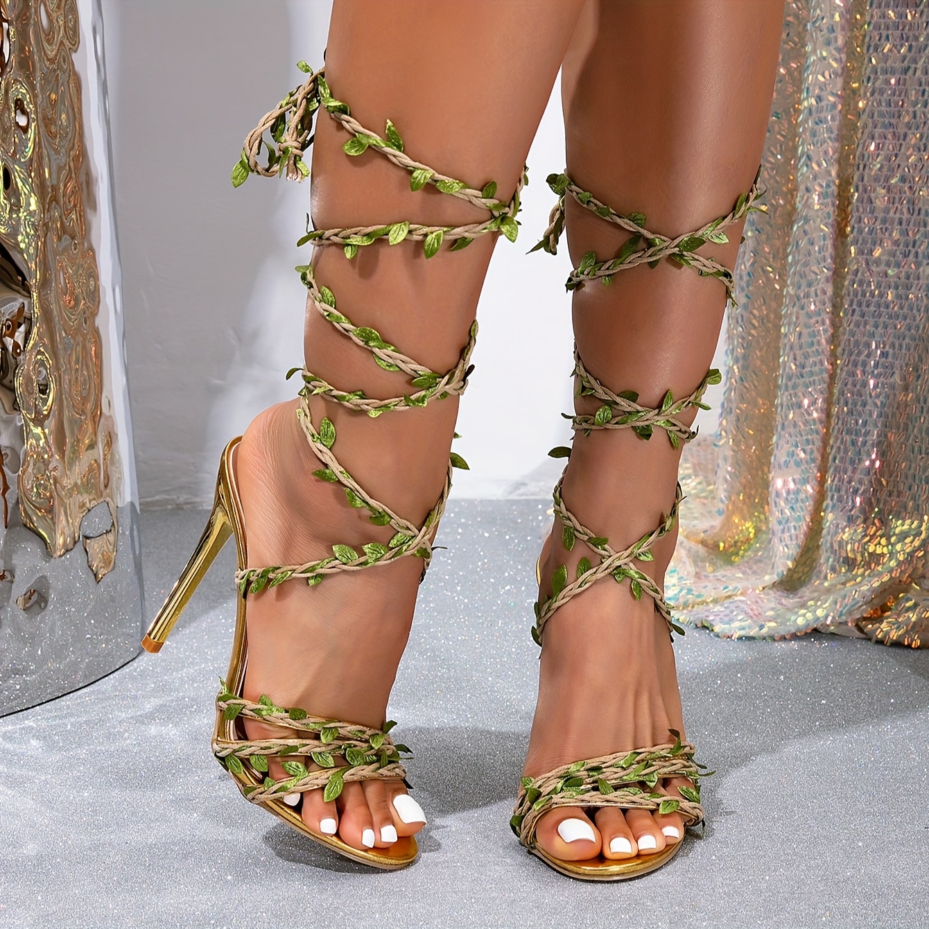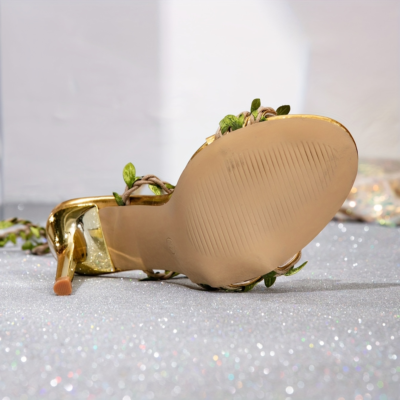 Elegant Golden-Tone Heeled Sandals for Women - Summer 2025 Collection, Pointed Toe with Braided Green Leaf Vine Straps, Ultrahigh Stiletto Heels, Open Back Design, Synthetic Cover, PVC Sole, Perfect for All Seasons
