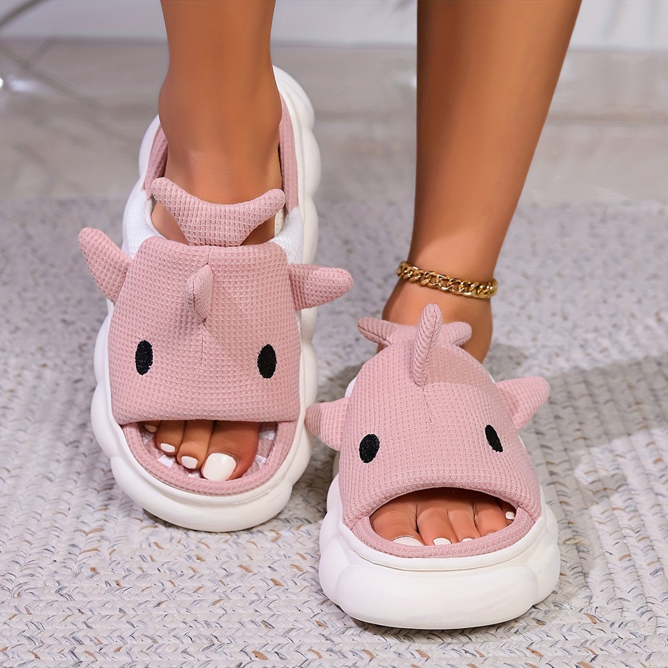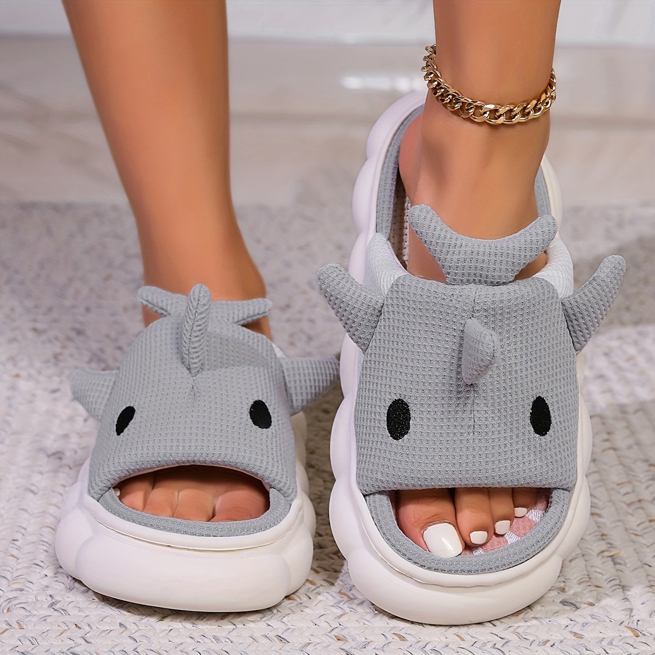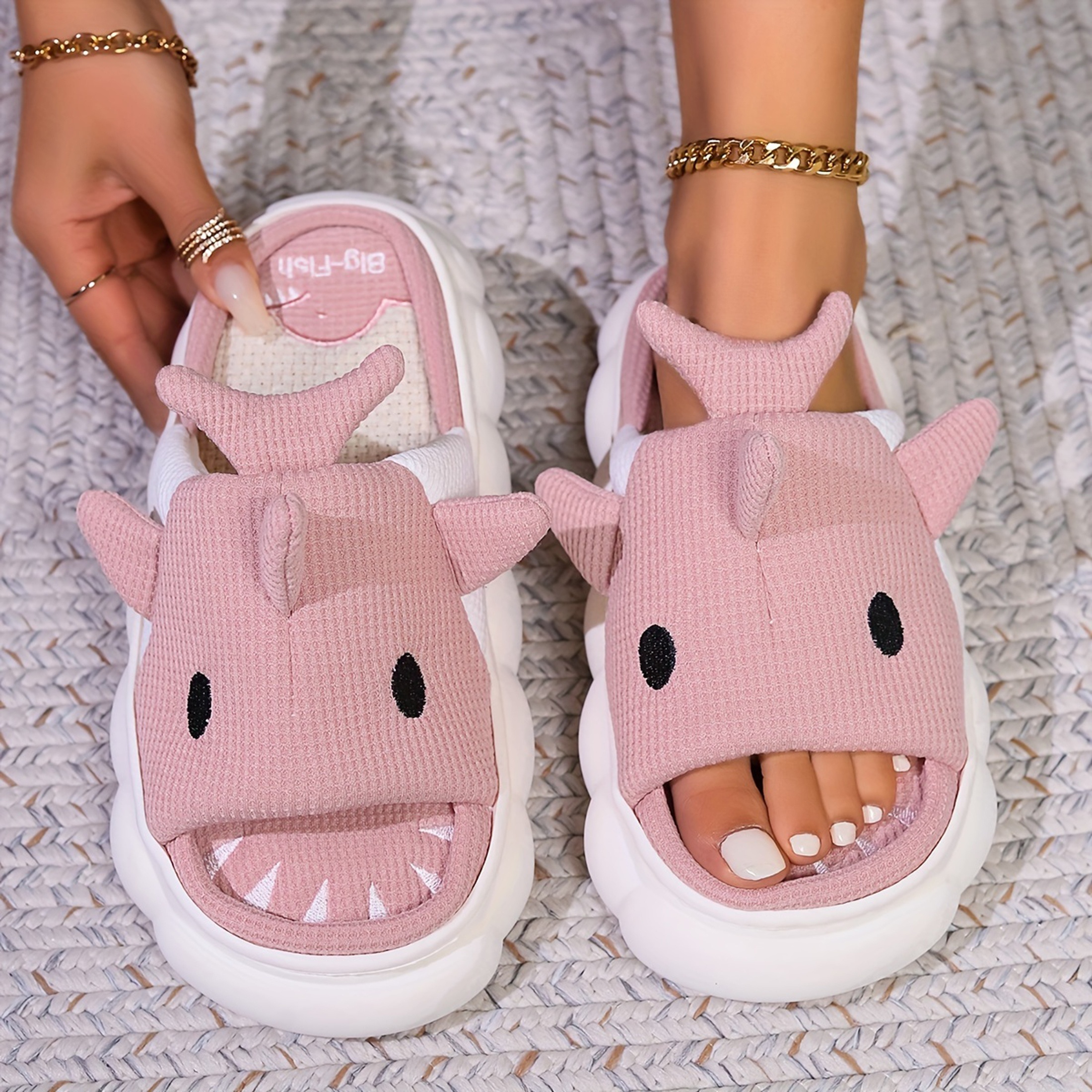 Women's Cartoon Shark Graphic Design Home Slippers With Linen Uppers, Lightweight Slip On Indoor Shoes, Spring Summer And Autumn
