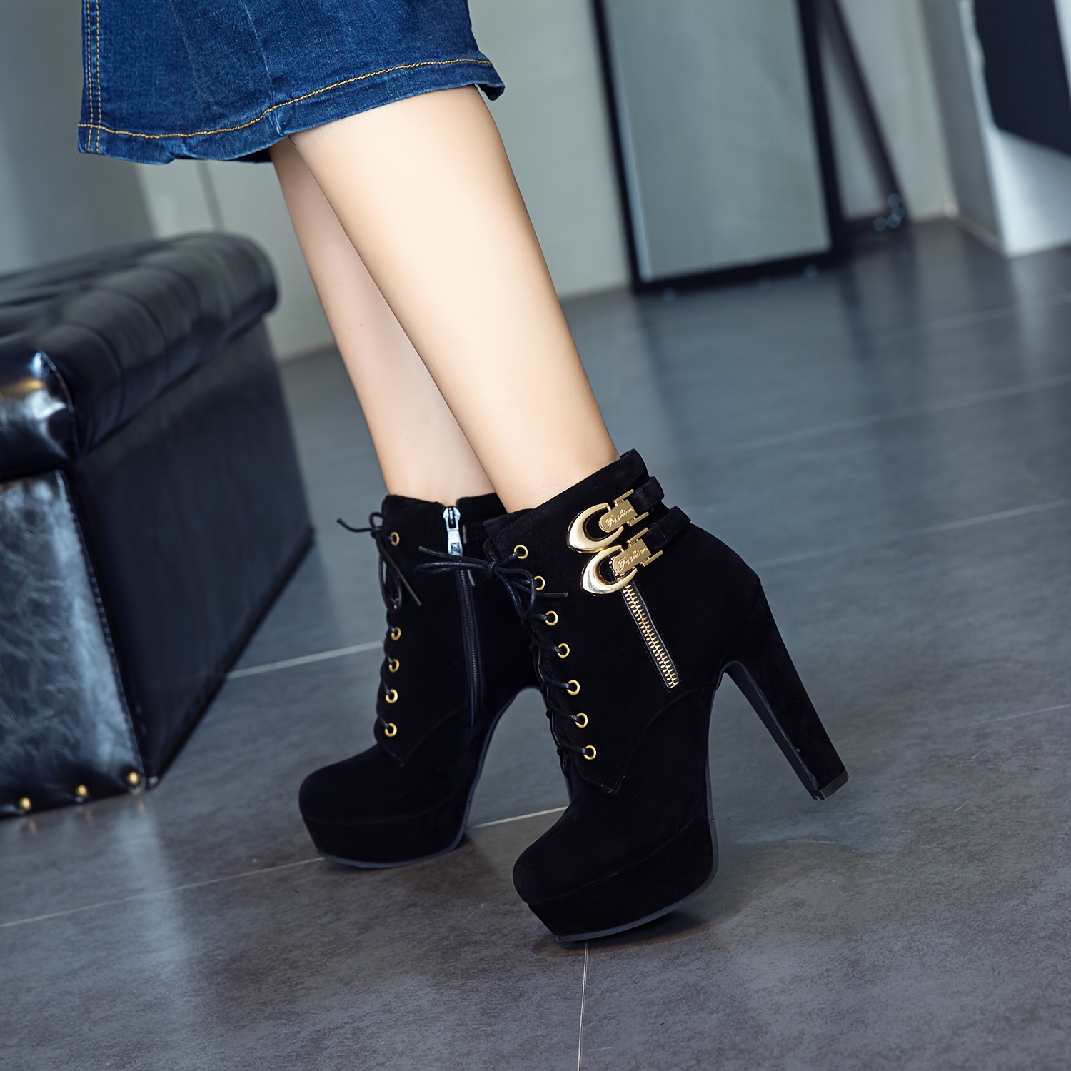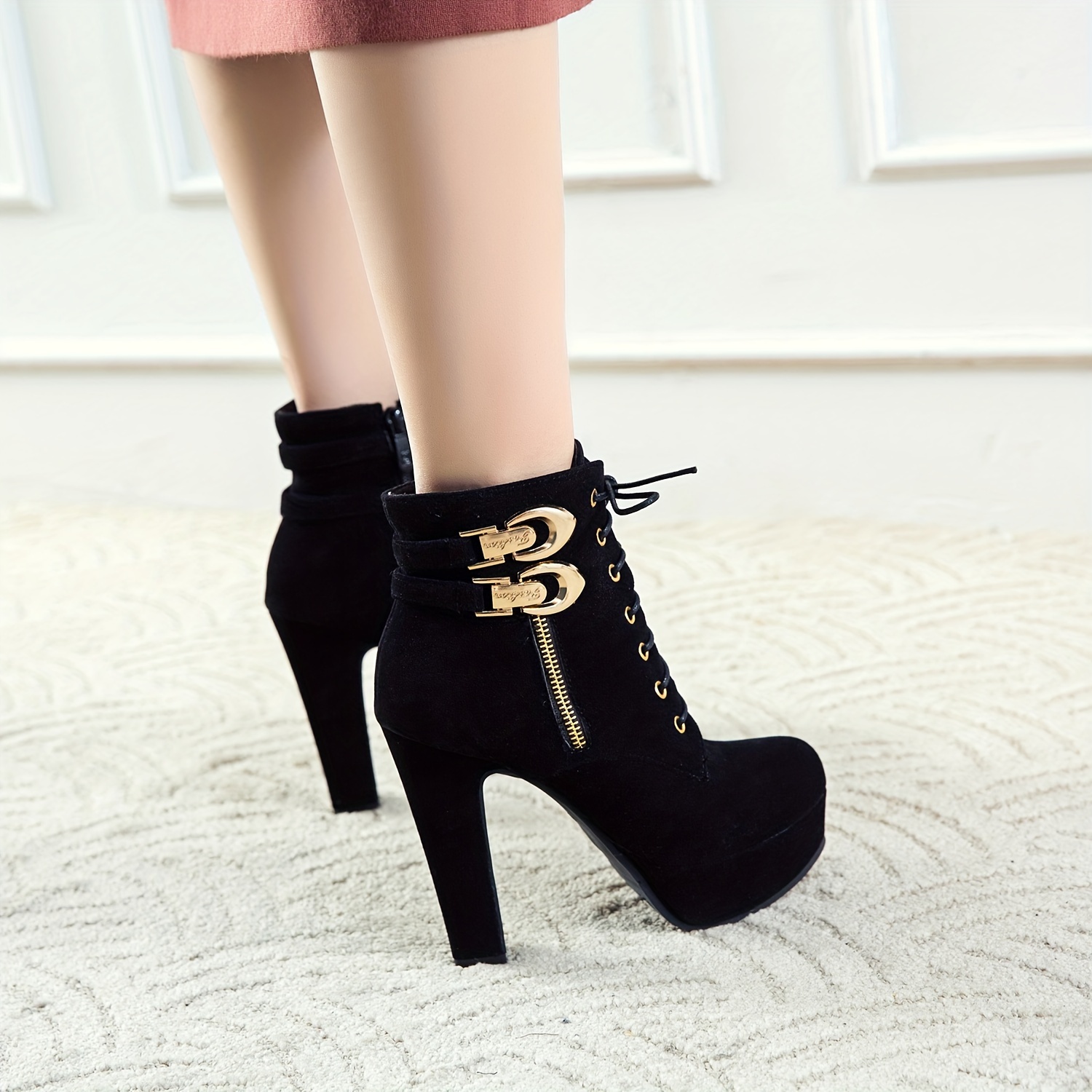 Women's Chunky Platform High Heel Ankle Boots with Lace-Up Front & Back, Golden-Tone Buttons, Zipper Closure, Round Toe - Machine Washable PU Cover Winter Casual Boots, Semiformal Footwear | Adjustable Buckle Heels, High Heel