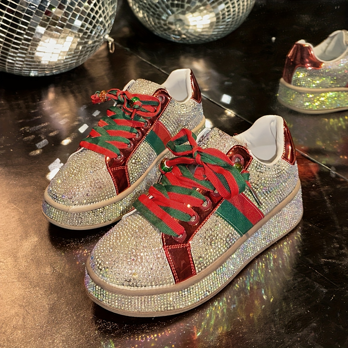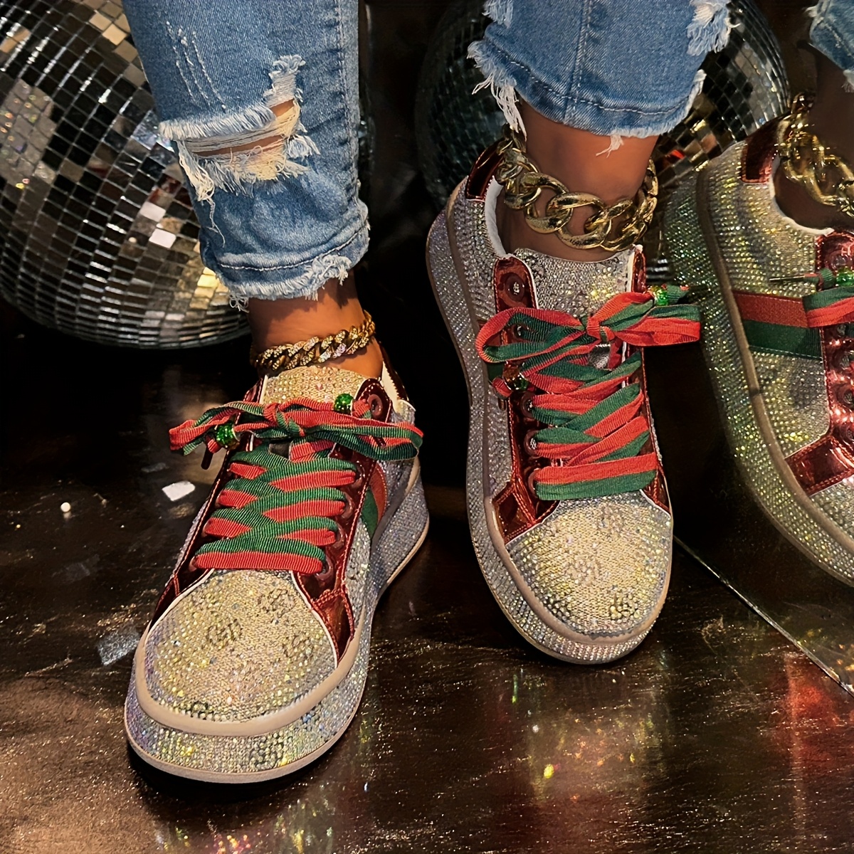 Women'S Fashion Sneakers - Sparkling Glitter Design, Comfortable Low Top Lace-Up Shoes with Red and Green Laces, All-Season Casual Streetwear, Casual Streetwear Sneakers | Glittery Sneakers | Synthetic Sneakers