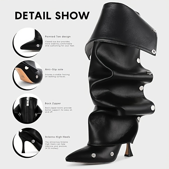 Design: This heel's feature a pointed toe, back zipper closure, and eye-catng Silvery buckles for a touch of modern elegan. The lightweight and flexible design ensures all-day comfort.
