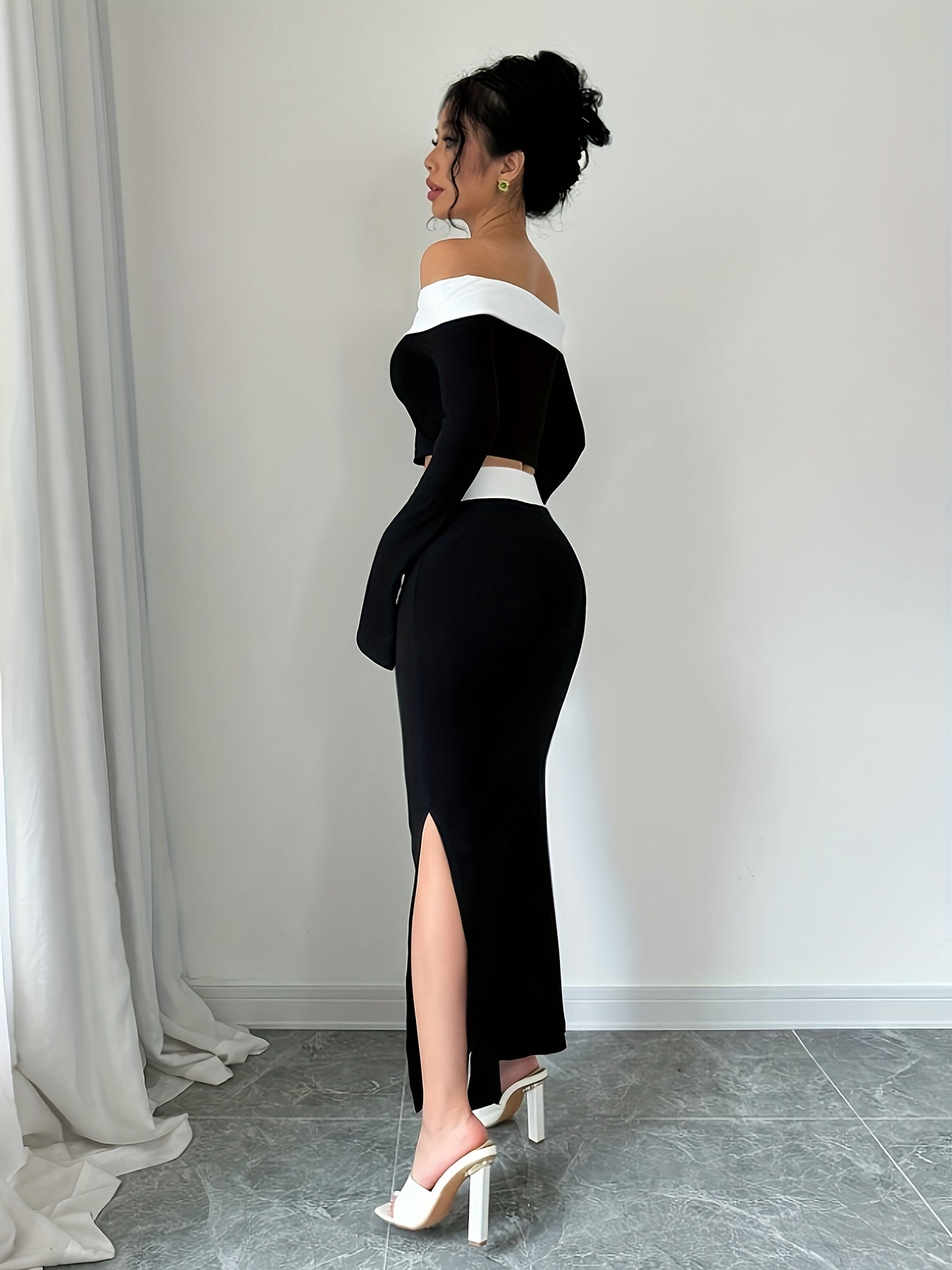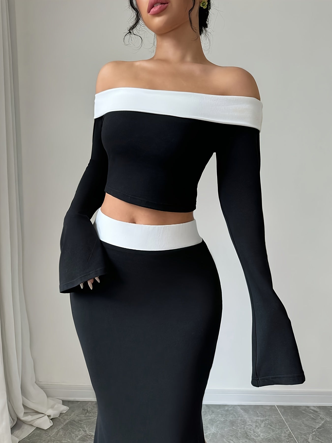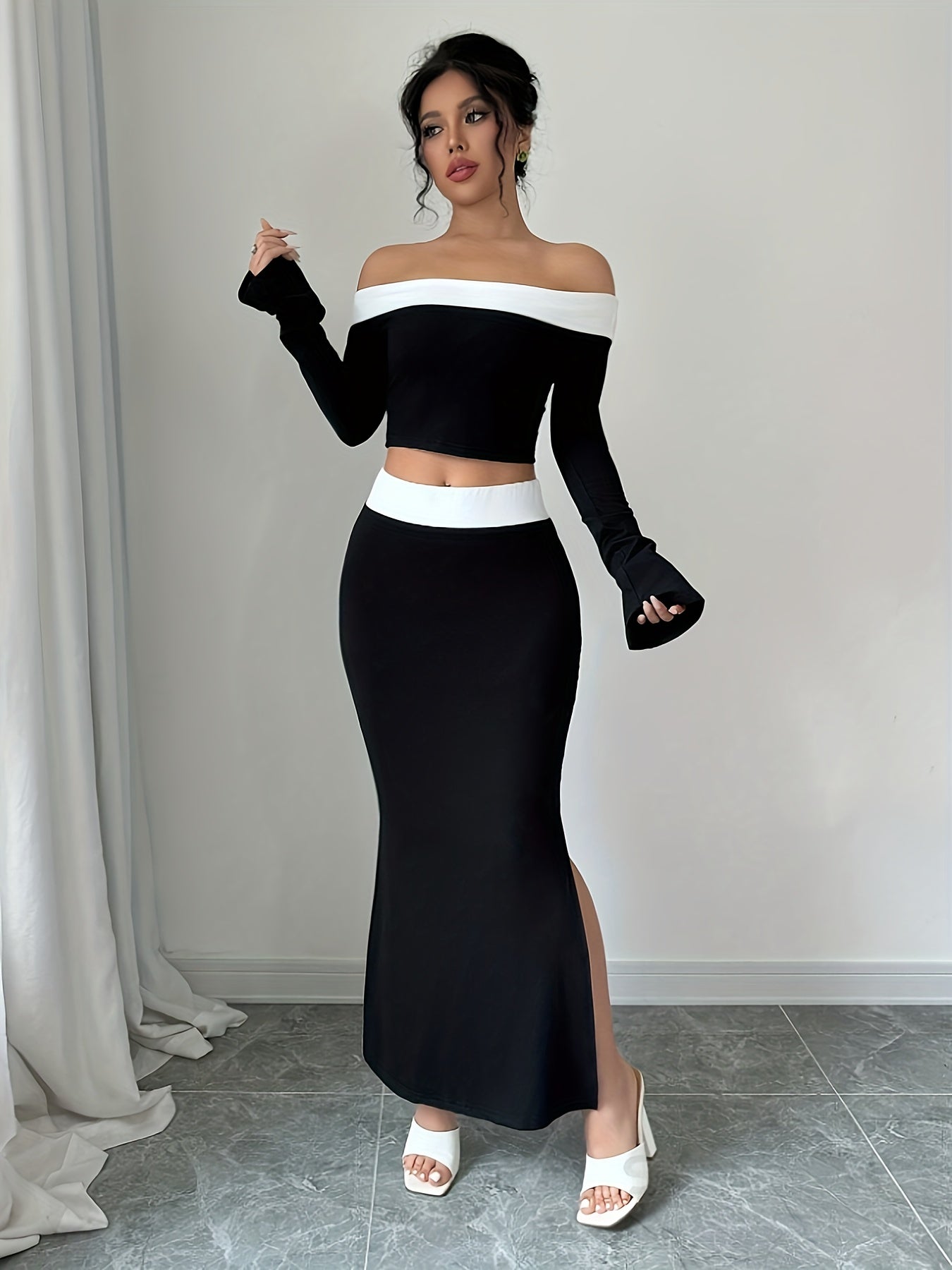 Elegant Off-Shoulder Crop Top & Side-Slit Mermaid Skirt Set - Polyester Blend, Machine Washable