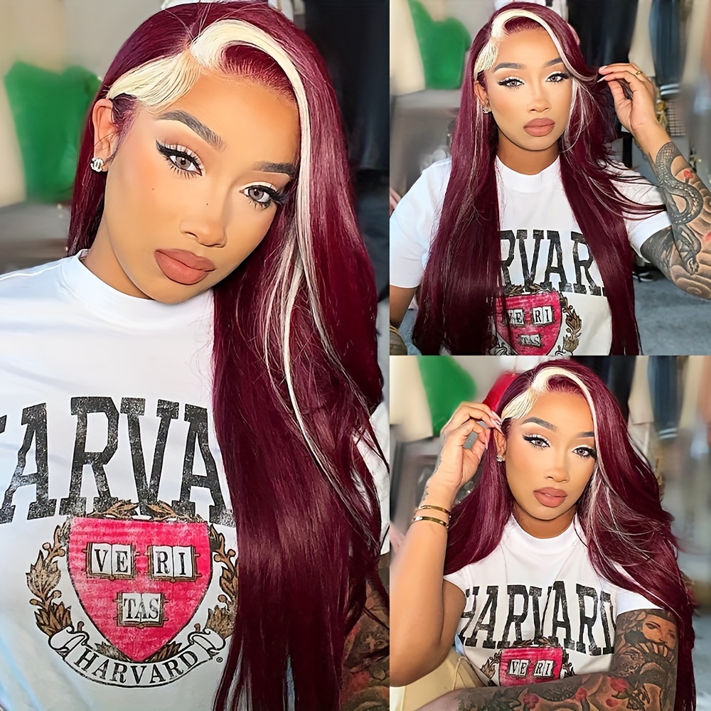 Burgundy Highlight Blonde Lace Front Wig for Women - 13x4 Inch, 26-Inch Silky Straight Synthetic Heat Resistant Fiber, Pre-Plucked Hairline, Glueless Design for Daily & Party Wear, Party Hairpiece | Elegant Hairpiece | Gluele