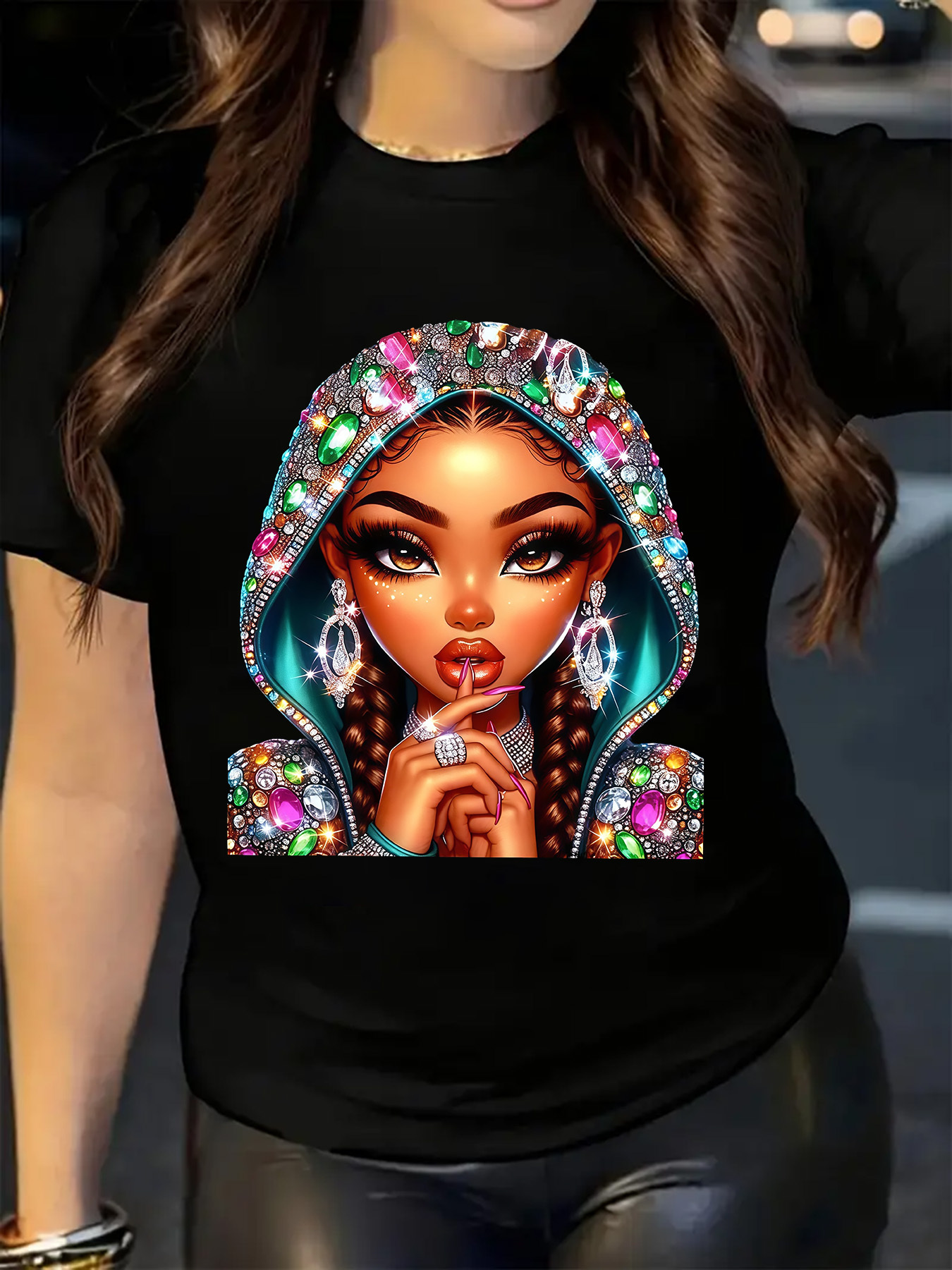 New Spring And Summer Collection Featuring a Sparkling Girl Design with Faux Rhinestone Hat Patterns, Along with a Women'S Printed Short-Sleeve Casual T-Shirt, Perfect for Gifting to Friends in The Spring And Summer.