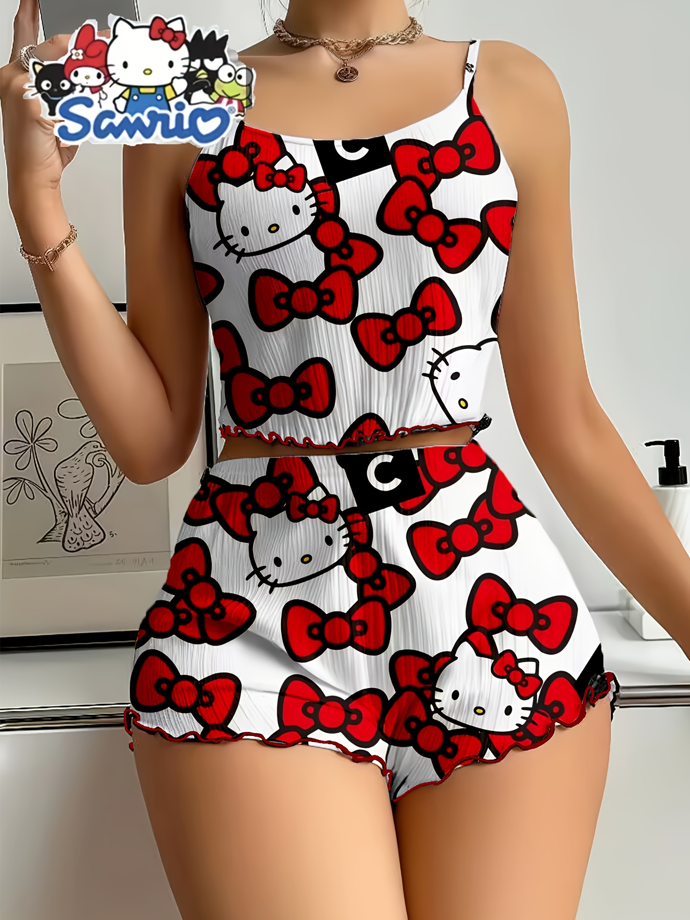 Sanrio for hello kitty Women'S Shorts Set - Elegant Off-Shoulder, Cartoon Print, Polyester Knit Pajamas with Ruffle Detail, All-Season Comfort, Adult Sleepwear, Shorts Set|Playful Print|Polyester Fabric