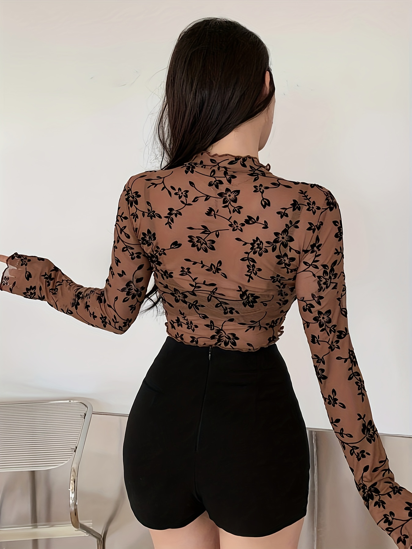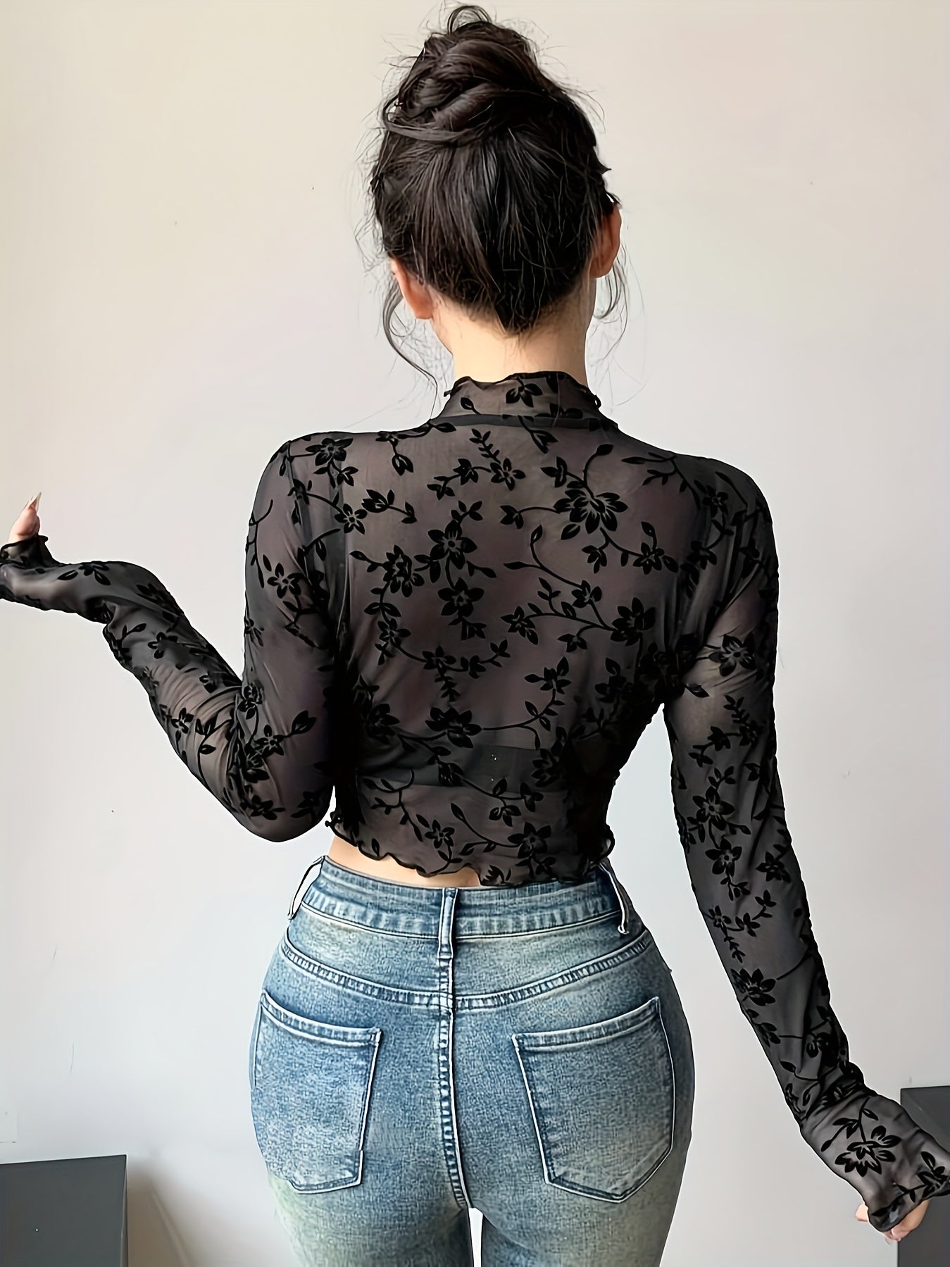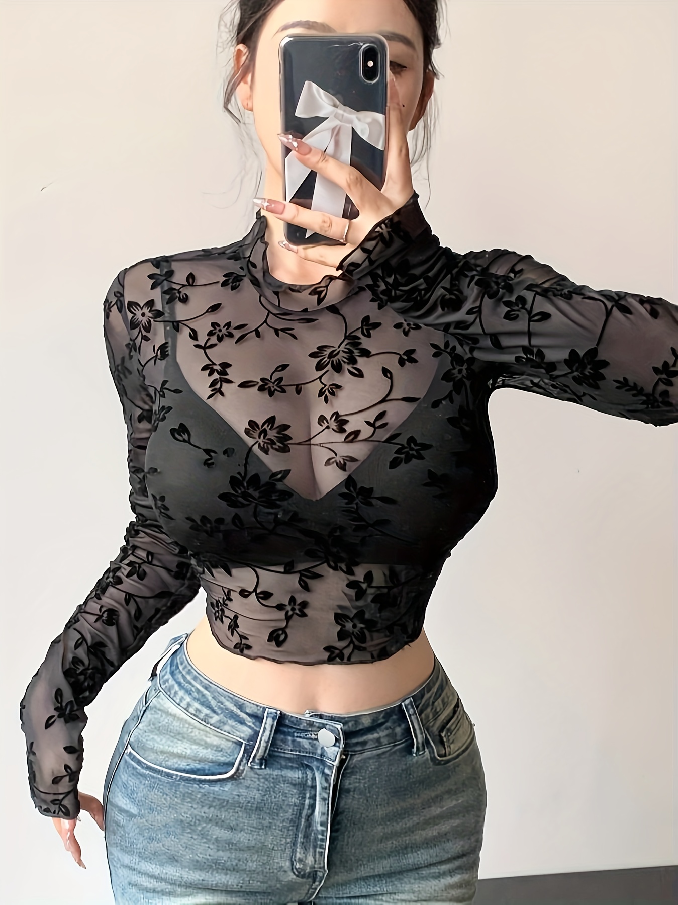 Women's Elegant Floral Lace Long Sleeve Crop Top - Stretchy Mesh T-Shirt with Scalloped Hem, Perfect for Spring & Autumn