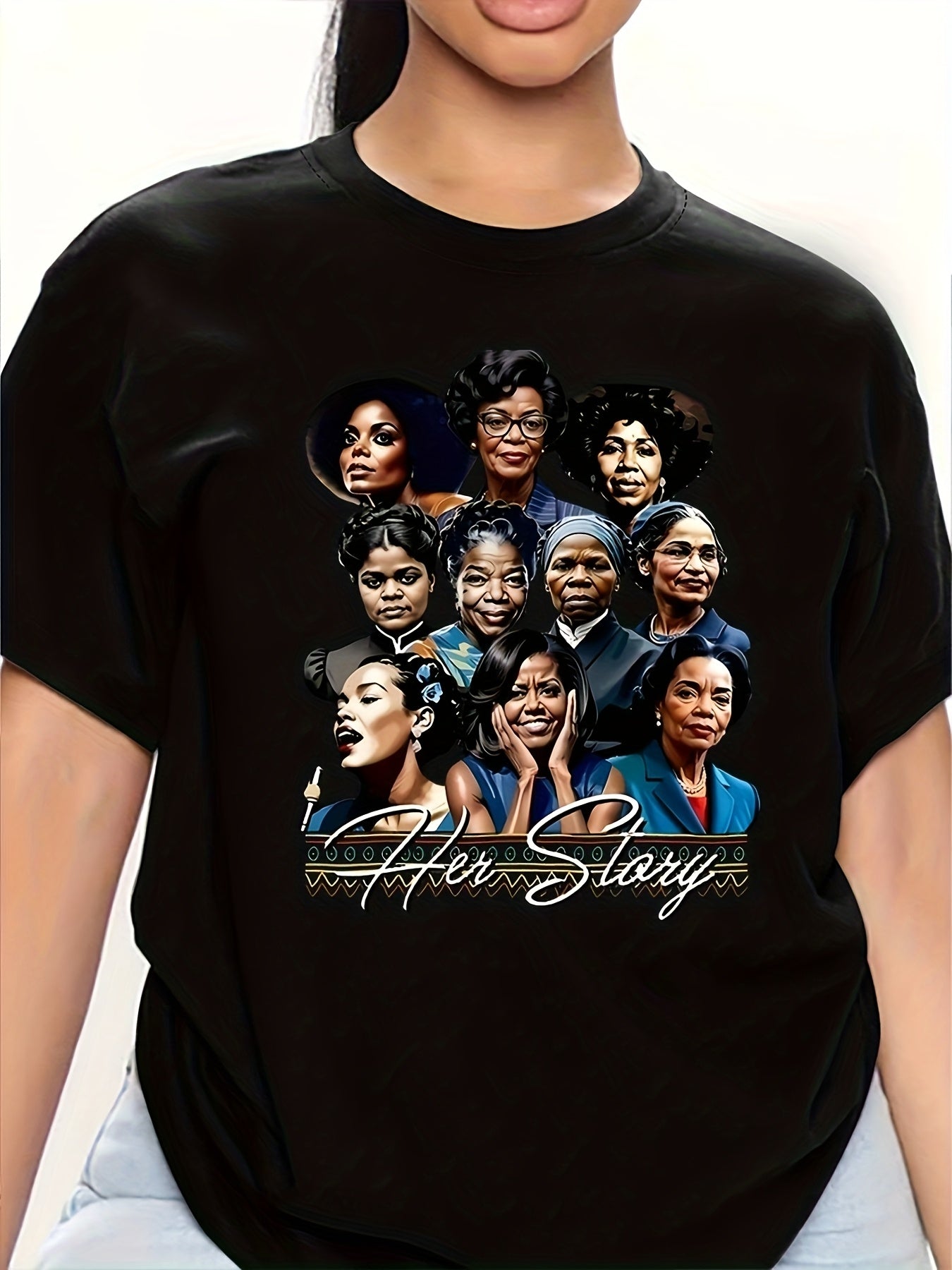 Women's Empowerment Black T-Shirt with "HOT STORY" & Iconic Portraits - Casual Crew Neck, Short Sleeve, Polyester, Machine Washable - Perfect for Spring/Summer, Spring Summer Apparel|Women's Empowerment Theme|Polyester Fabric