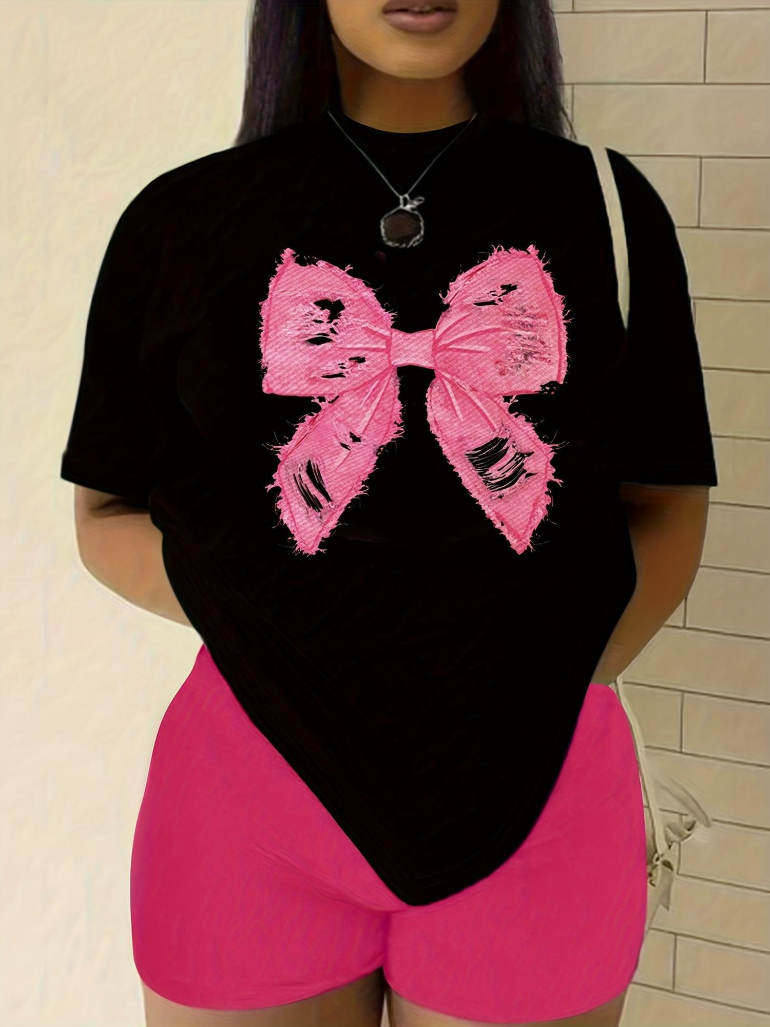Women's Black Crew Neck T-Shirt with Pink Bow Print - Casual Short Sleeve Top for Summer & Spring, Soft and Comfortable Casual Attire, Casual Summer Top | Playful Bow Print | Glossy Fabric, Ladies T Shirts