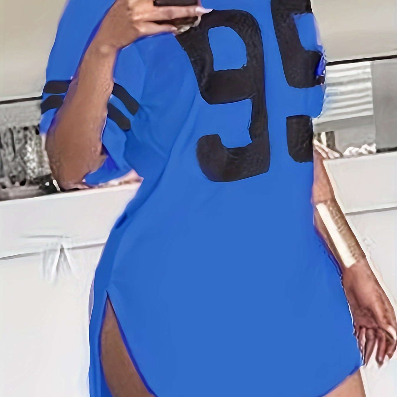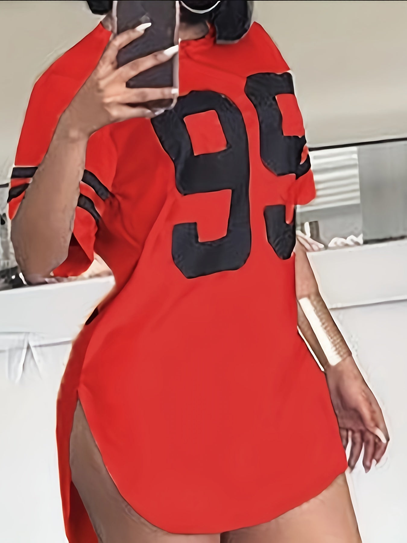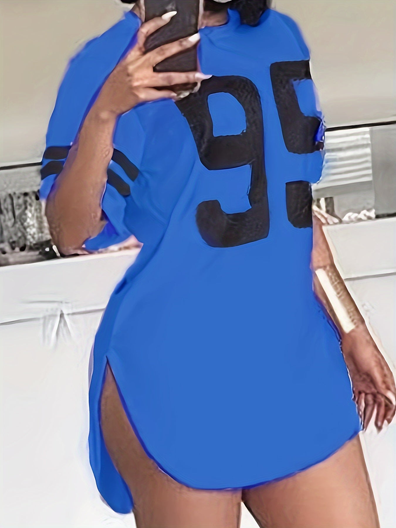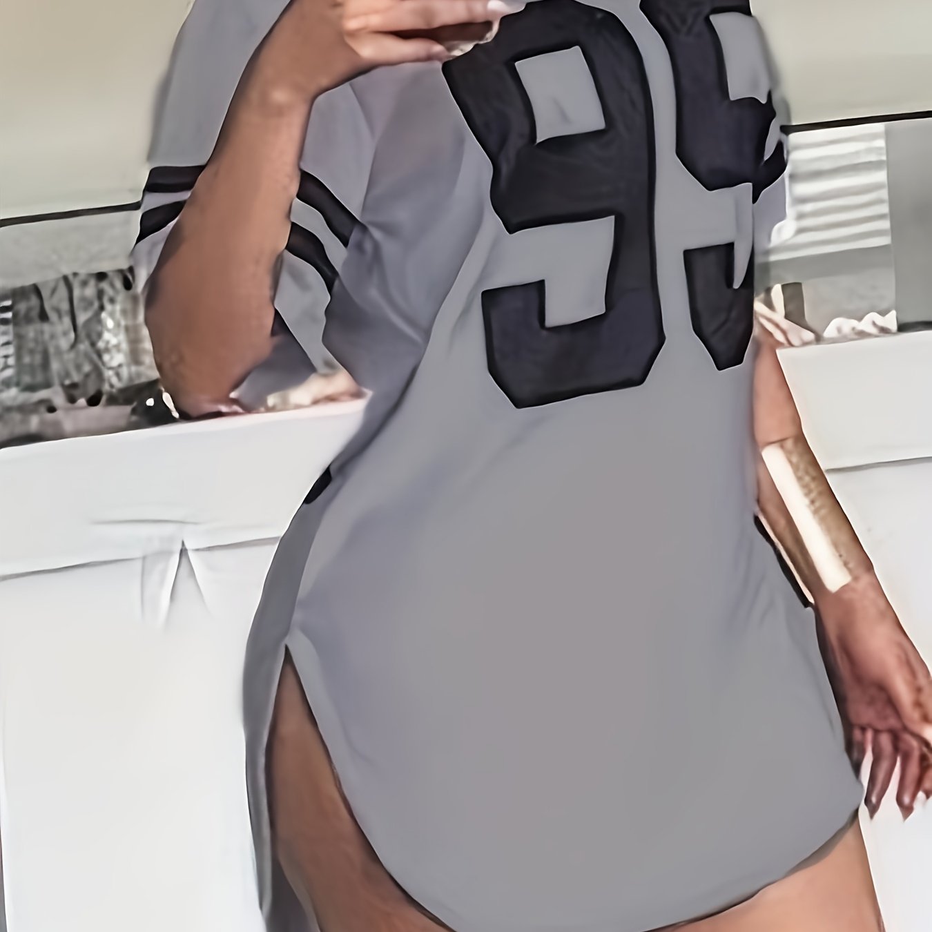 Women'S Plus Size Gray Casual T-Shirt with "95" Print, Loose Fit, Crew Neck, Short Sleeve, Polyester, Knit Fabric, Split Detail, All-Season Wear, Relaxed Fit Tee | Split Hem Detail | Polyester Fabric, Plus Size Blouses