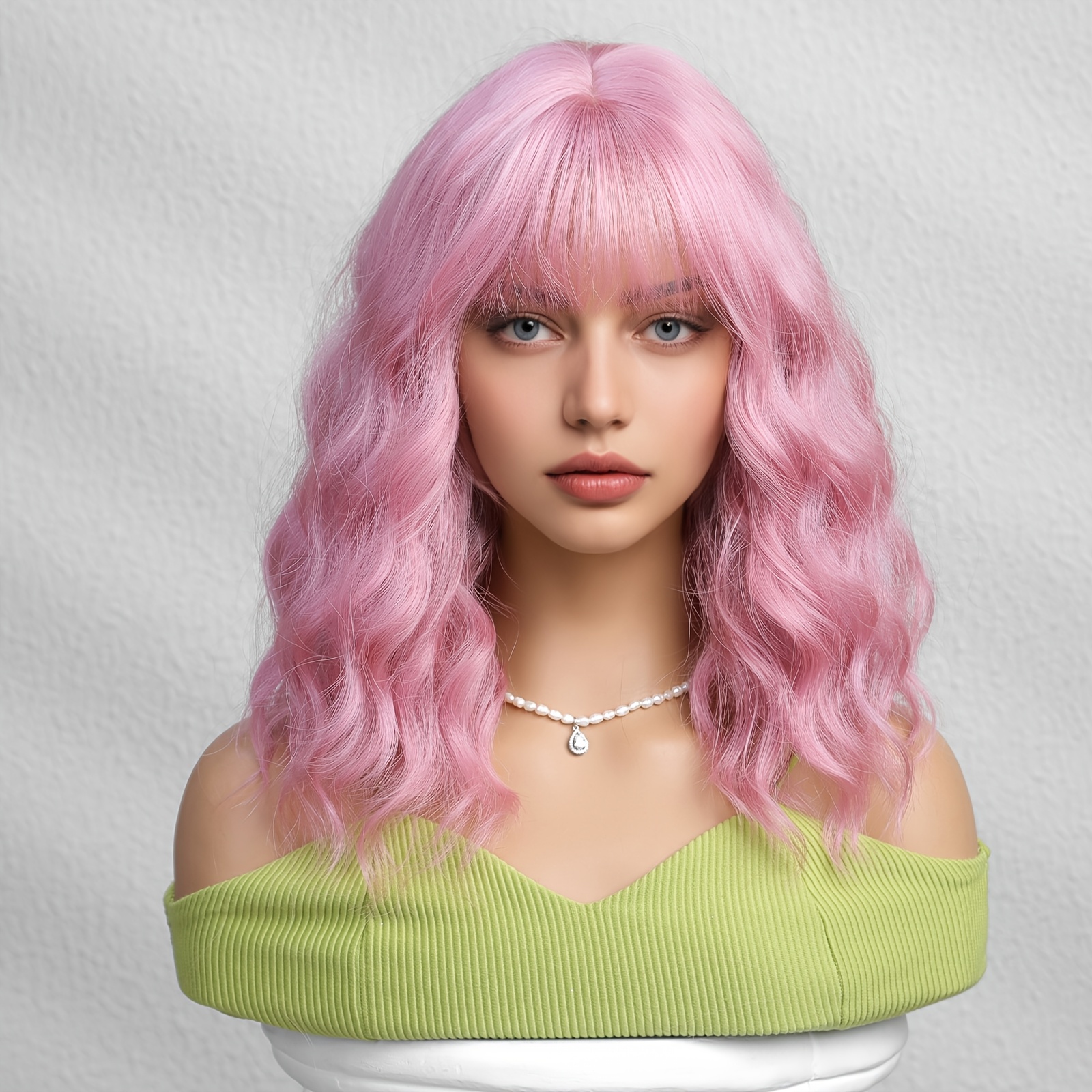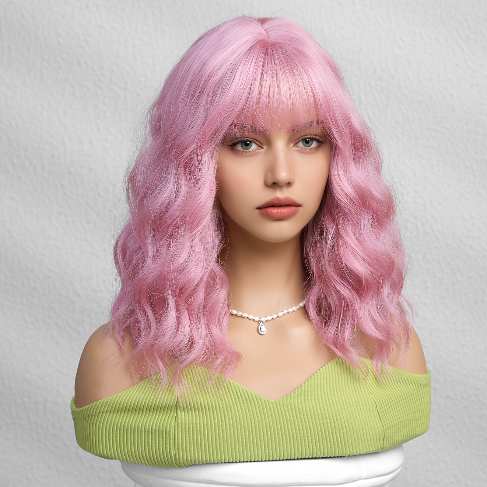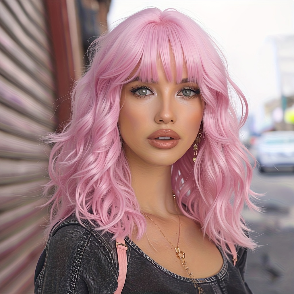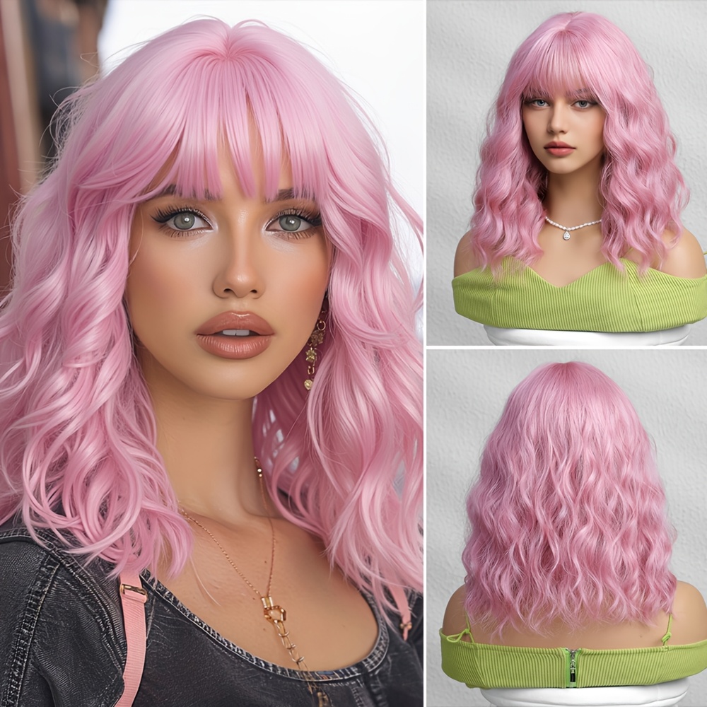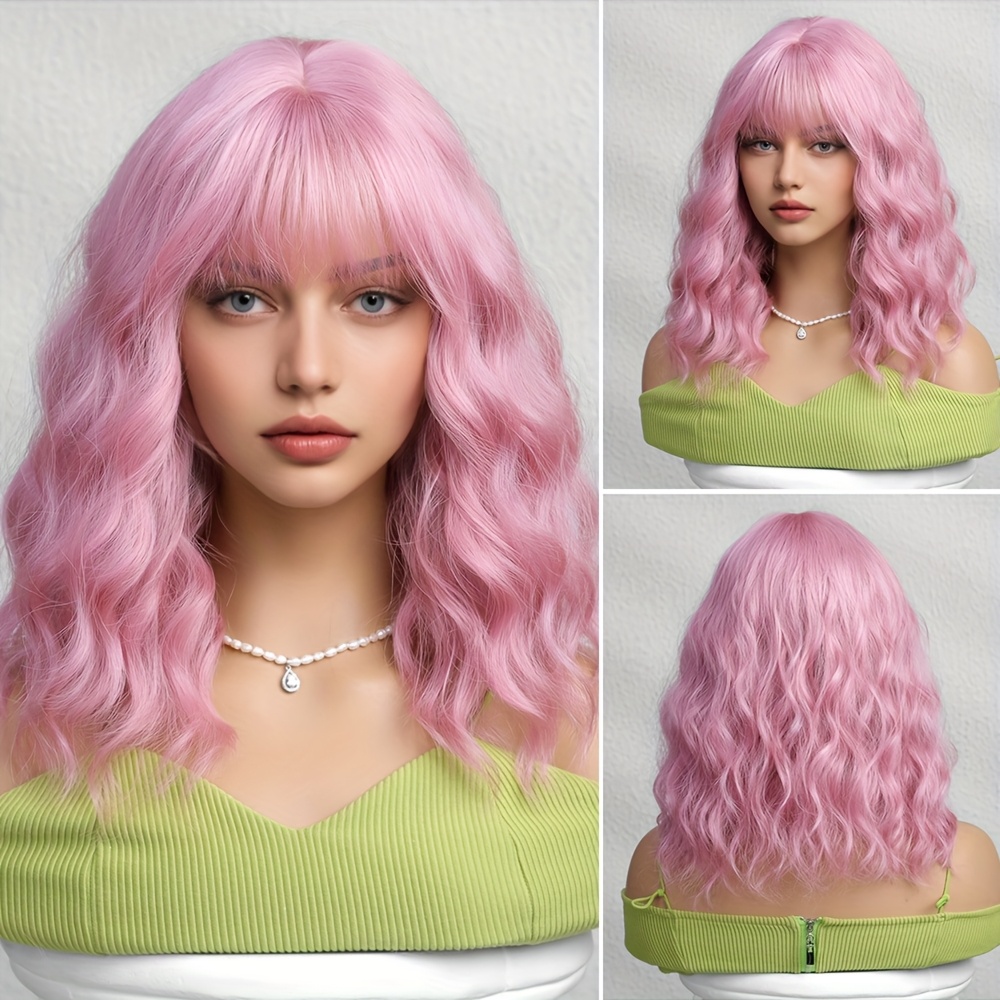 1pc Pink Short Curly Bob Wig with Bangs for Women - Matte Synthetic Hair, Loose Wave Style, 150% Density, Rose Net Cap, Perfect for Casual Attire or Special Occasions