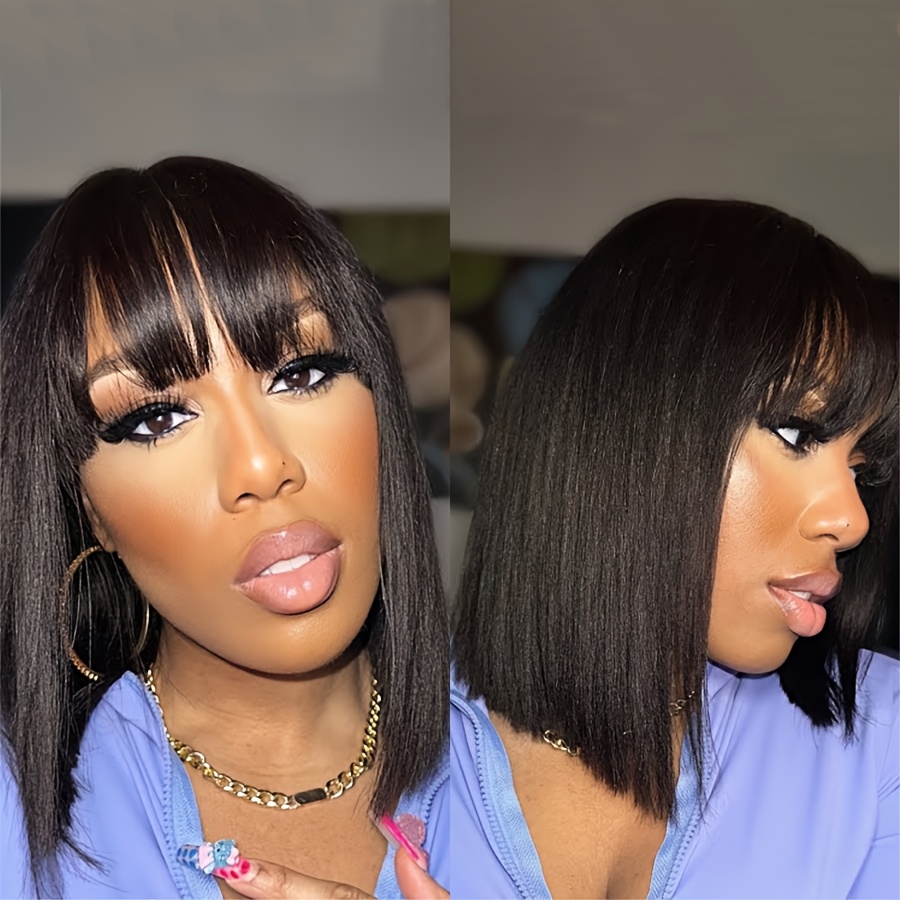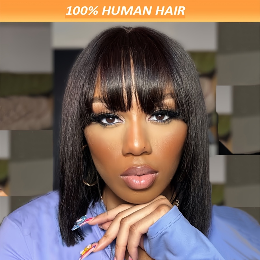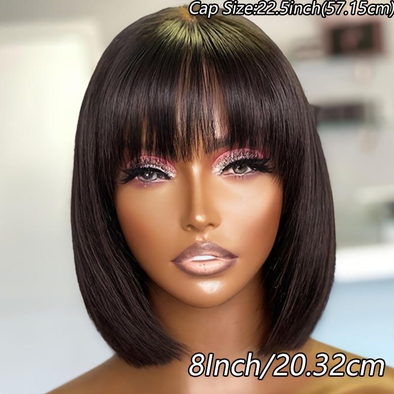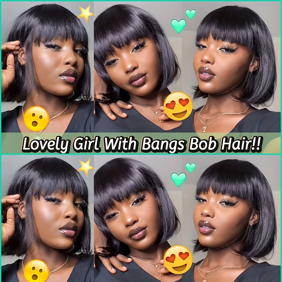 Elegant Straight Brazilian Human Hair Bob Wig with Bangs, Density, Glueless Short Wigs for Women, Rose Net Cap, Natural Look, Straight Hair, Human Hair, with Fring