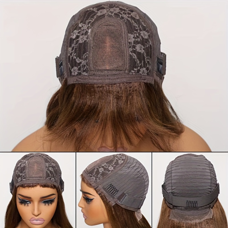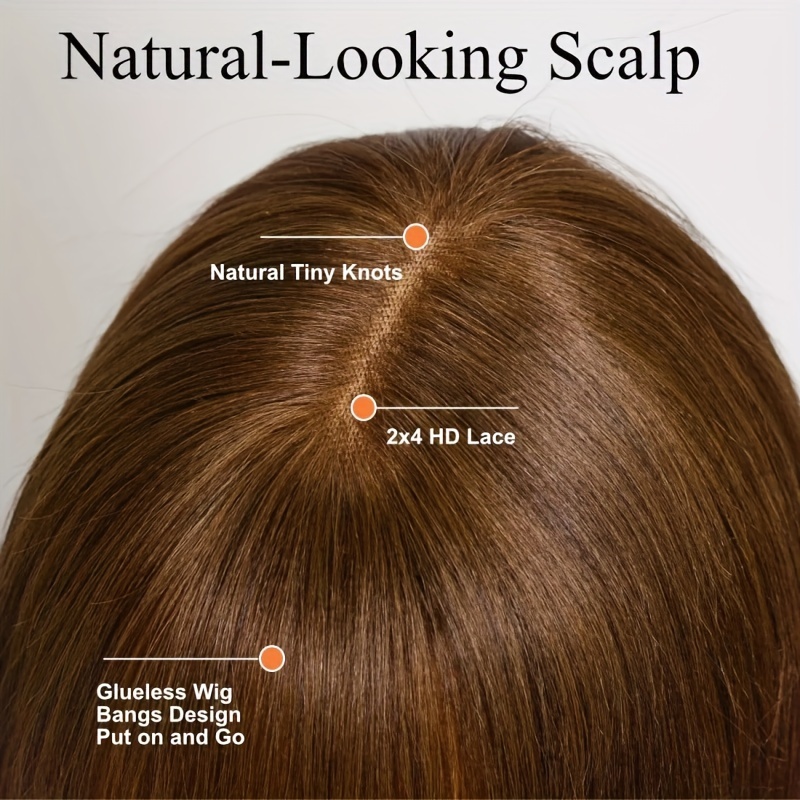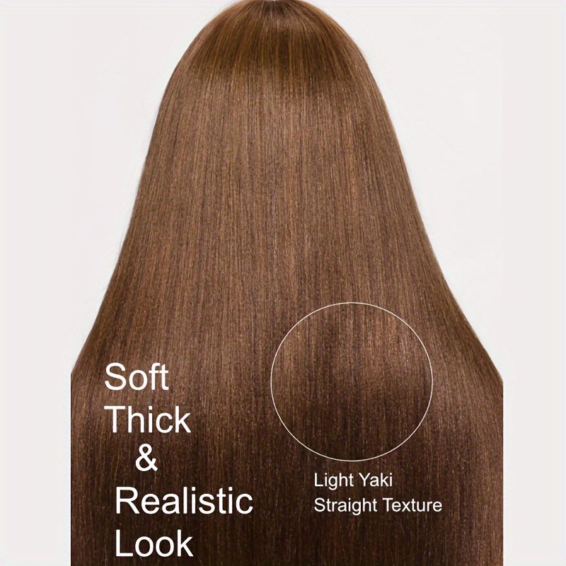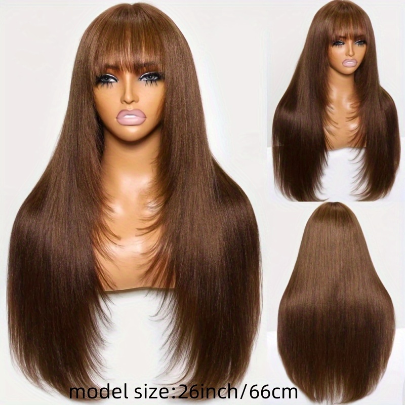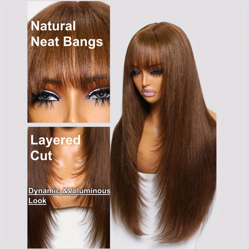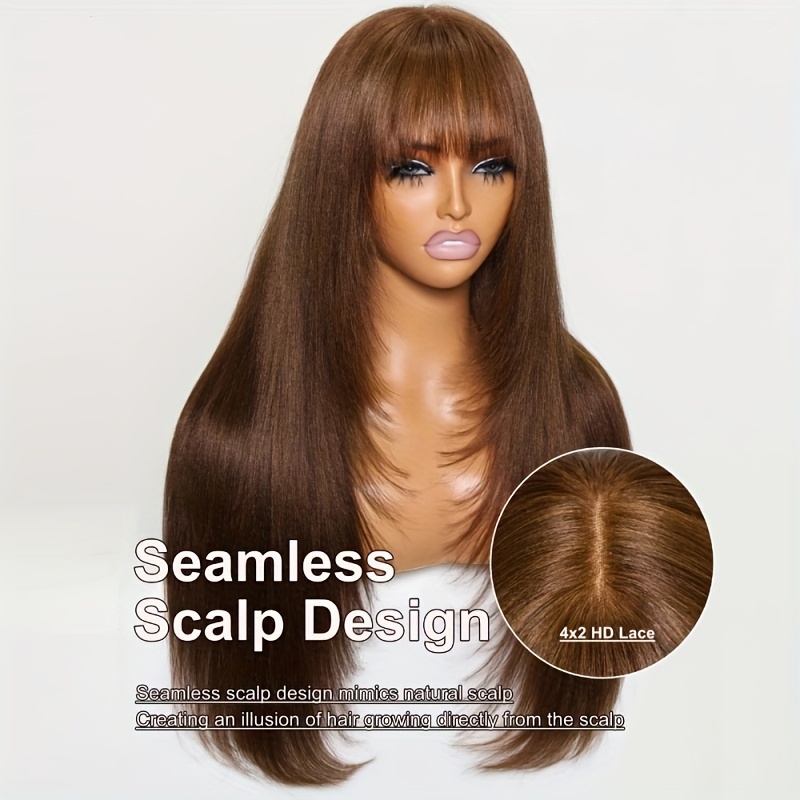 KLAIYI #4 Brown Yaki Straight Human Hair Wig with Bangs & Layered Cut - 100% Brazilian Virgin Human Hair, 150% Density Glueless HD Lace Front, Middle Part, 22.5" Cap Size, Tangle-Free, No Shedding, Air-Dry Friendly for Women