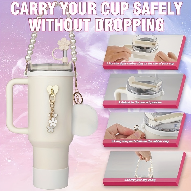 Exquisite 7-piece cup accessory set of 40 ounces: Our cup accessory set includes silicone straw cap, pearl chain, rubber cup ring, keychain, bottle boots, heart-shaped keychain, and heart-shaped hook, stylish and of excellent quality.