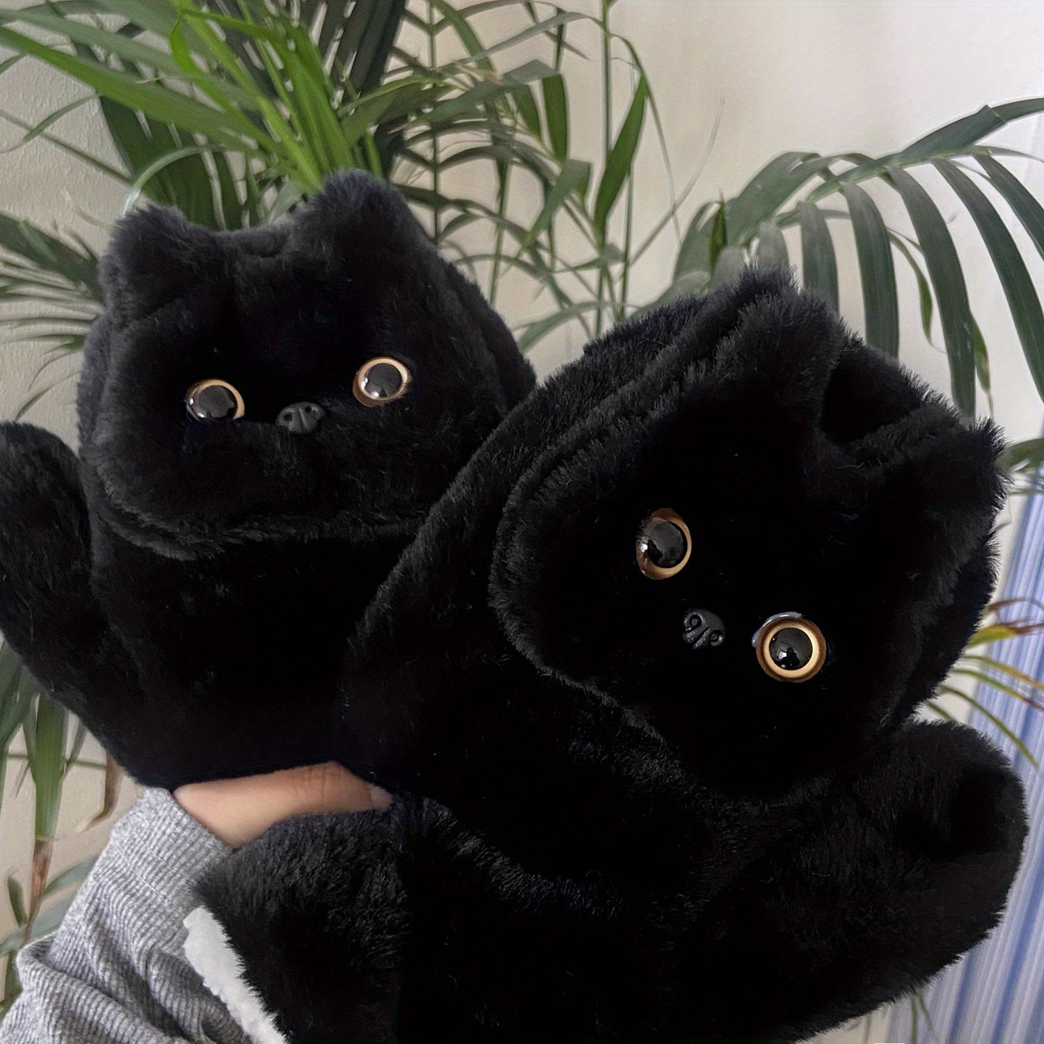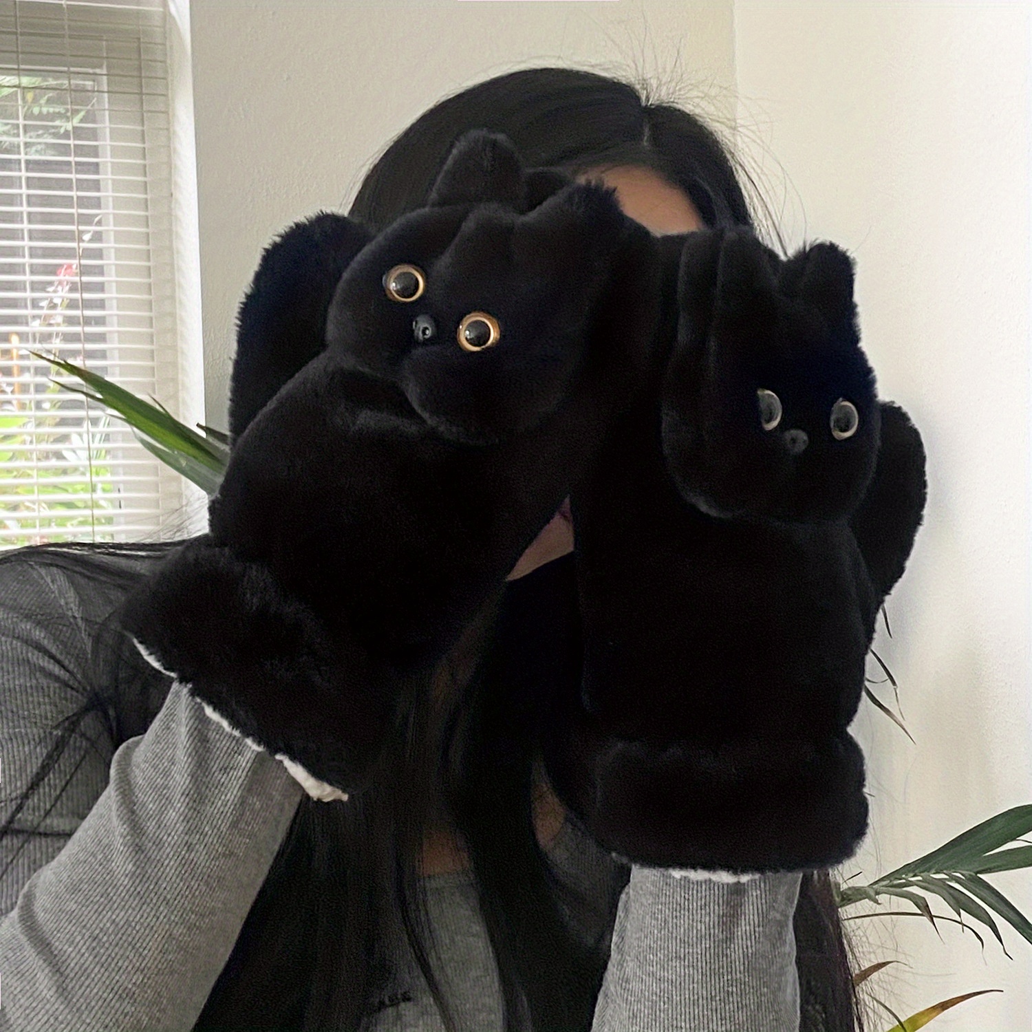 Charming Black Cat Plush Gloves for Women - Cozy & Warm Winter Accessory with Detachable Drawstring, Perfect for Casual Outings and Cycling