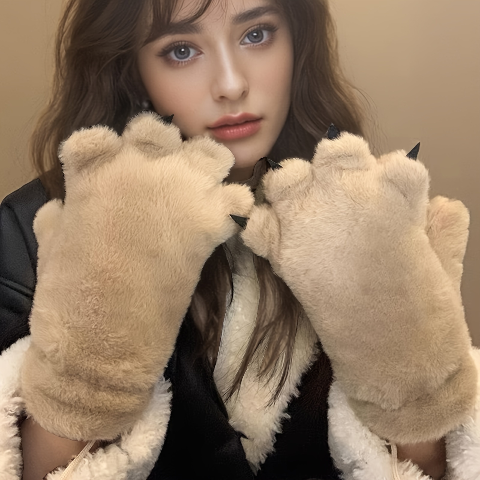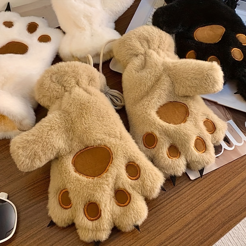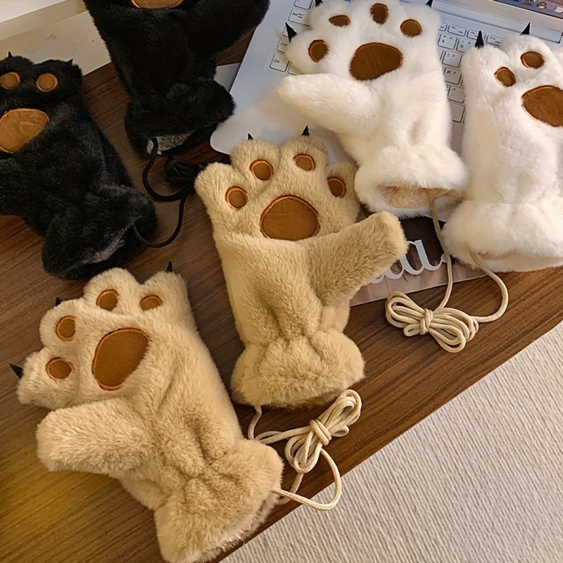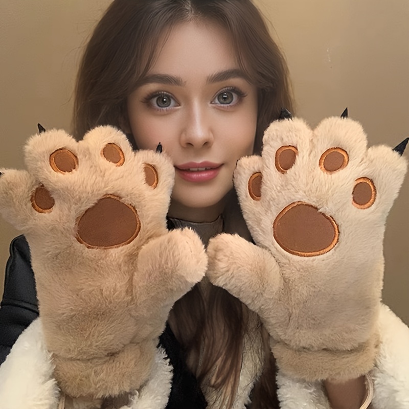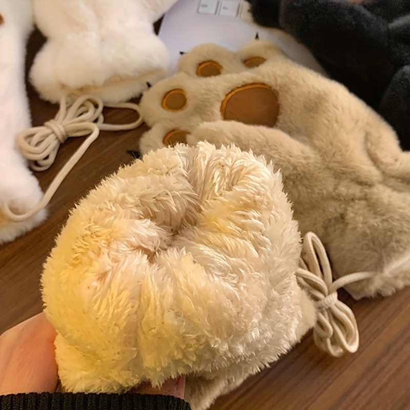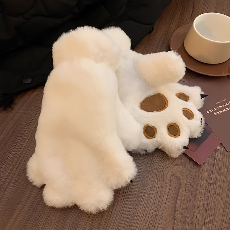 Cozy Cat Paw Plush Mittens - Ultra-Warm, Windproof Thick Fleece Gloves with Cute Animal Design for Cycling, Skiing & Outdoor Activities, White with Brown Accents