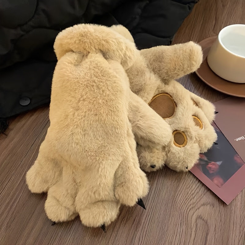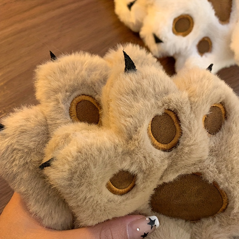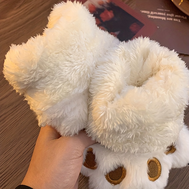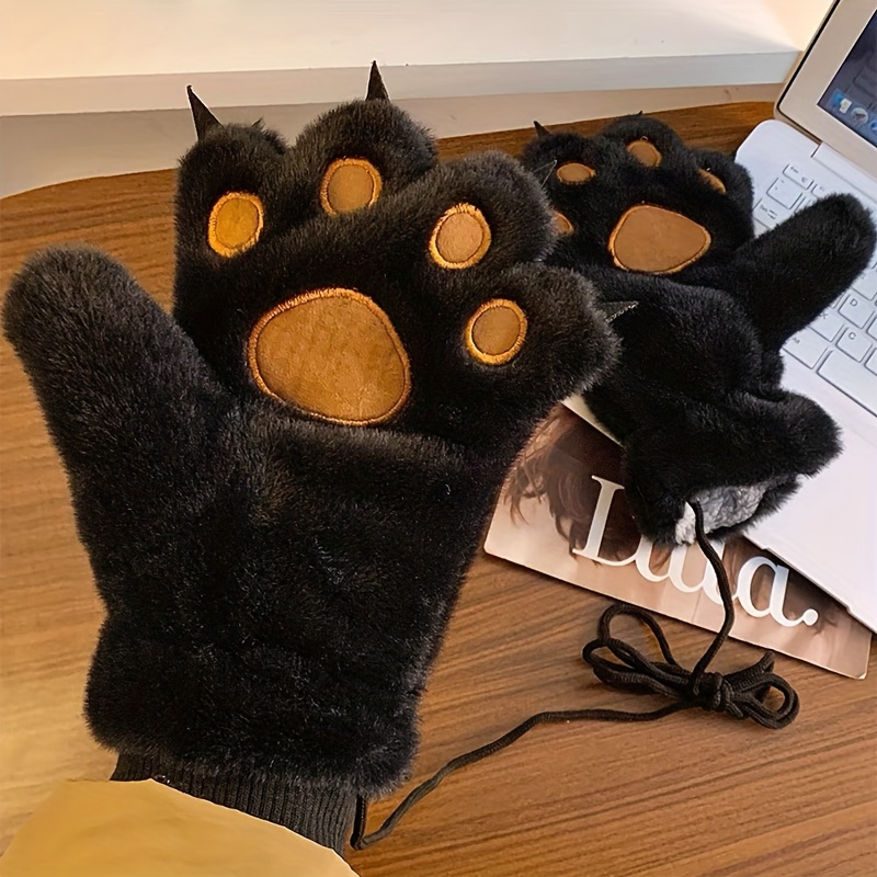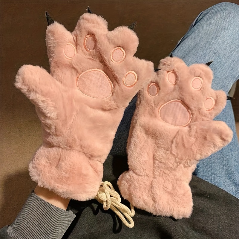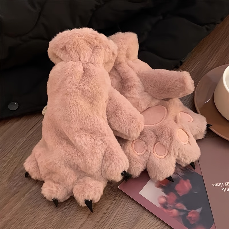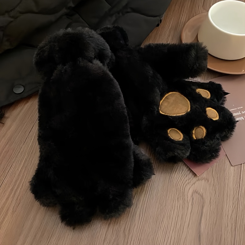 Cozy Cat Paw Plush Mittens - Ultra-Warm, Windproof Thick Fleece Gloves with Cute Animal Design for Cycling, Skiing & Outdoor Activities, White with Brown Accents