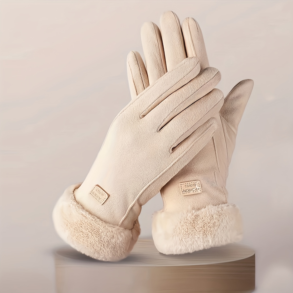 Women'S Beige Touchscreen Gloves - Thick Warm Plush Lined Full Finger Mittens for Winter, Knitted Polyester, Non-Stretch, Hand Washable, Ideal for Going Out