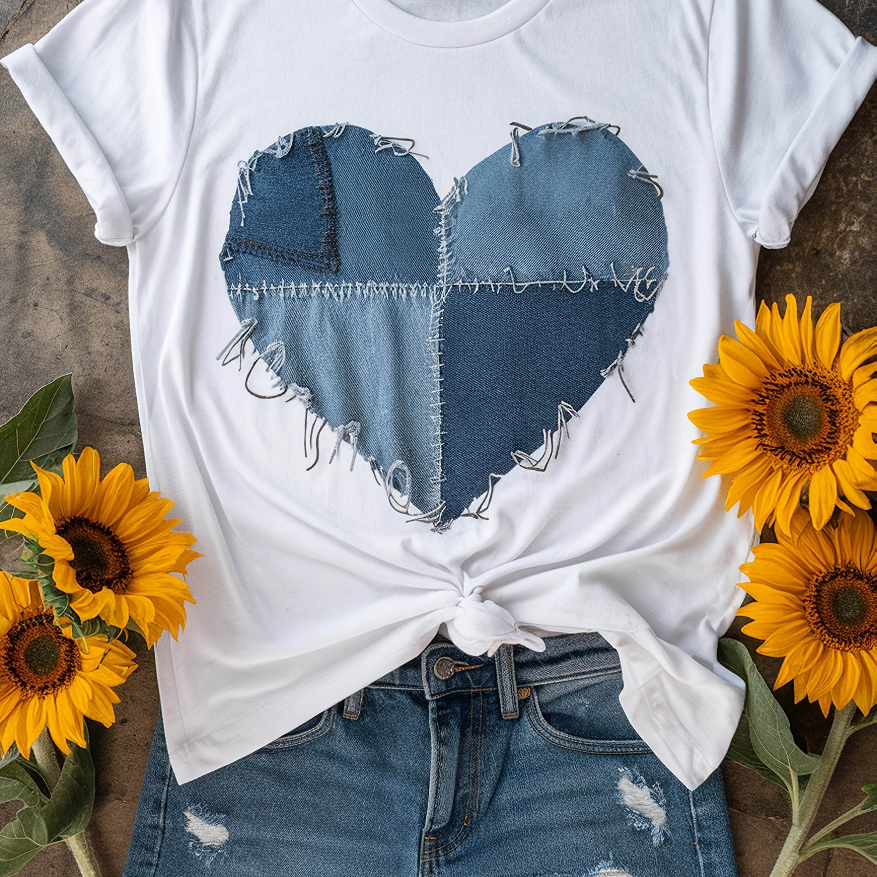 Women's Soft Heart Print T-Shirt - Casual Crew Neck Short Sleeve Top with Denim-Like Patchwork Design, Perfect for Valentine's Day or Casual Attire, Ladies T Shirts