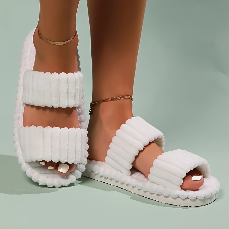 Elegant Women's Plush Slippers with Warm Lining - Striped Open Toe, Non-Slip EVA Sole, Cozy Indoor Comfort