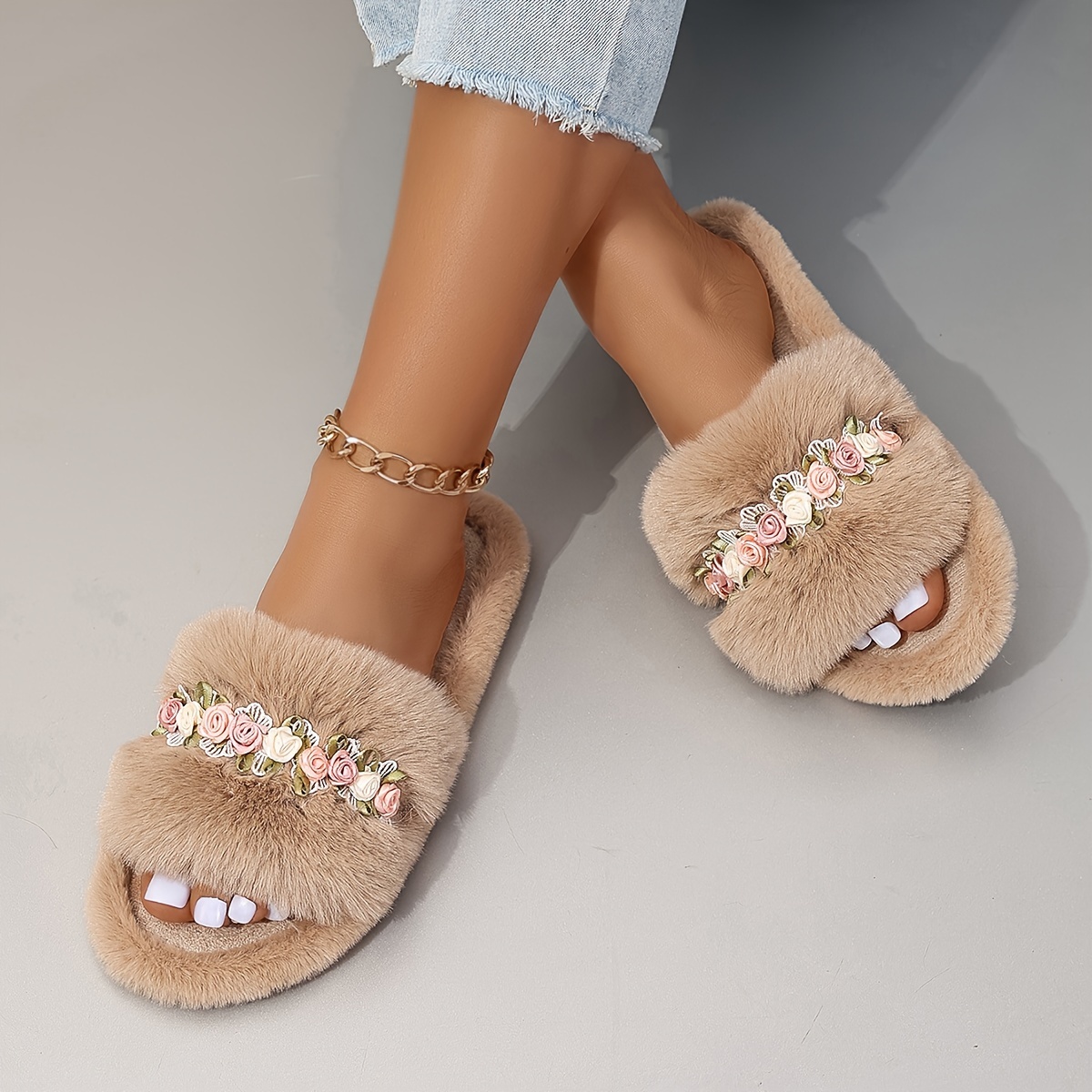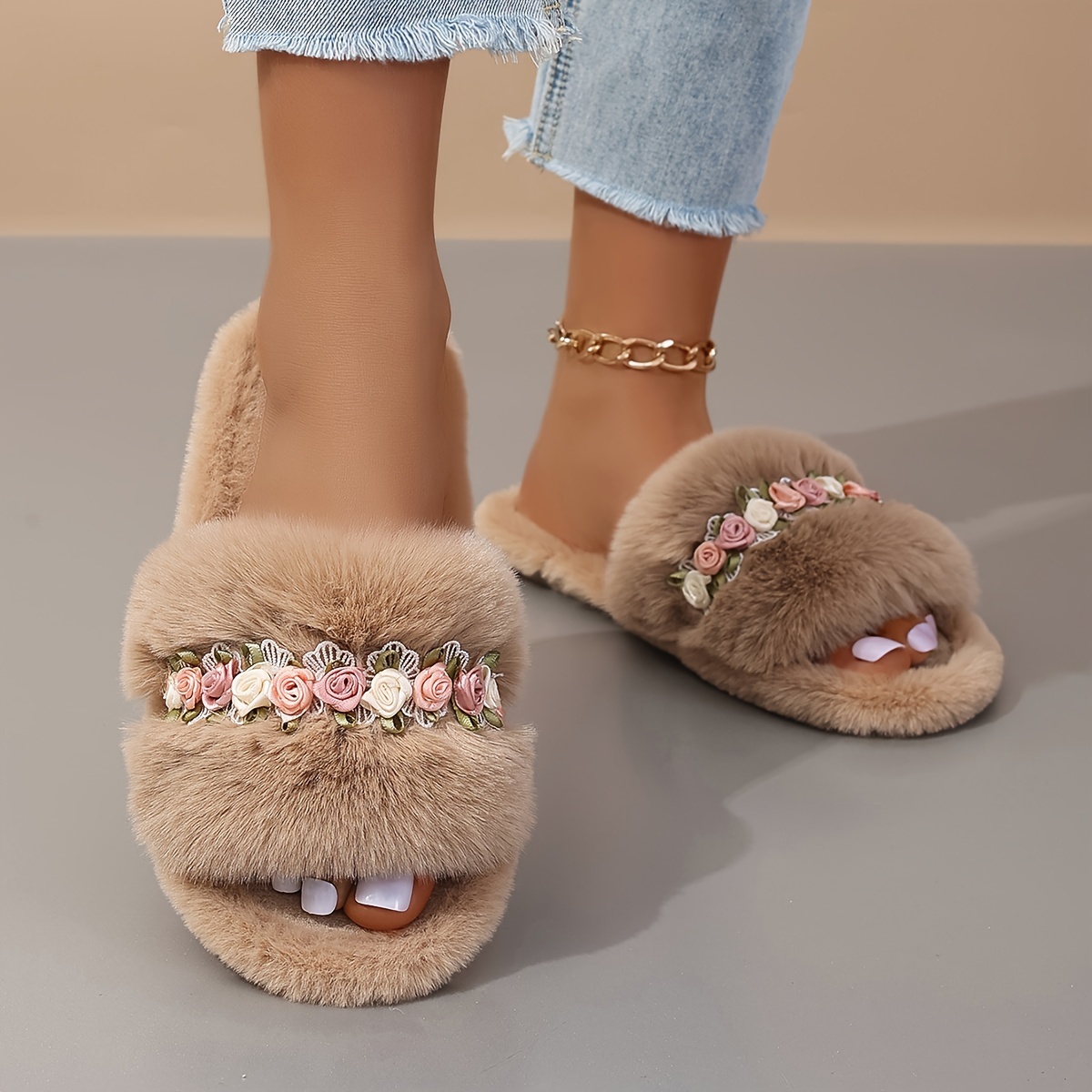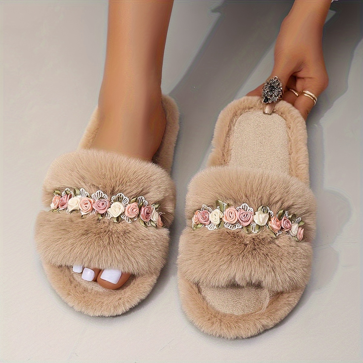 Flower Decor Fluffy Slippers, Casual Open Toe Plush Shoes, Comfortable Indoor Home Slippers
