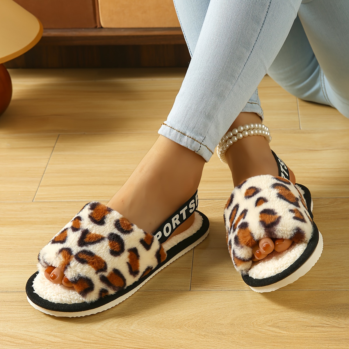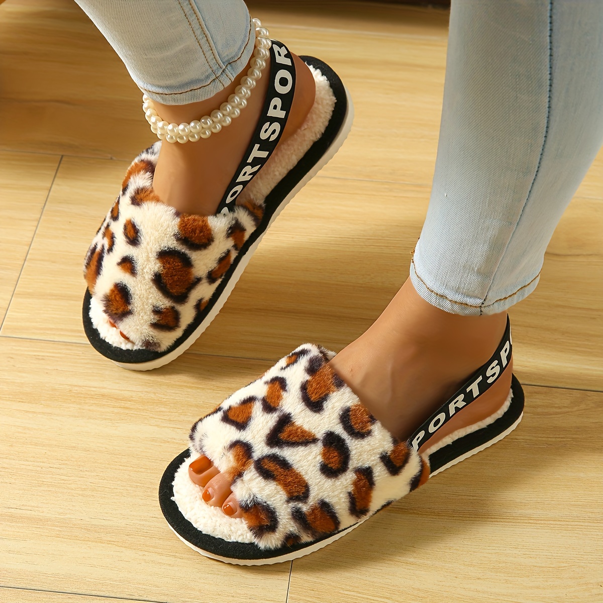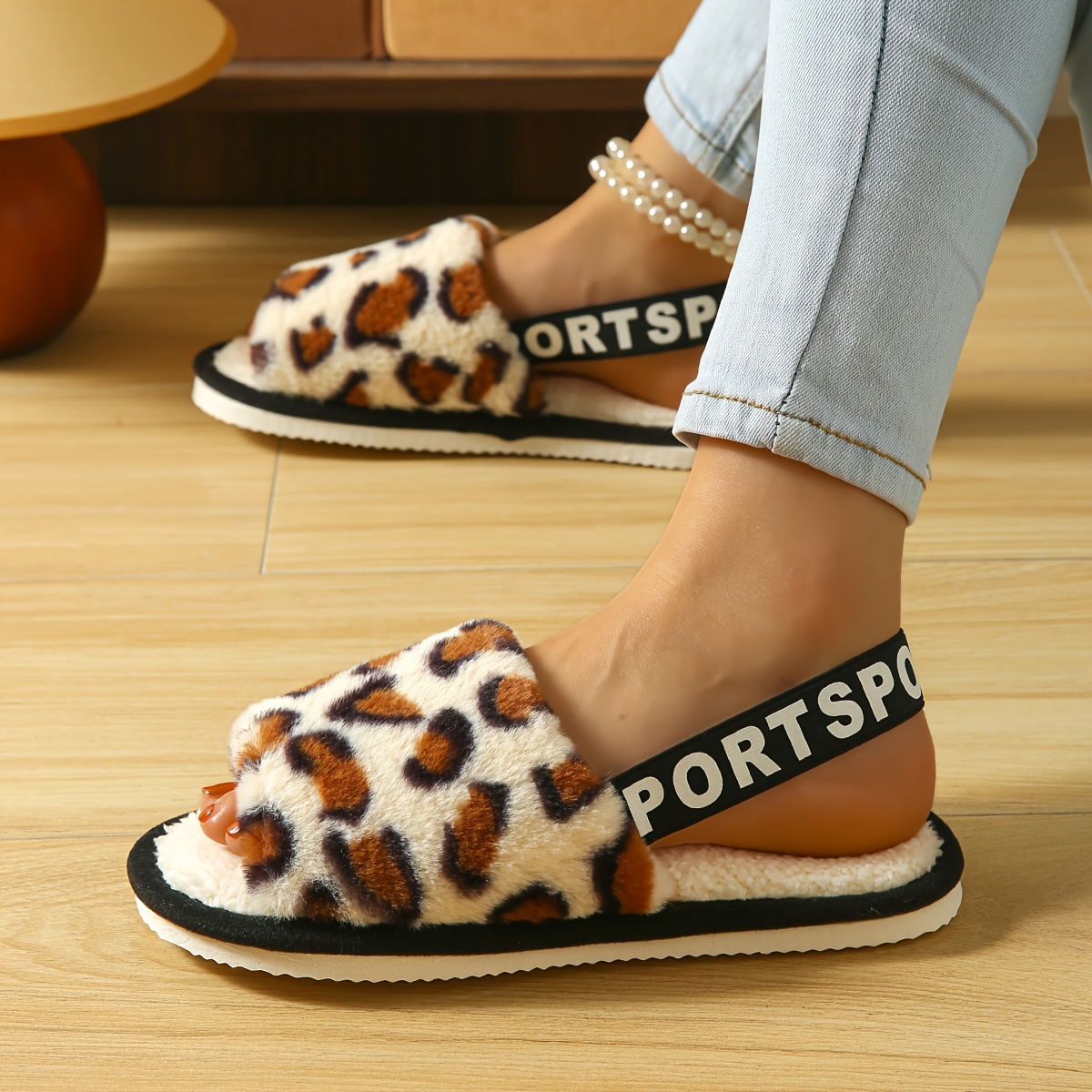 Fluffy Leopard Home Warm Slippers, Letter Elastic Strap Soft Sole Bedroom Shoes, Non-slip Floor Mute Shoes