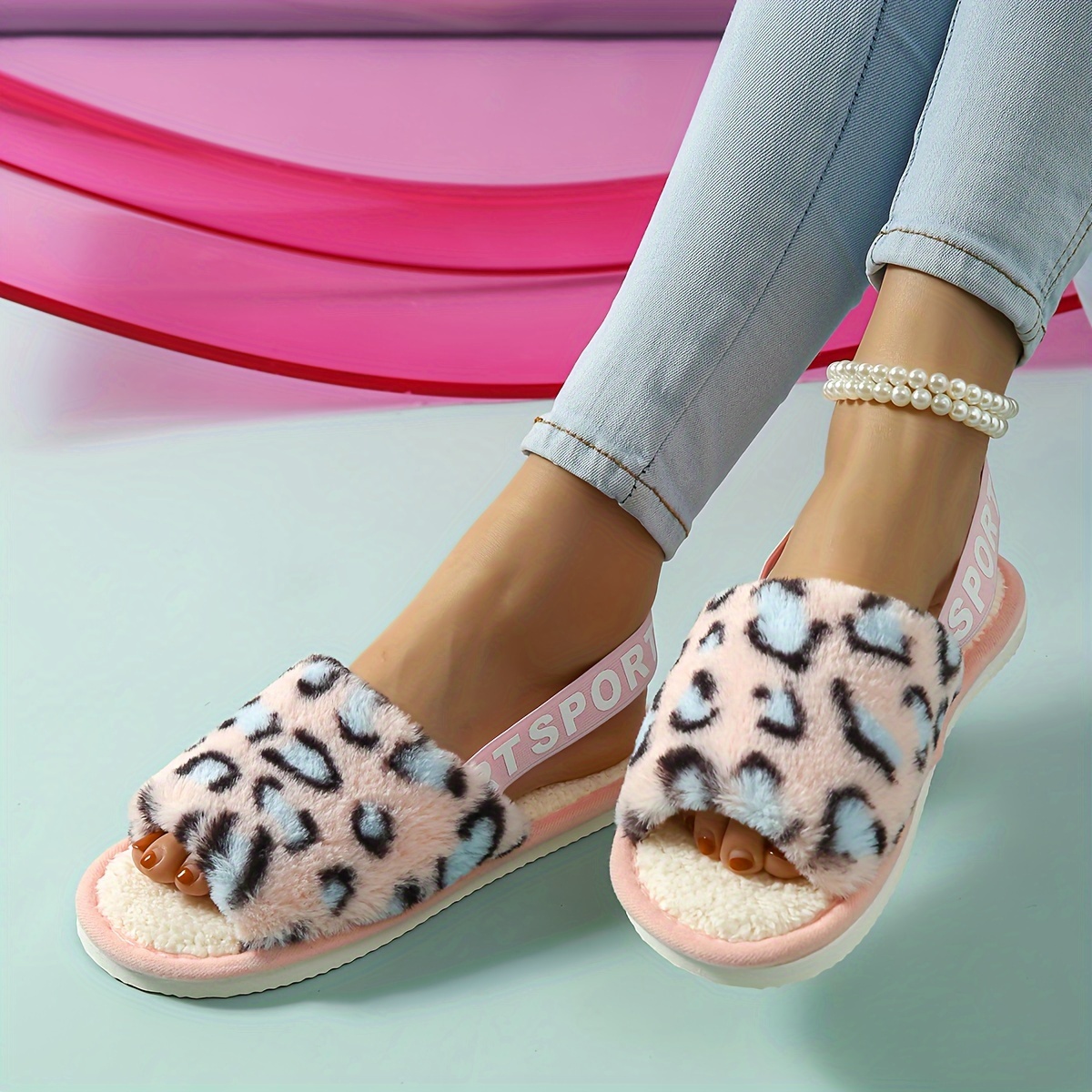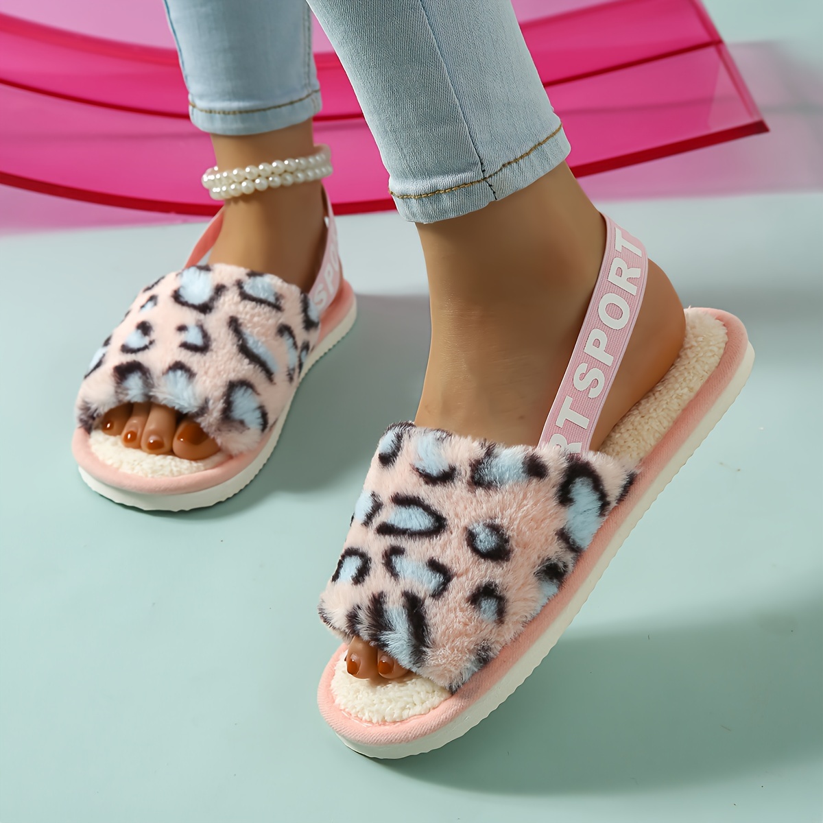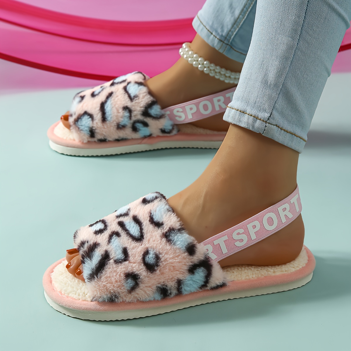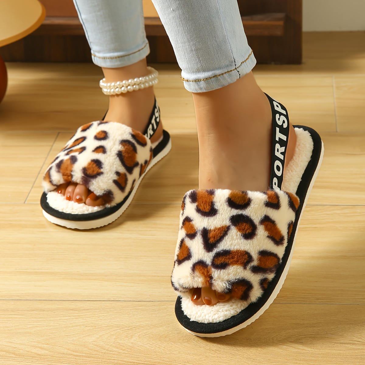 Fluffy Leopard Home Warm Slippers, Letter Elastic Strap Soft Sole Bedroom Shoes, Non-slip Floor Mute Shoes