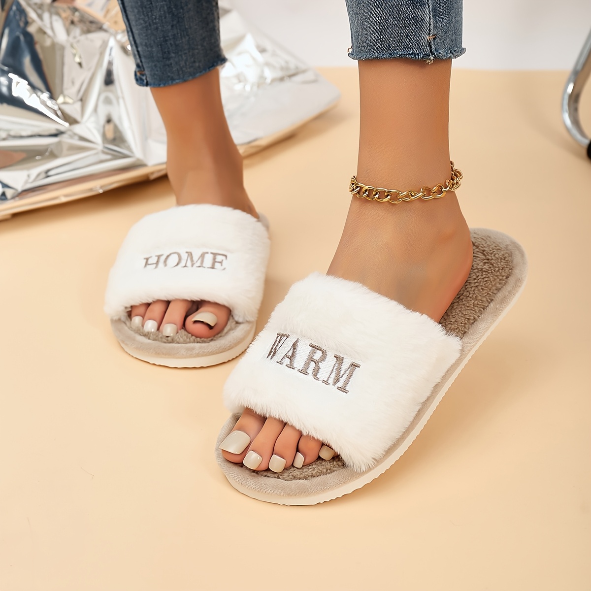 Women's Cozy Plush Slippers with Embroidered "HOME" Lettering - Lightweight, Open-Toe Design, Soft EVA Sole, Fluffy Black & Cream Indoor Shoes for All Seasons, Hand Washable, House Slippers