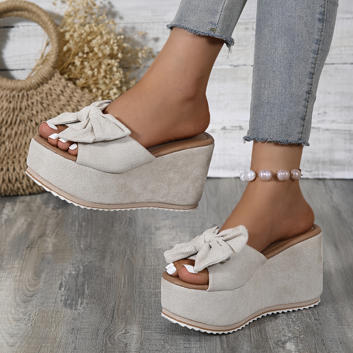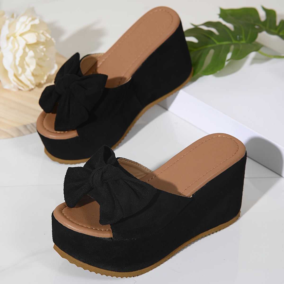 Women's Leopard Print Wedge Sandals with Bowknot - Stylish Slip-On Platform Heels, Comfortable Open Toe Design for Everyday & Party Wear, Black and Brown Animal Print Pattern, Everyday Footwear | Elegant Footwear | Fabric Upp
