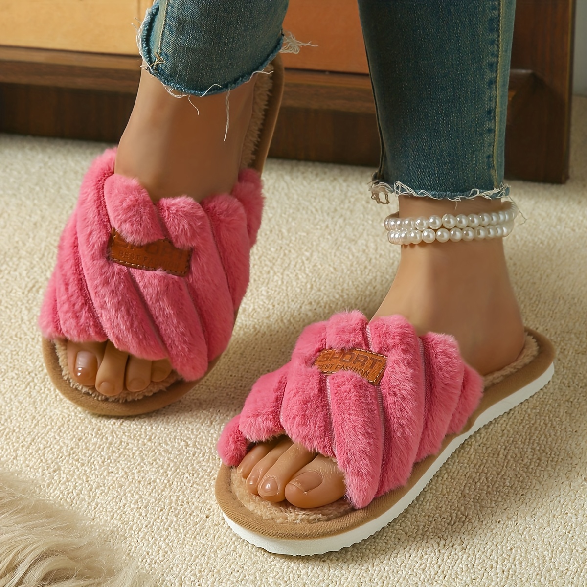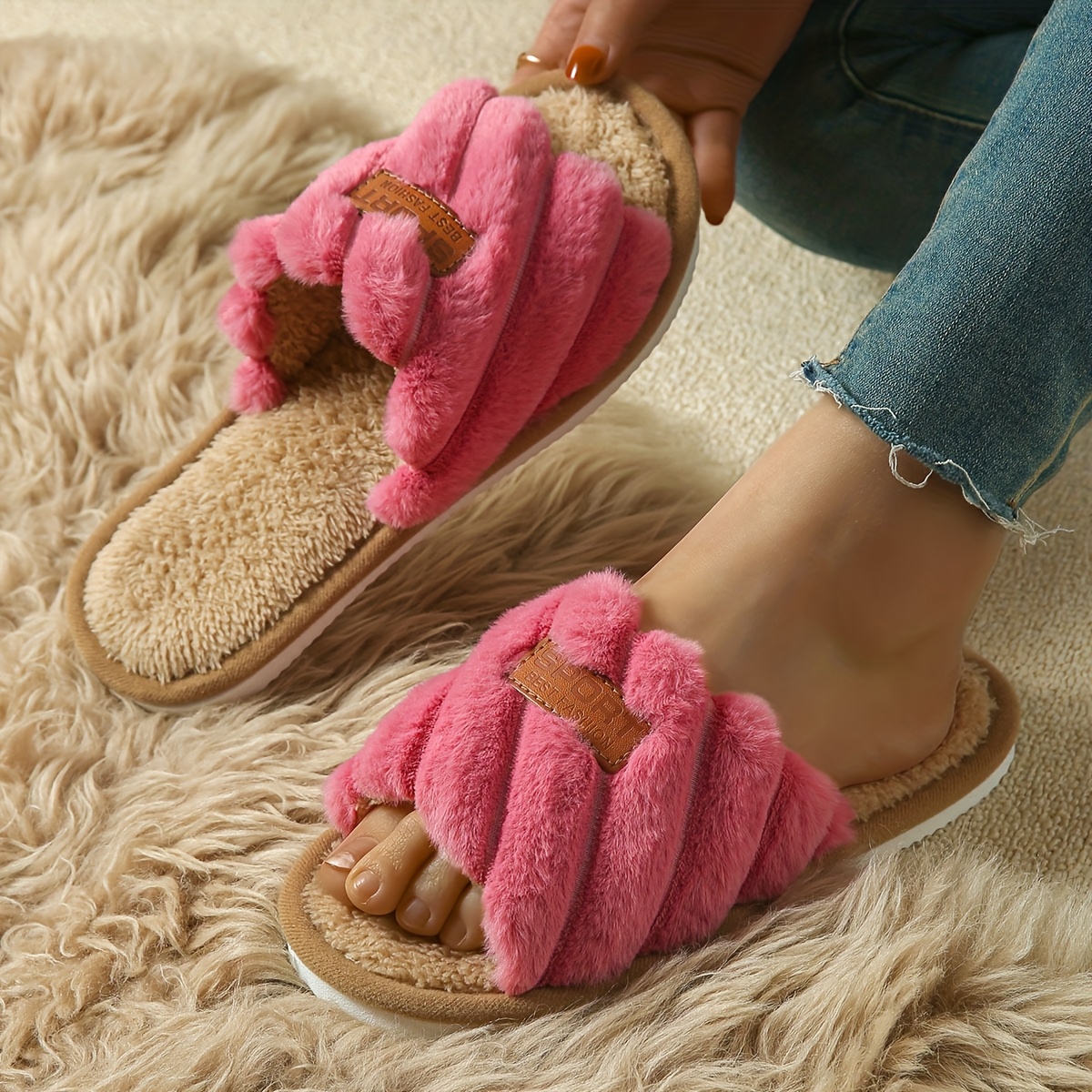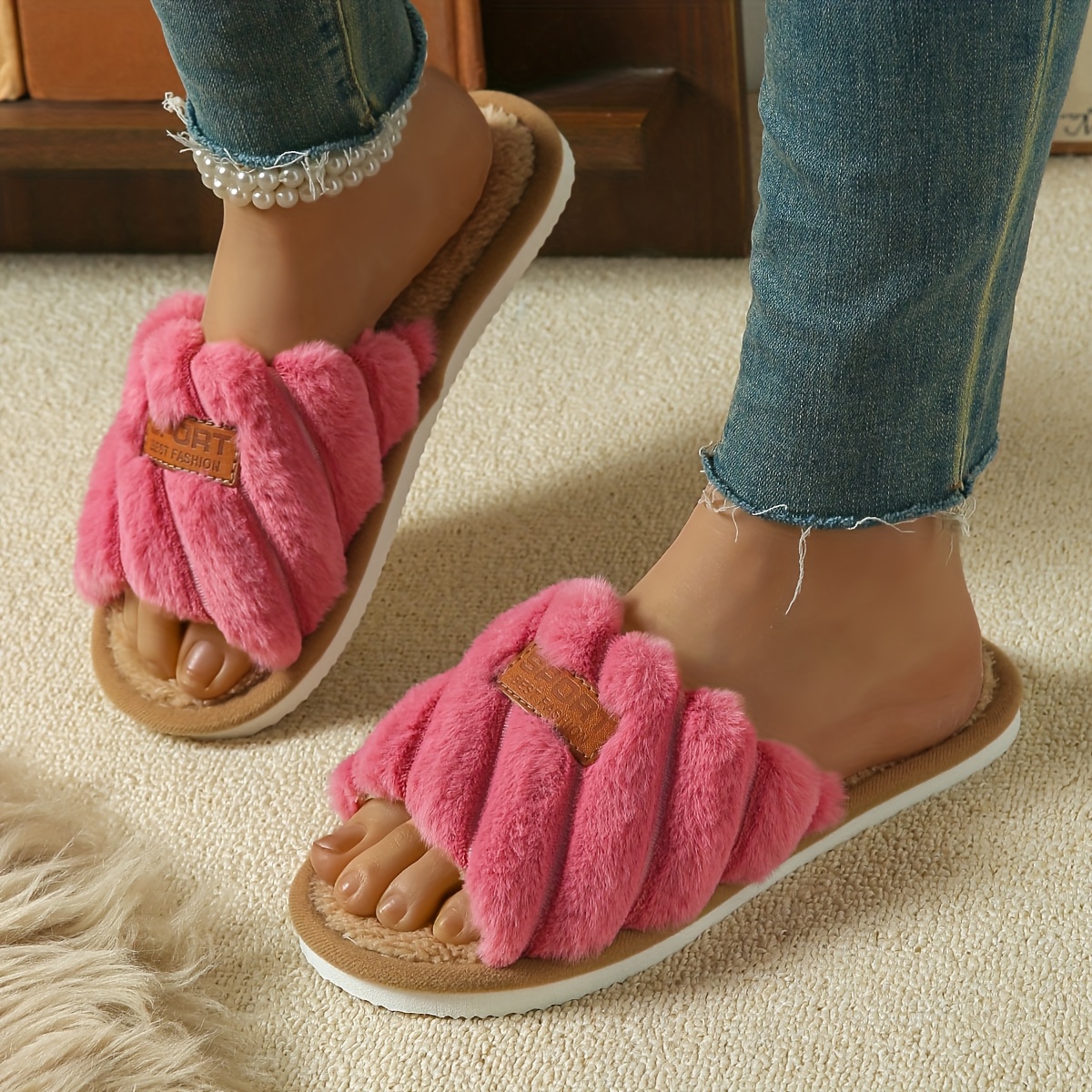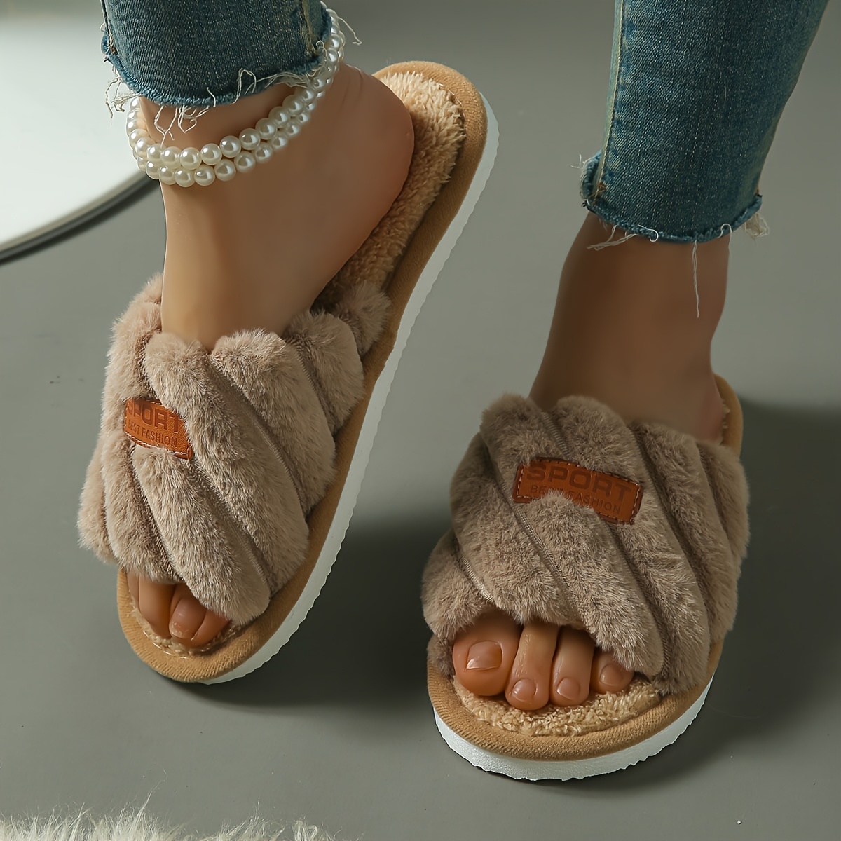 Women's Plush Open-Toe Slippers - Cozy Indoor House Shoes with Soft Rabbit Fur Lining, Quilted Design, and Cover Strap in Brown, Pink, or White, Perfect for Bedroom Comfort, House Slippers