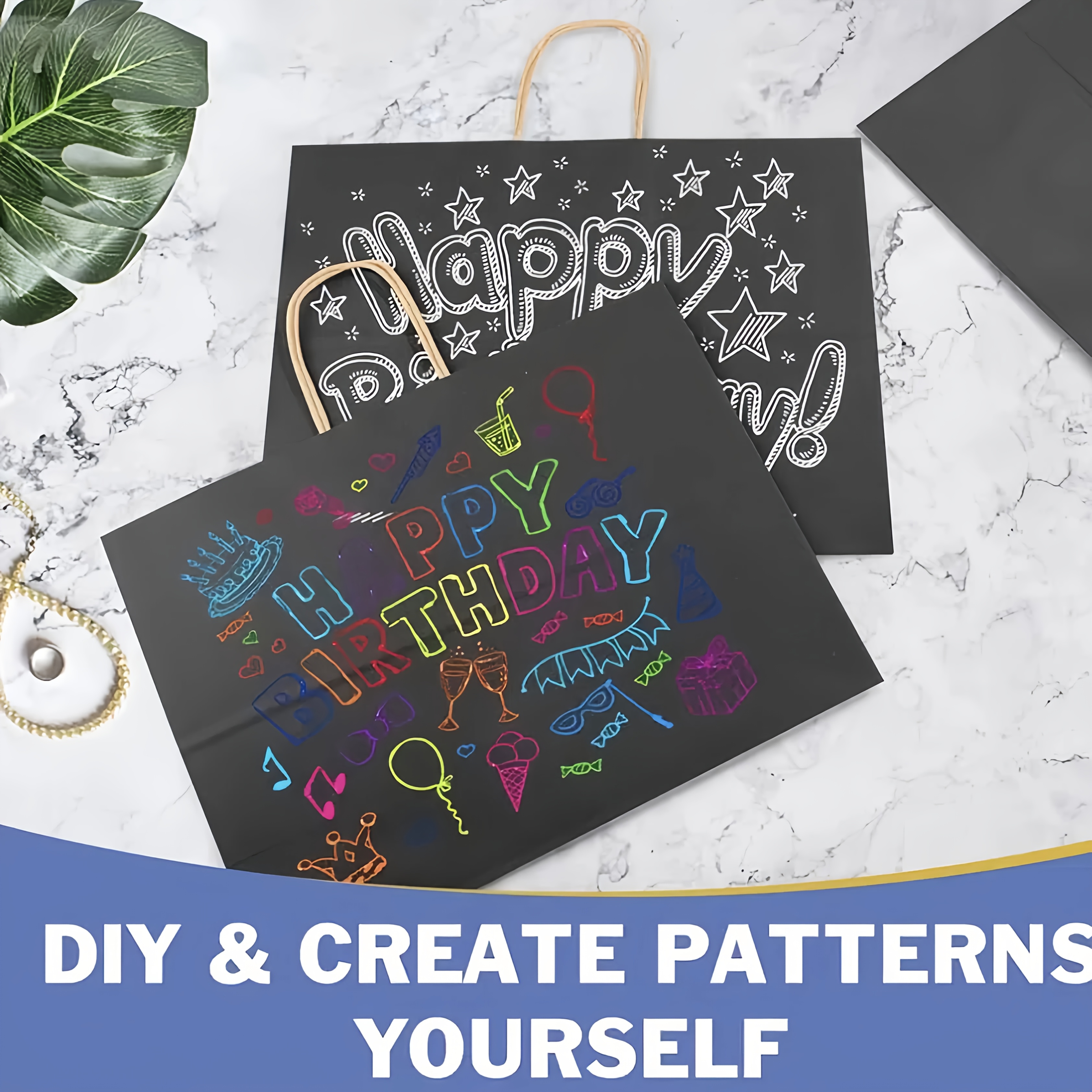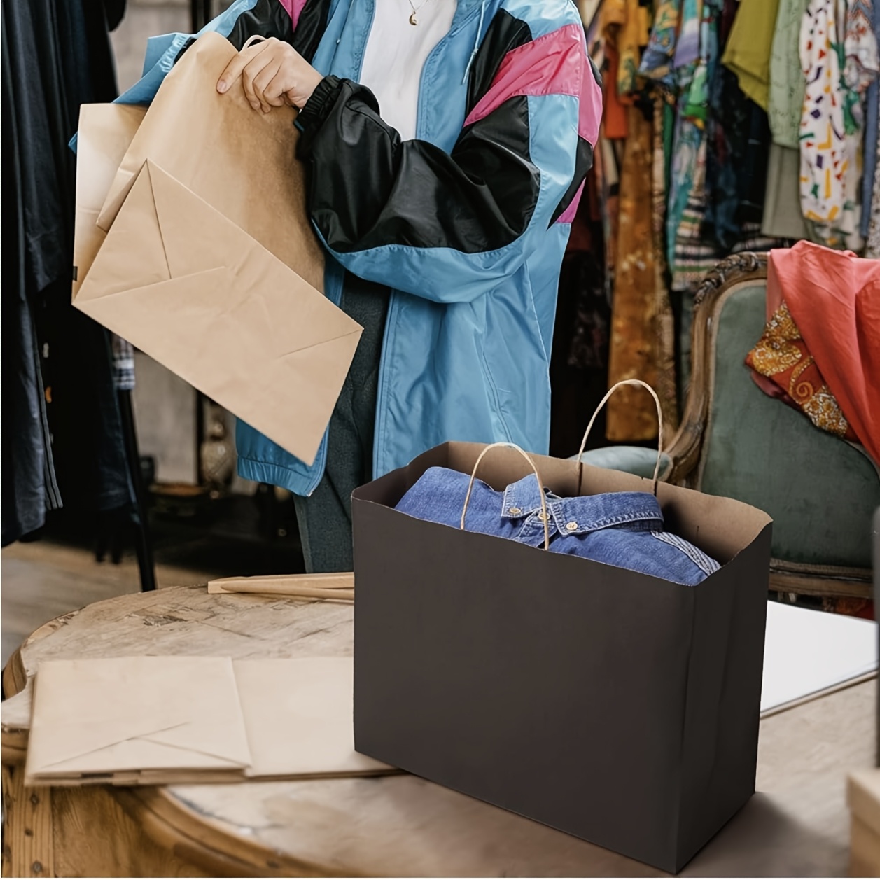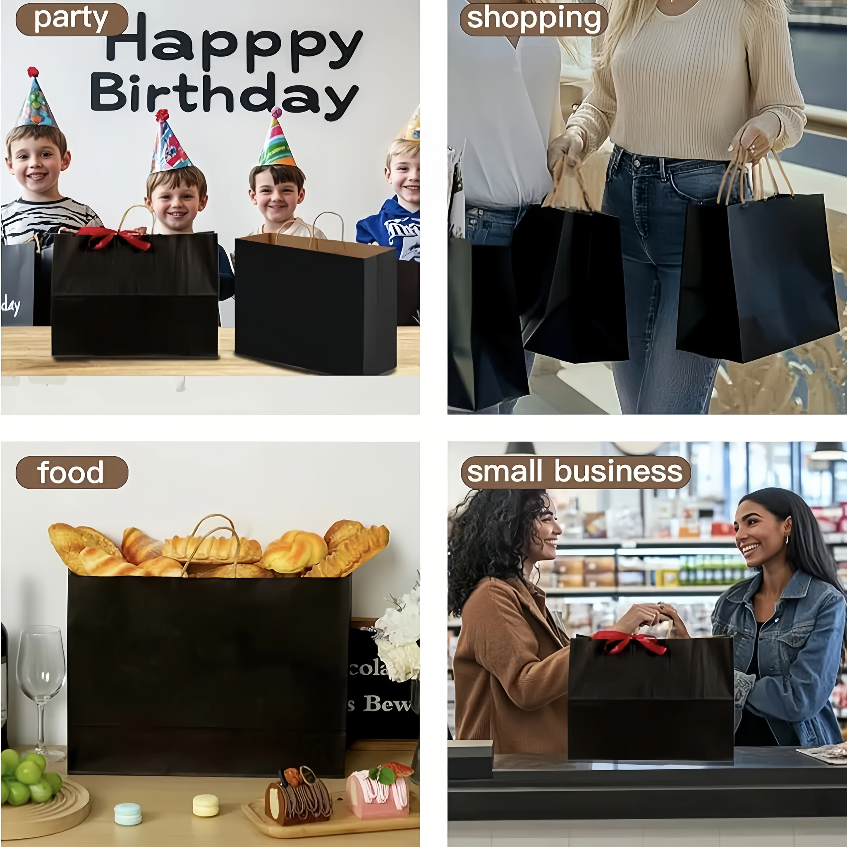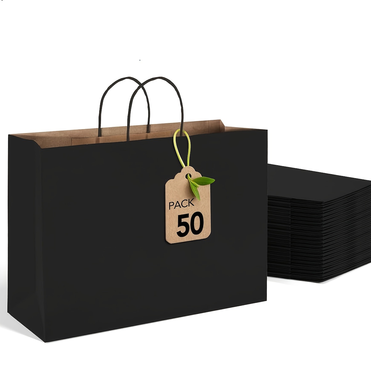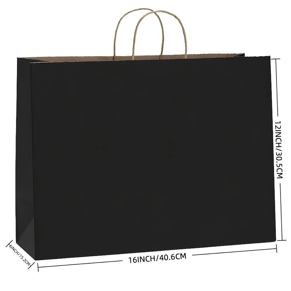 These sizable black kraft paper bags are 16 inches by 6 inches by 12 inches and constructed from durable 120g paper. Each bag is equipped with robust twisted handles and a flat base. They are perfect for shopping, wrapping gifts, party favors, takeout, and retail packaging. Comes in a pack of 50, making them ideal for both business and personal use.