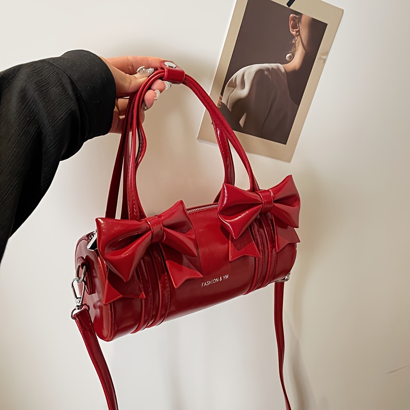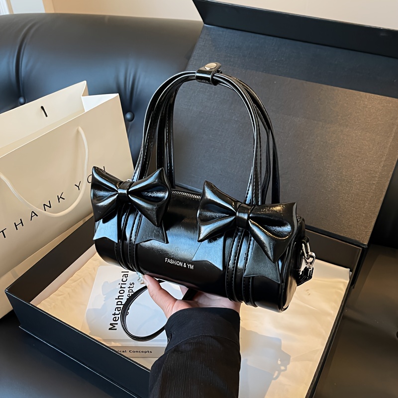 [Chic Appeal] Stylish Black Bow Tie Handbag - Large Capacity Crossbody Bag with Detachable Shoulder Strap, Elegant Glossy Finish & Polyester Lining, Crossbody Purse