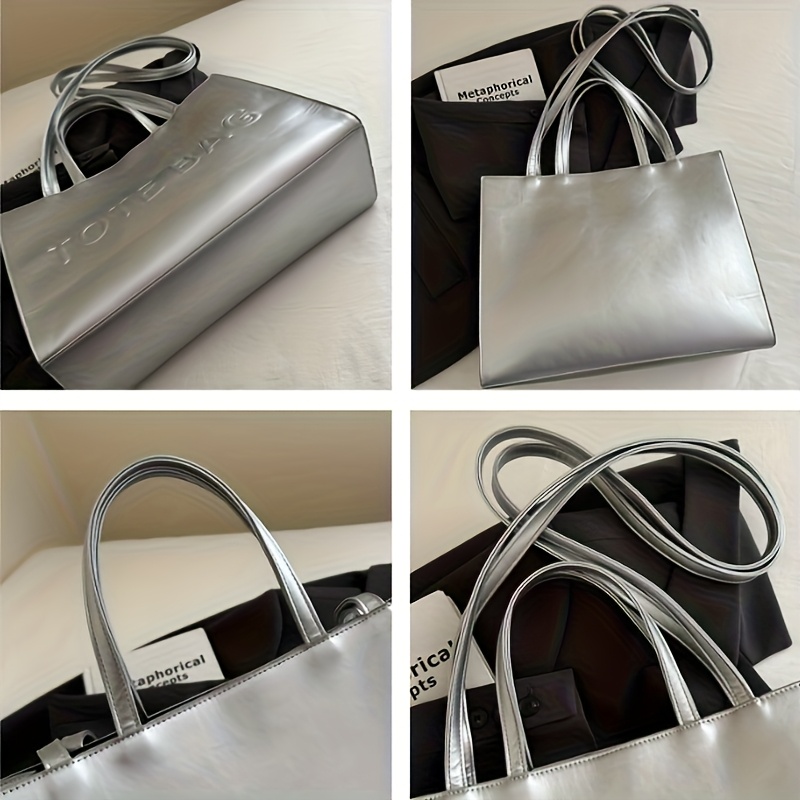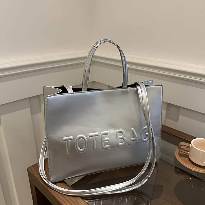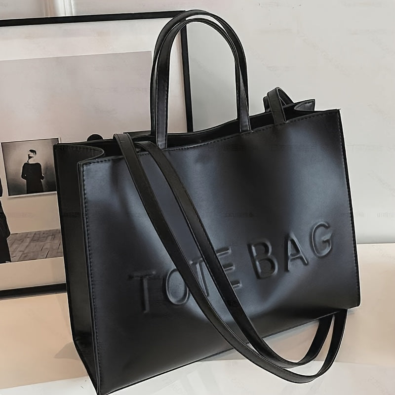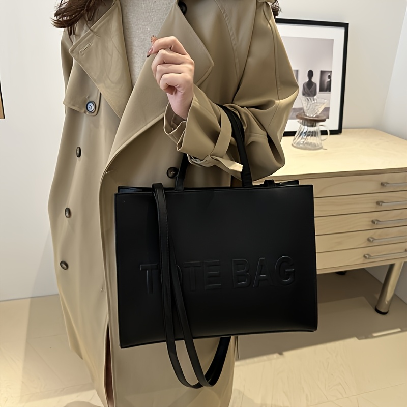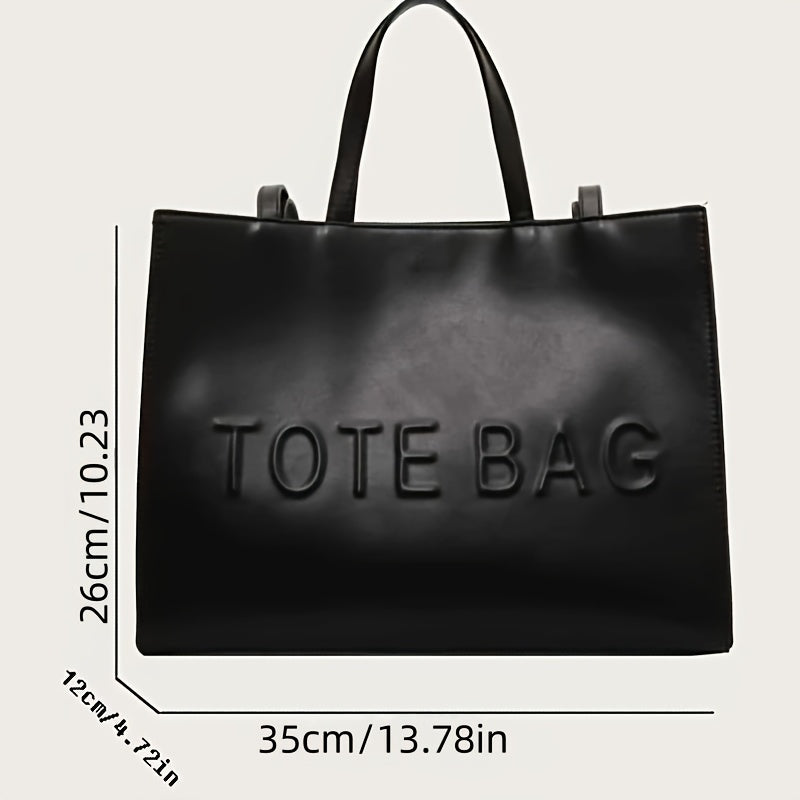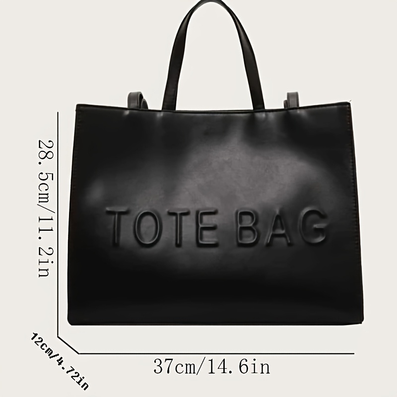 Stylish Black Tote Bag with "TOTE BAG" Embossed Design – Large Capacity Shoulder Handbag for Women, Perfect for Commuting and Casual Outings, Snap Button Closure