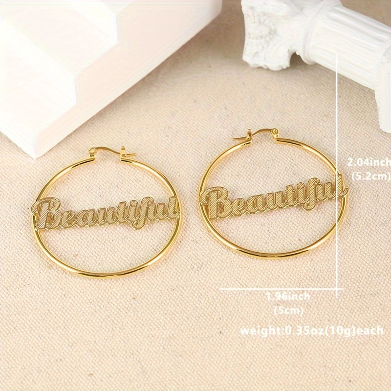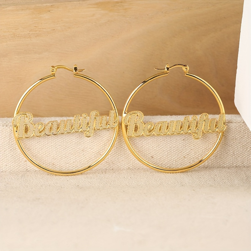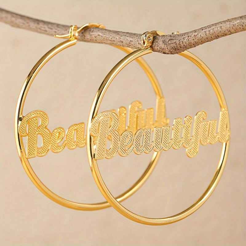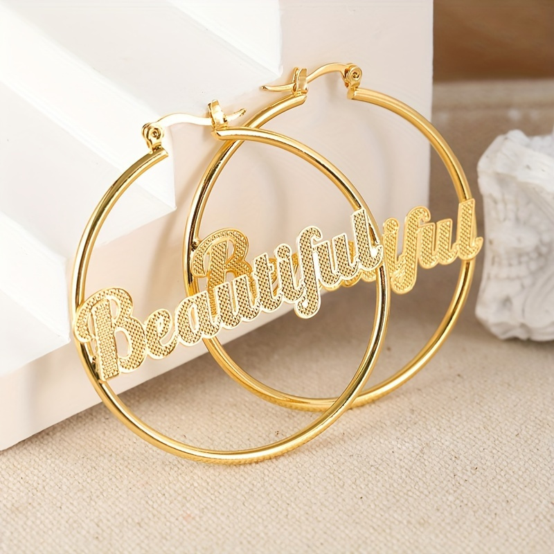 1 Pair Elegant Copper Hoop Earrings with "Beautiful" Lettering, Large Statement Circle Earrings for Women, Luxury Jewelry for Daily Wear & Gift-Giving, All-Season Accessory
