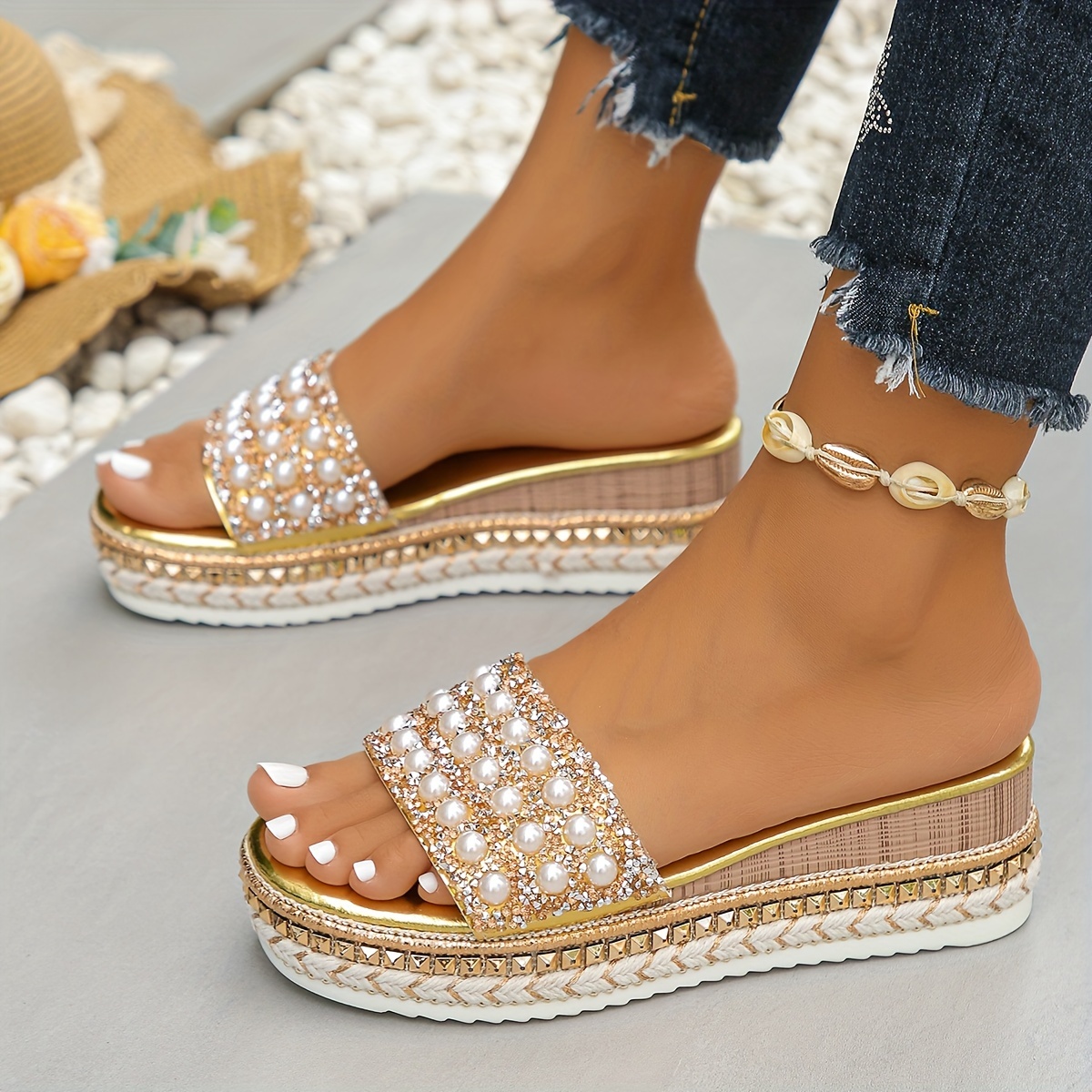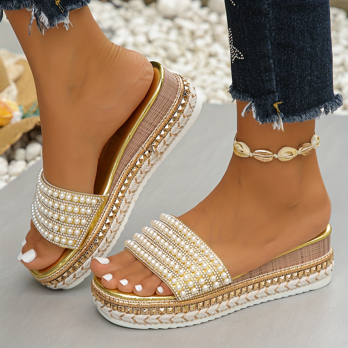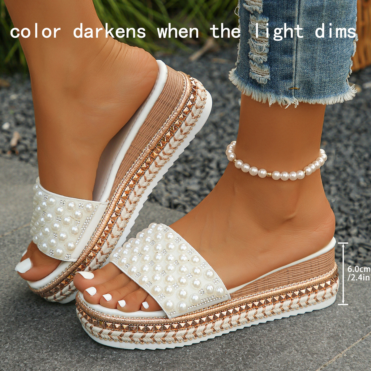 1 Pair Women'S Fashion Platform Slide Sandals, Summer Slip-On Open Toe with Pearl Embellishment, Non-Slip Rubber Sole, Man-Made Materials, Waterproof Thick Sole for Casual Outdoor Wear