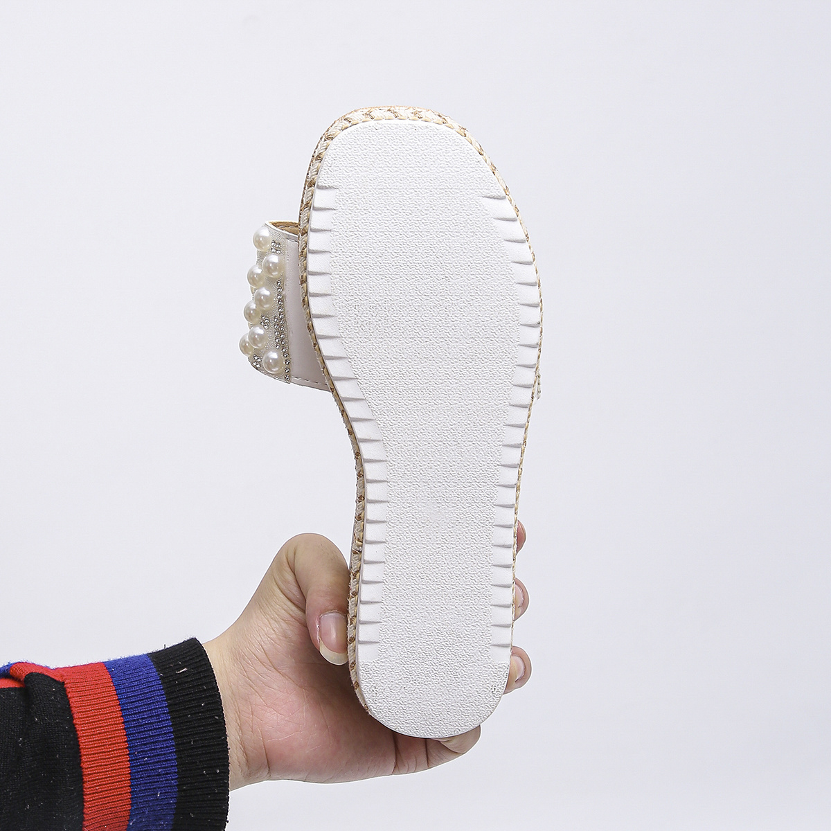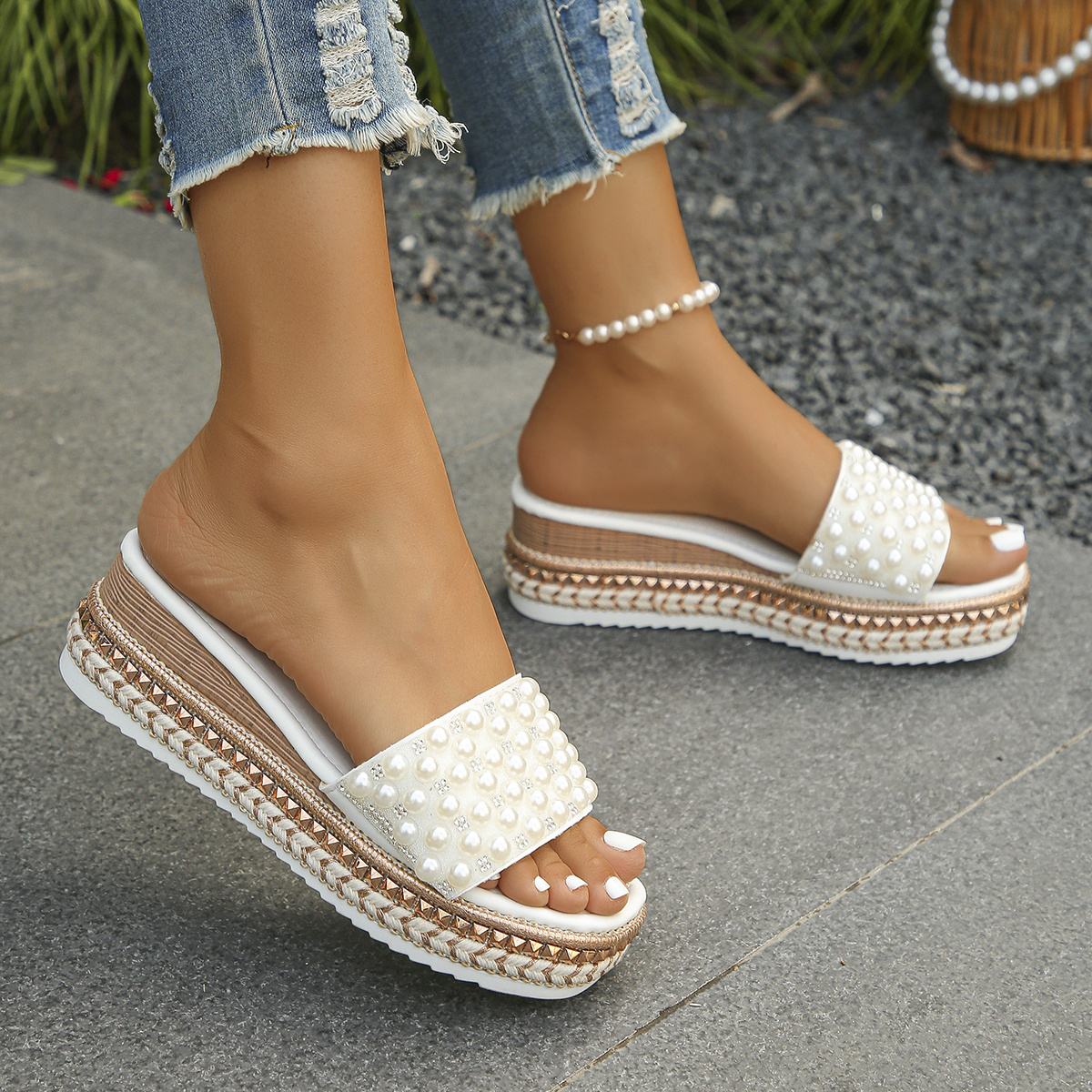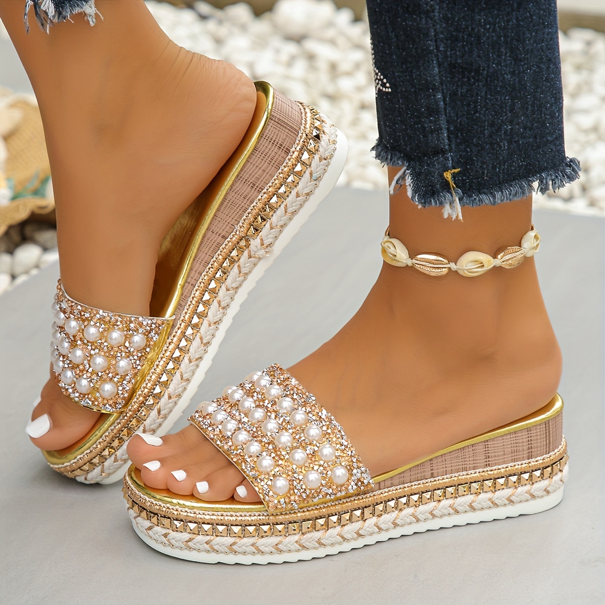 1 Pair Women'S Fashion Platform Slide Sandals, Summer Slip-On Open Toe with Pearl Embellishment, Non-Slip Rubber Sole, Man-Made Materials, Waterproof Thick Sole for Casual Outdoor Wear