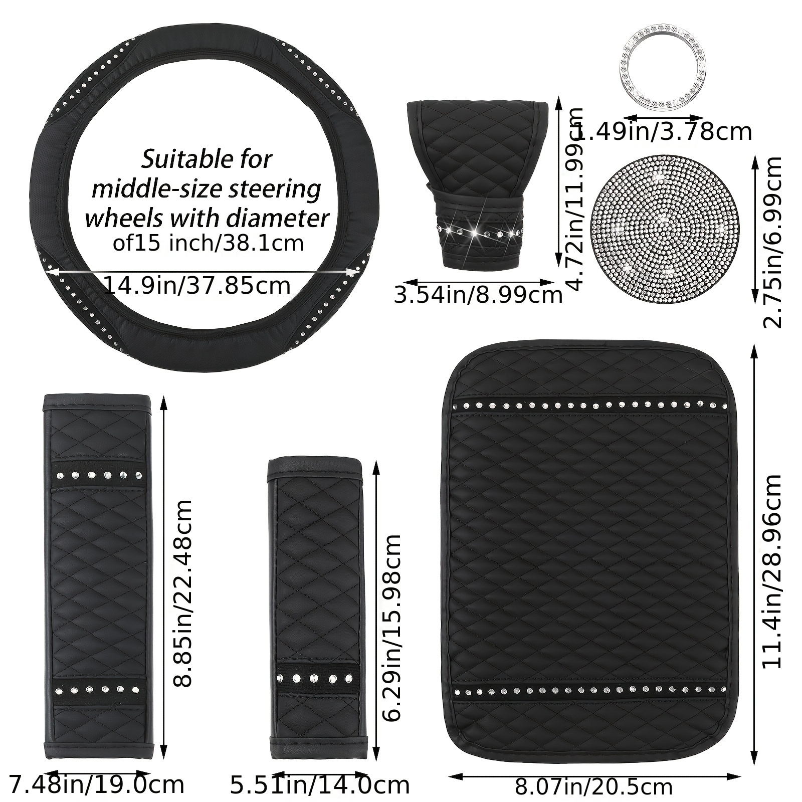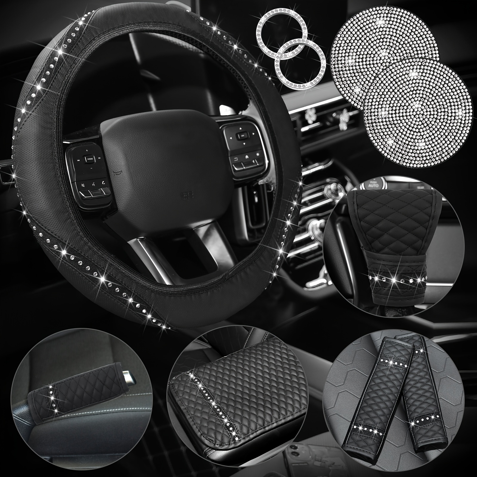 10pcs Bling Car Accessories Set For Women Rhinestones Faux Leather Accessories Steering Wheel Cover Armrest Cover Gear Shift Cover Seat Belt Cover Handbrake Cover Cup Pads Start Button Ring