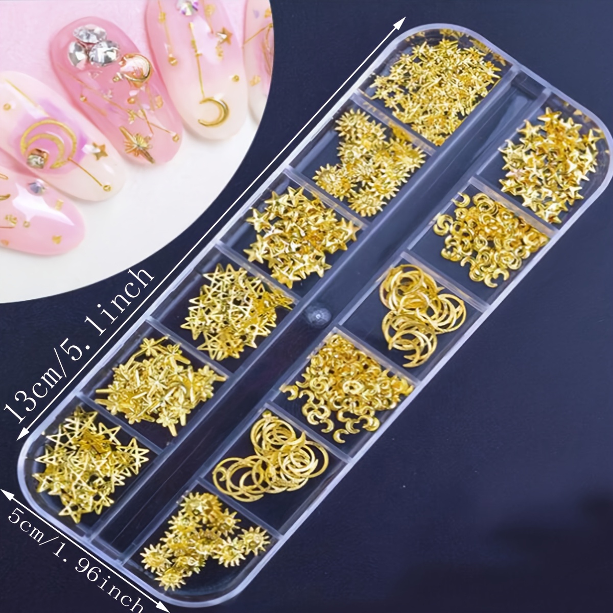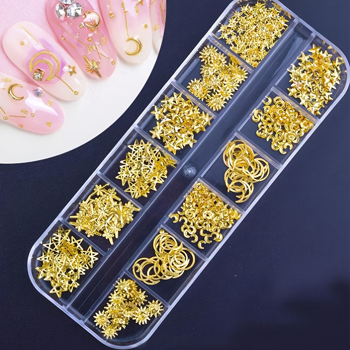 12 Grids 1000pcs Moon Star Nails Golden Metallic Nail Sequins Charms 3D Nail Art Tips Decoration Press On Manicure Supply DIY Nail Gems Nail Supplies