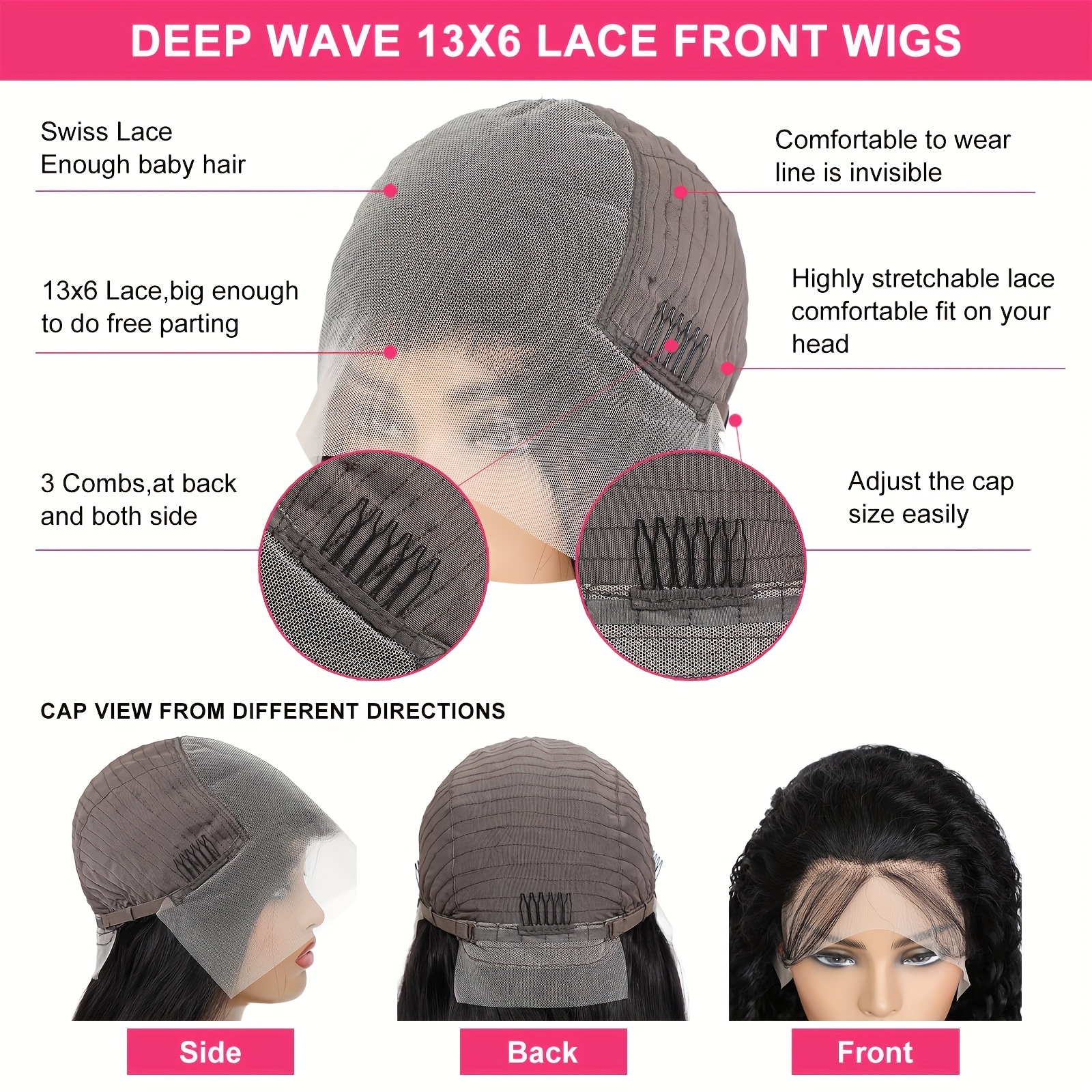 13x6 Deep Wave Lace Front Wig - 250% Density HD Lace, Pre-Plucked 100% Virgin Human Hair, Glueless Curly Style for Women, Natural Look with Hairs, Suitable for All Ethnicities, Special Occasion Wig | Deep Wave Texture | Reali