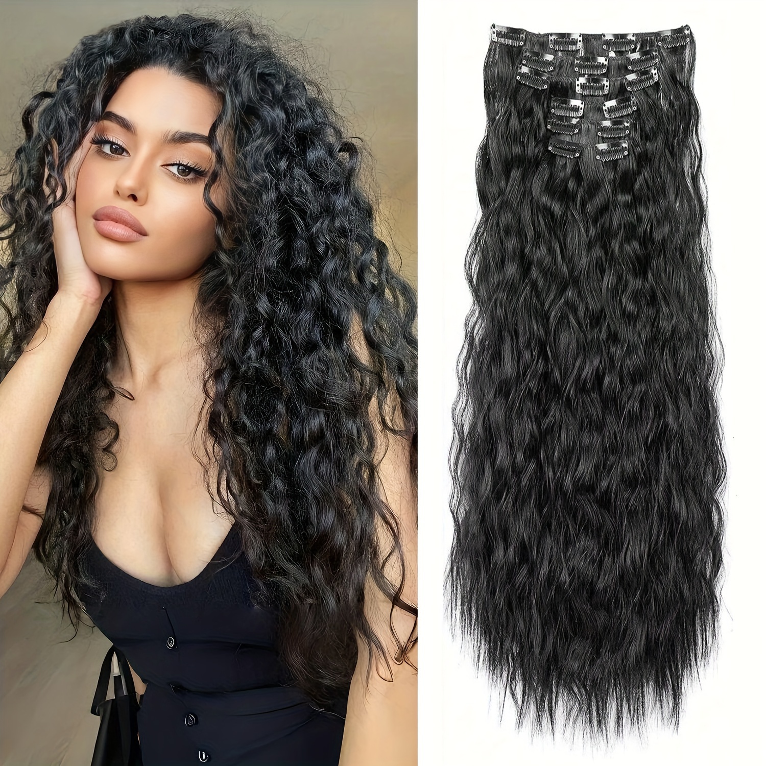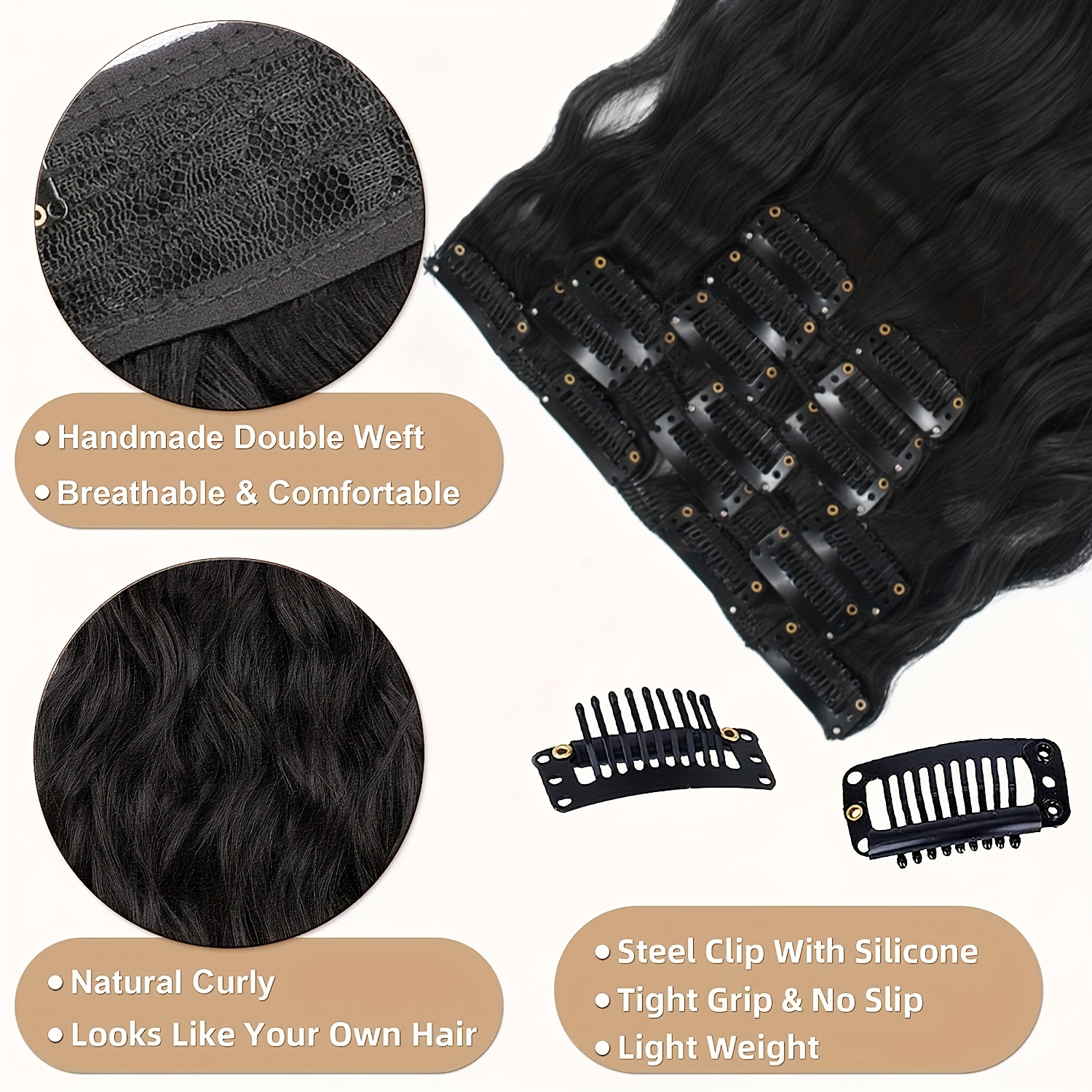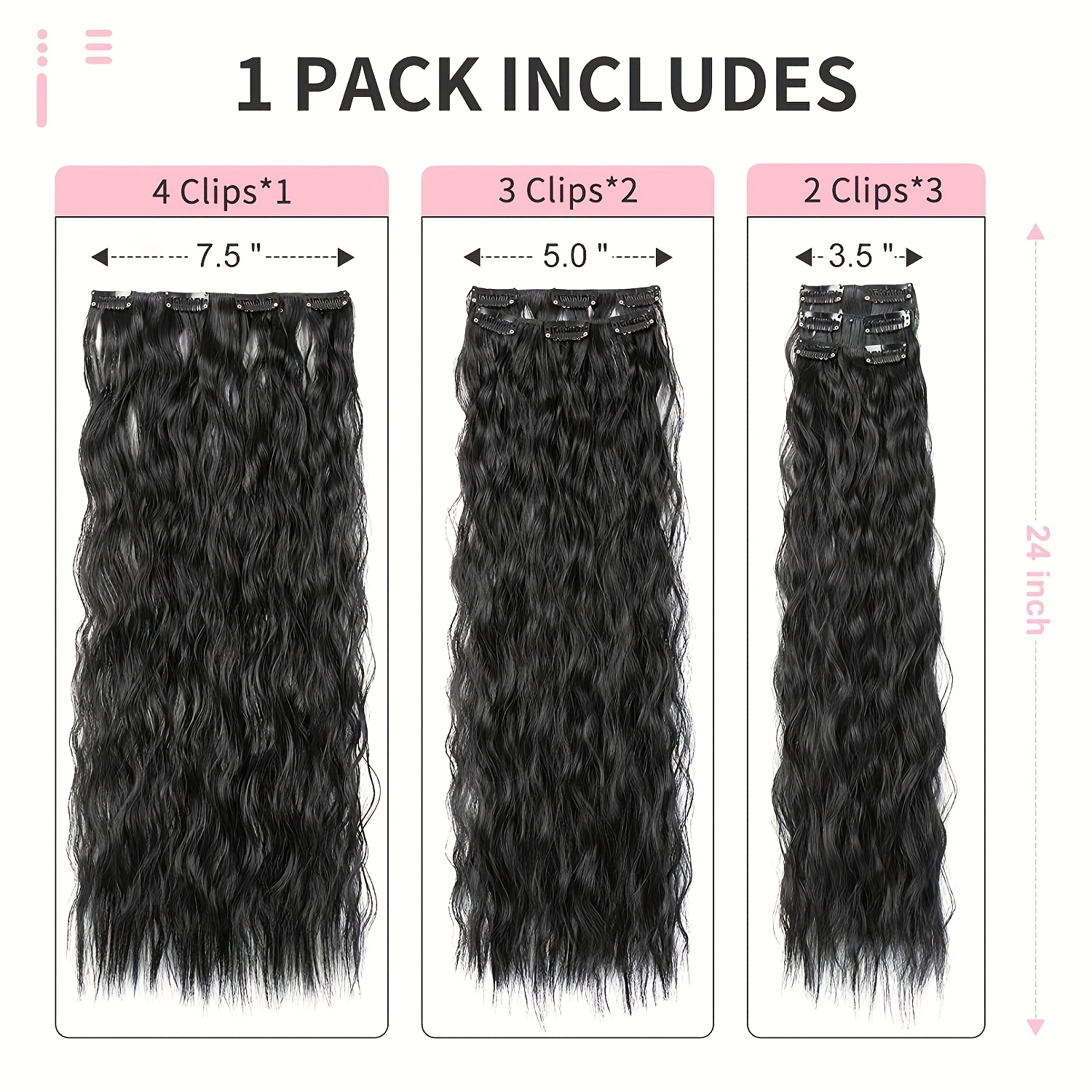 16 Thick Black Hair Clips for Synthetic Curls, Completely Soft And Invisible Fiber Hair Extensions, 24 Inches Long.