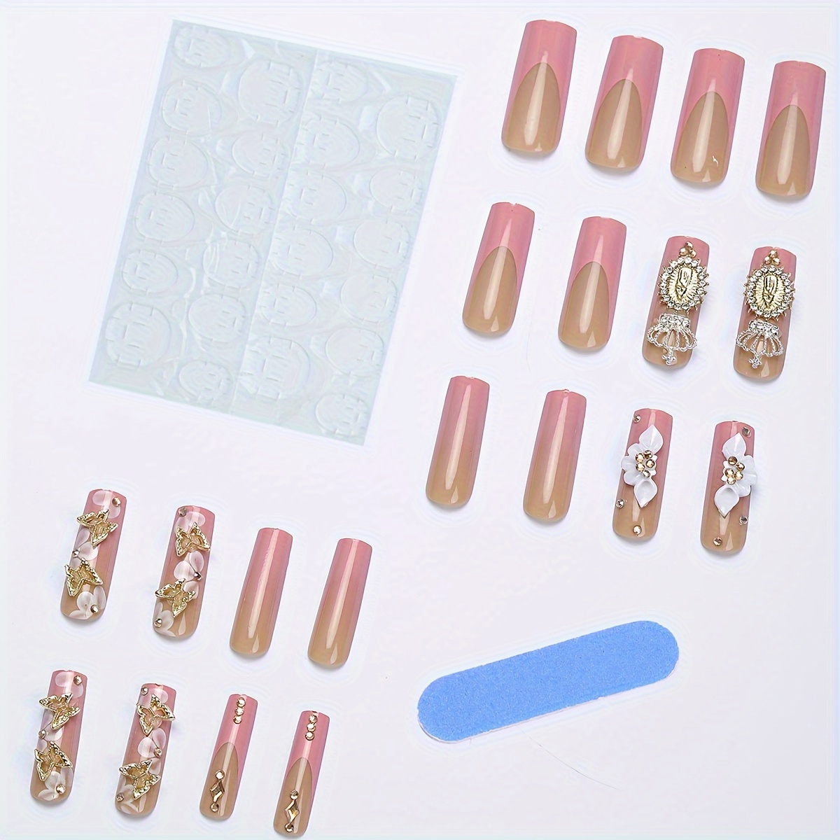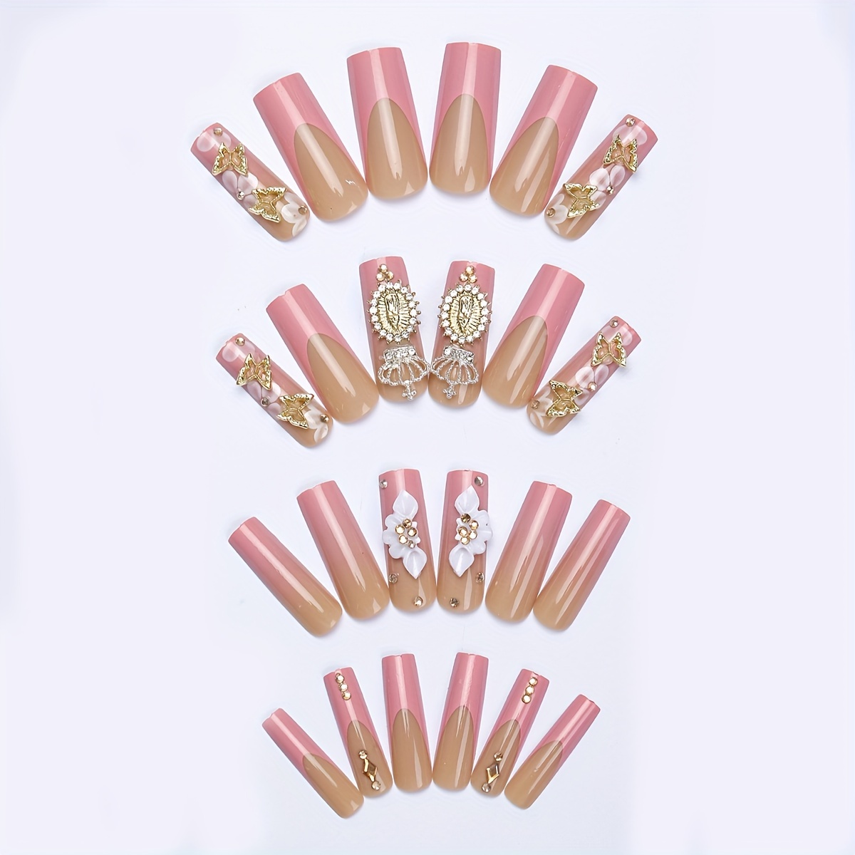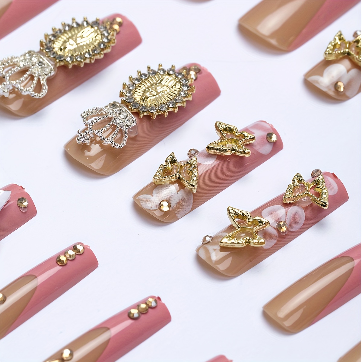 24pcs Rectangular Pink French False Nails with Flower Print, Shiny Rhinestone Metal Crown Design, Press-on Nails, Essential for Ladies' Party, Acrylic Press-on Nails with Jelly Glue 1pc and Scrubbing Strip 1pc