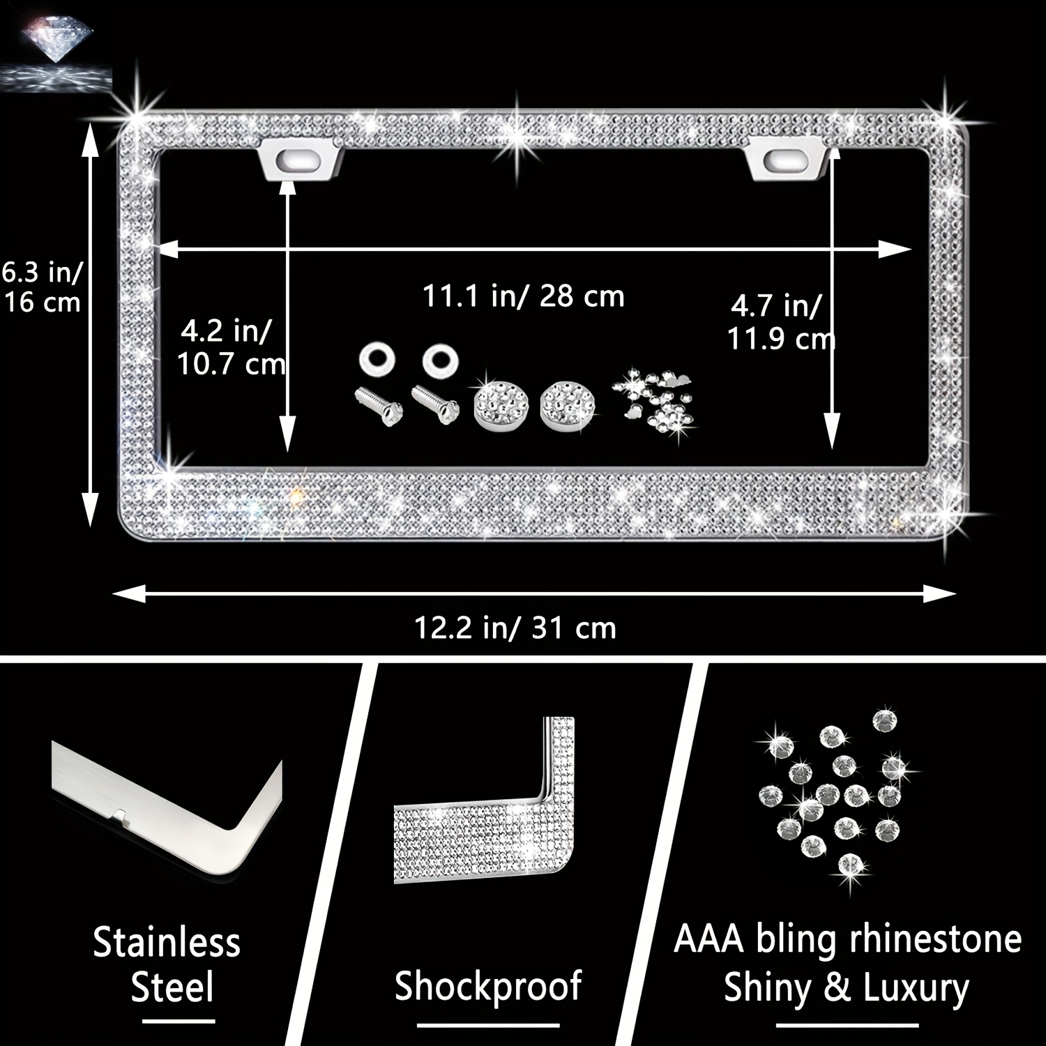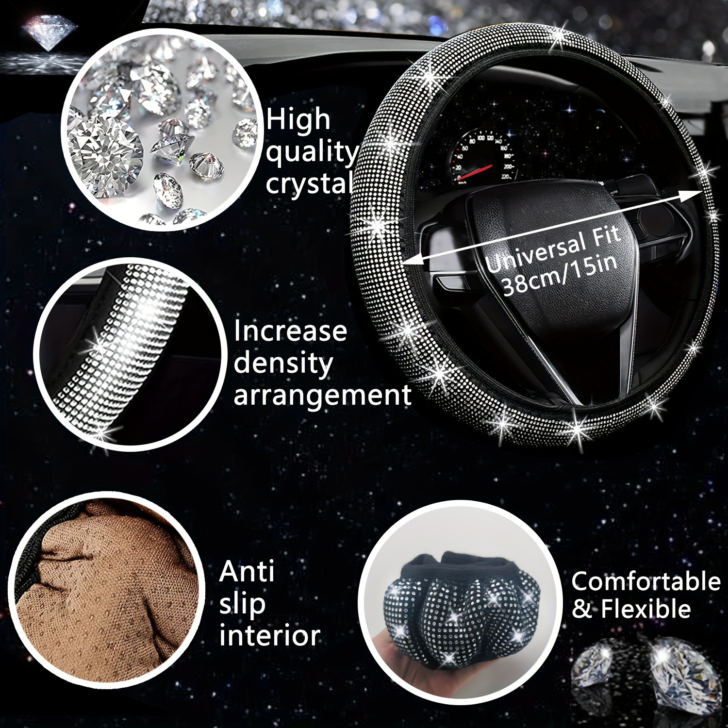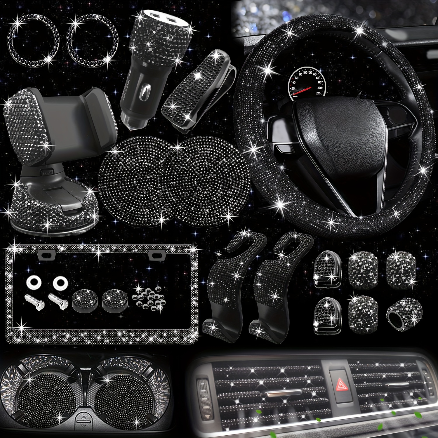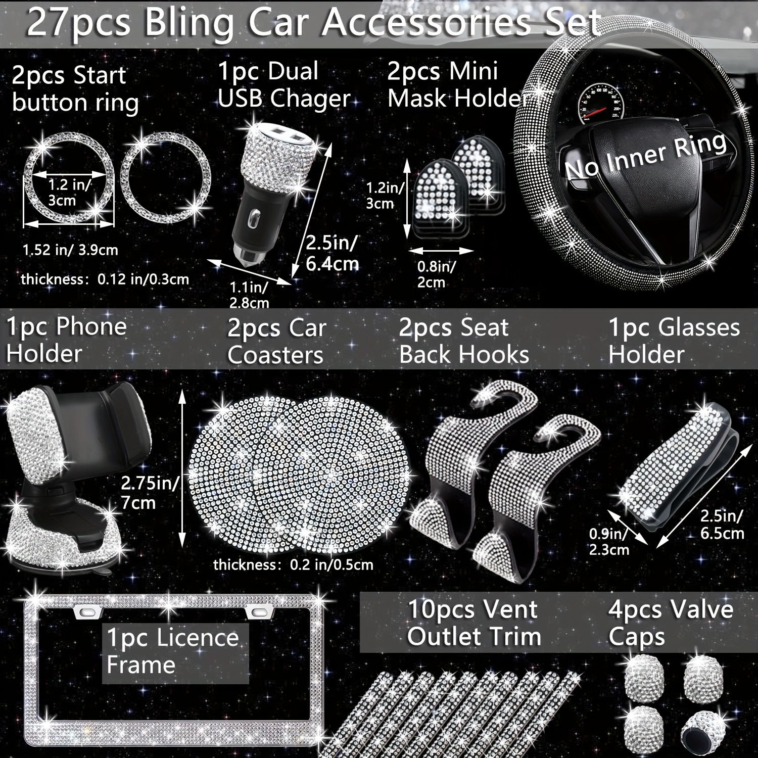 27pcs Bling Car Accessories Set for Women, Bling Steering Wheel Covers Universal Fit 15 Inch, Bling License Plate Frame, Bling Car Phone Holder, Bling Car Coasters, Bling Car Fast Charger, Bling Valve Caps