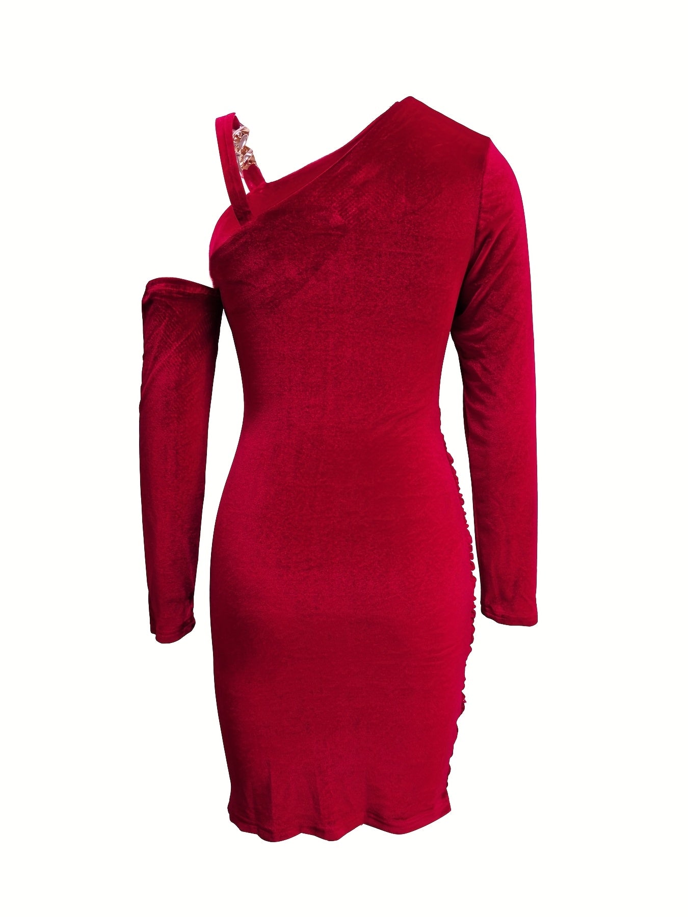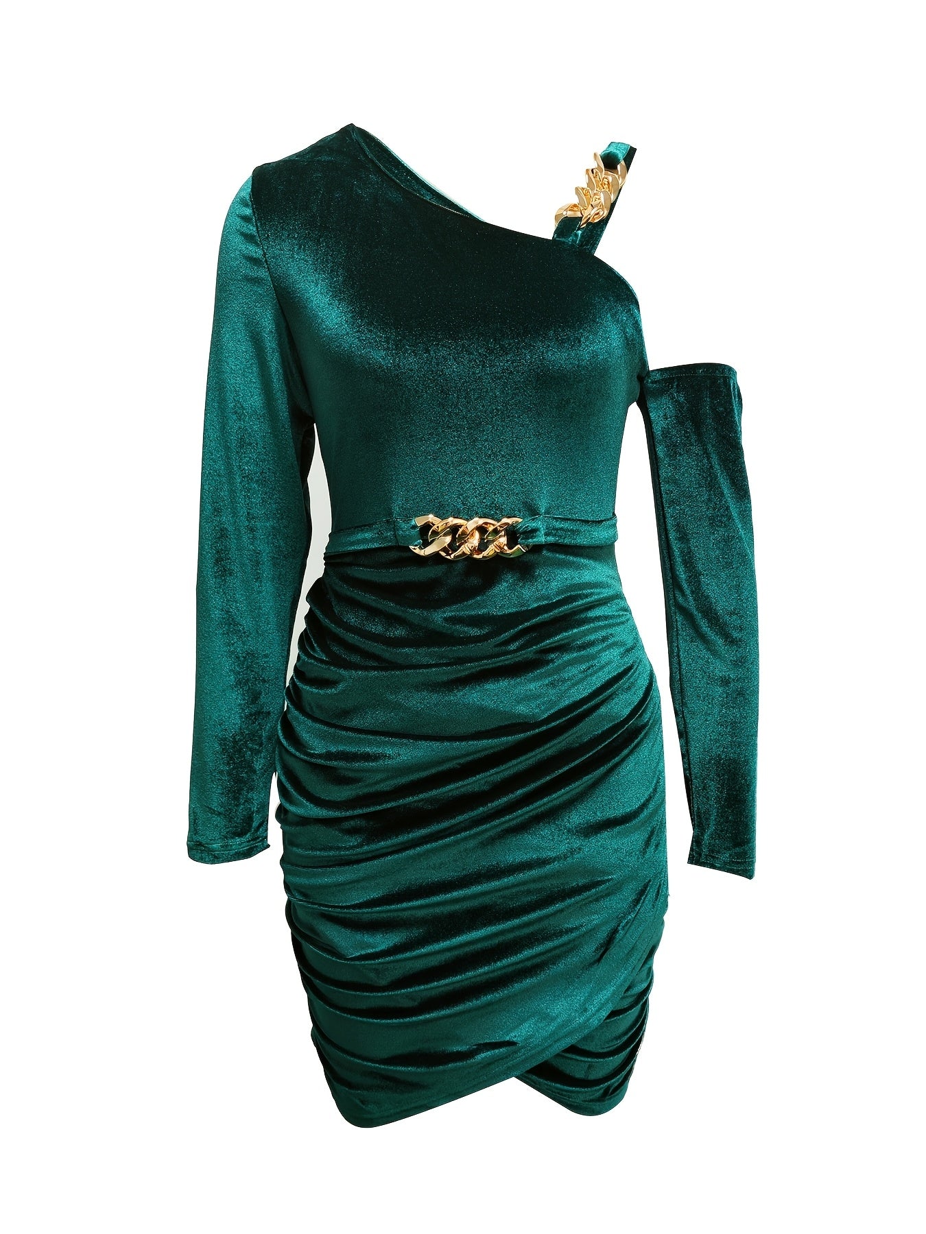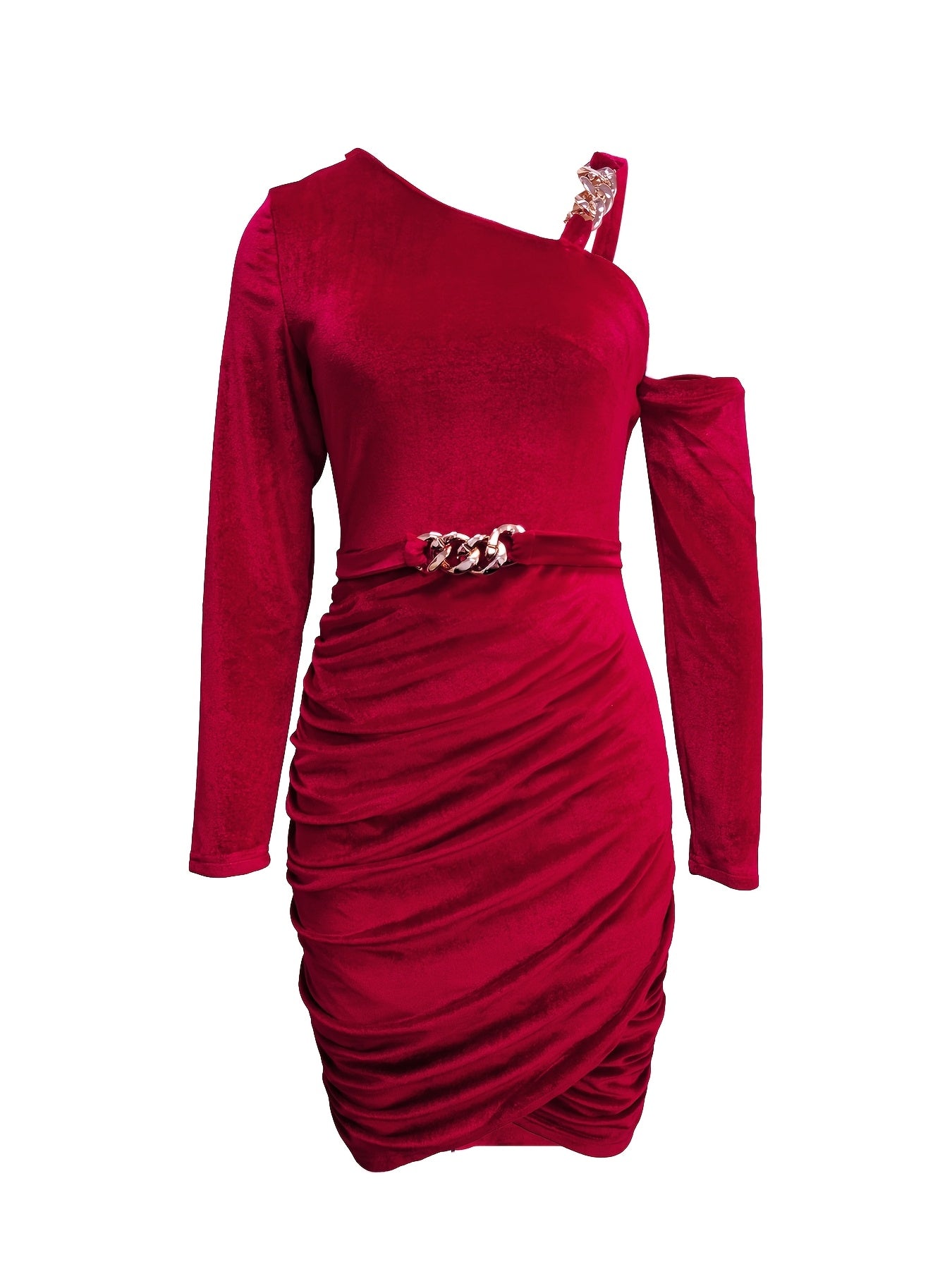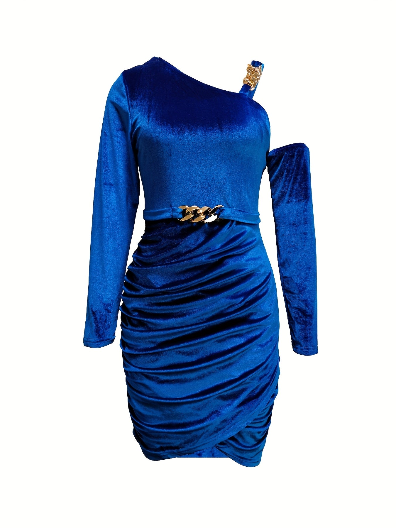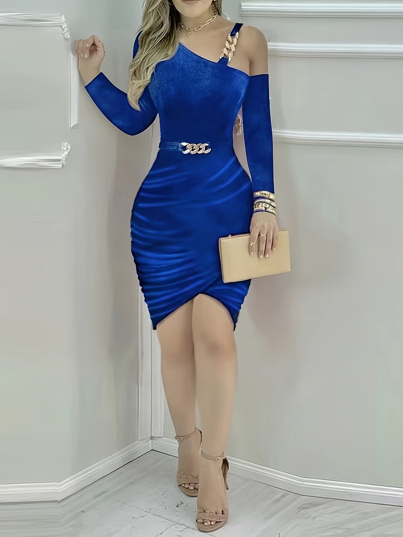 Elegant Off-Shoulder Blue Midi Dress for Women - Chic Chain Detail, Long Sleeves, Ruched Bodycon Fit, Polyester, Machine Washable - Perfect for Evening & Vacation
