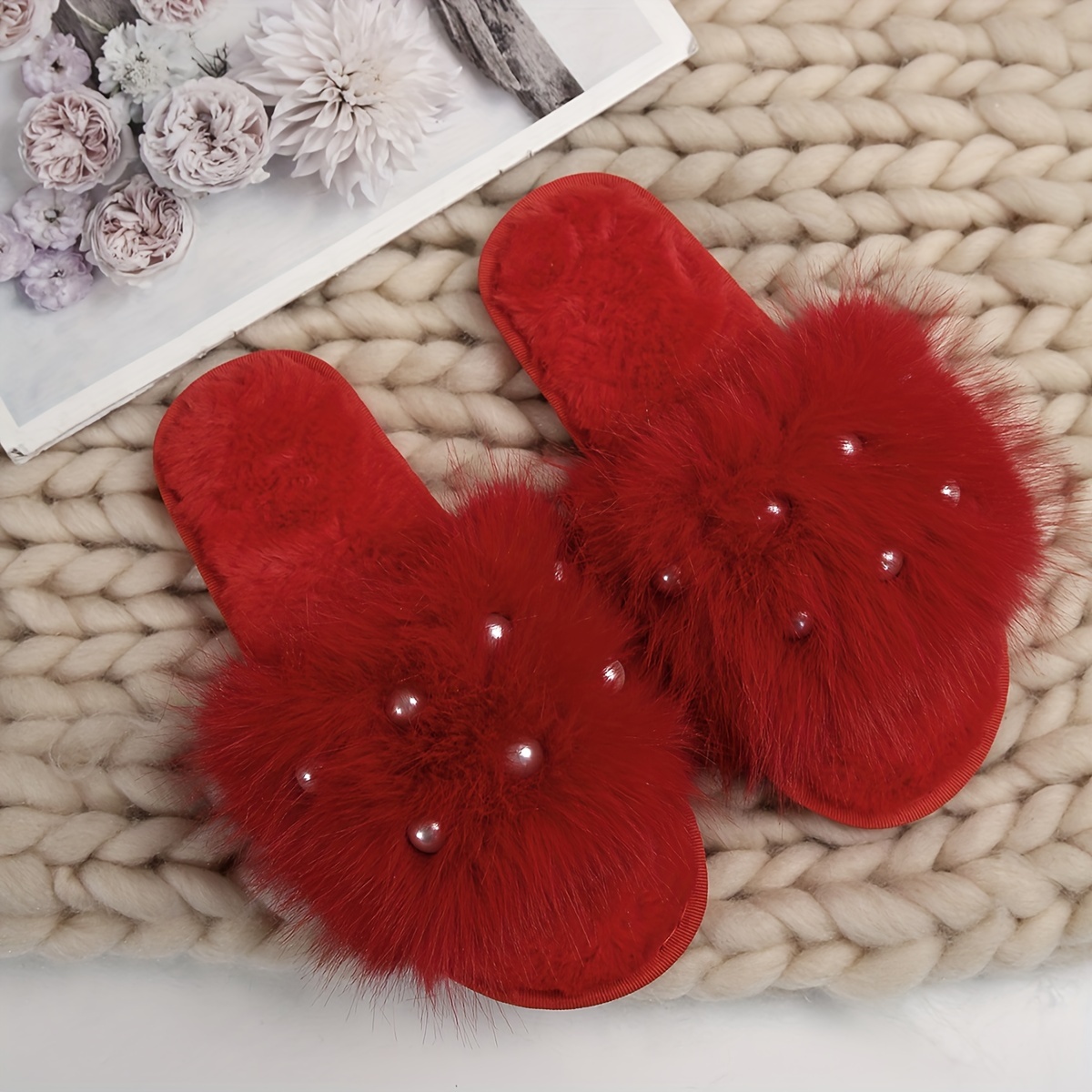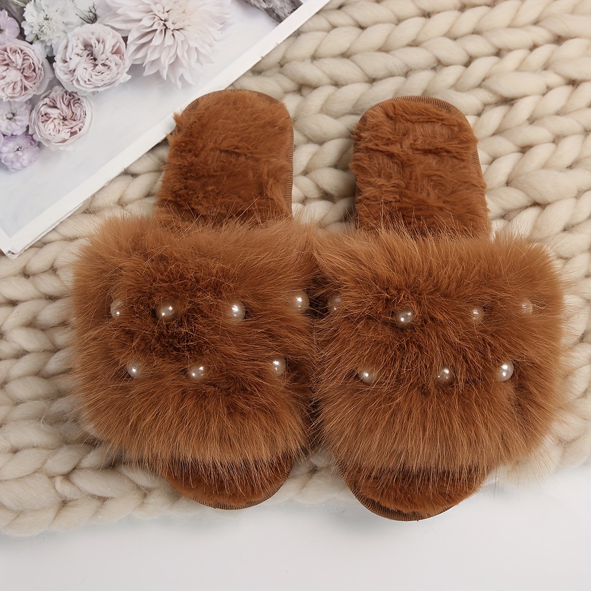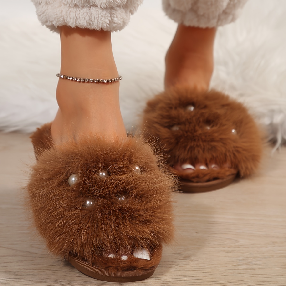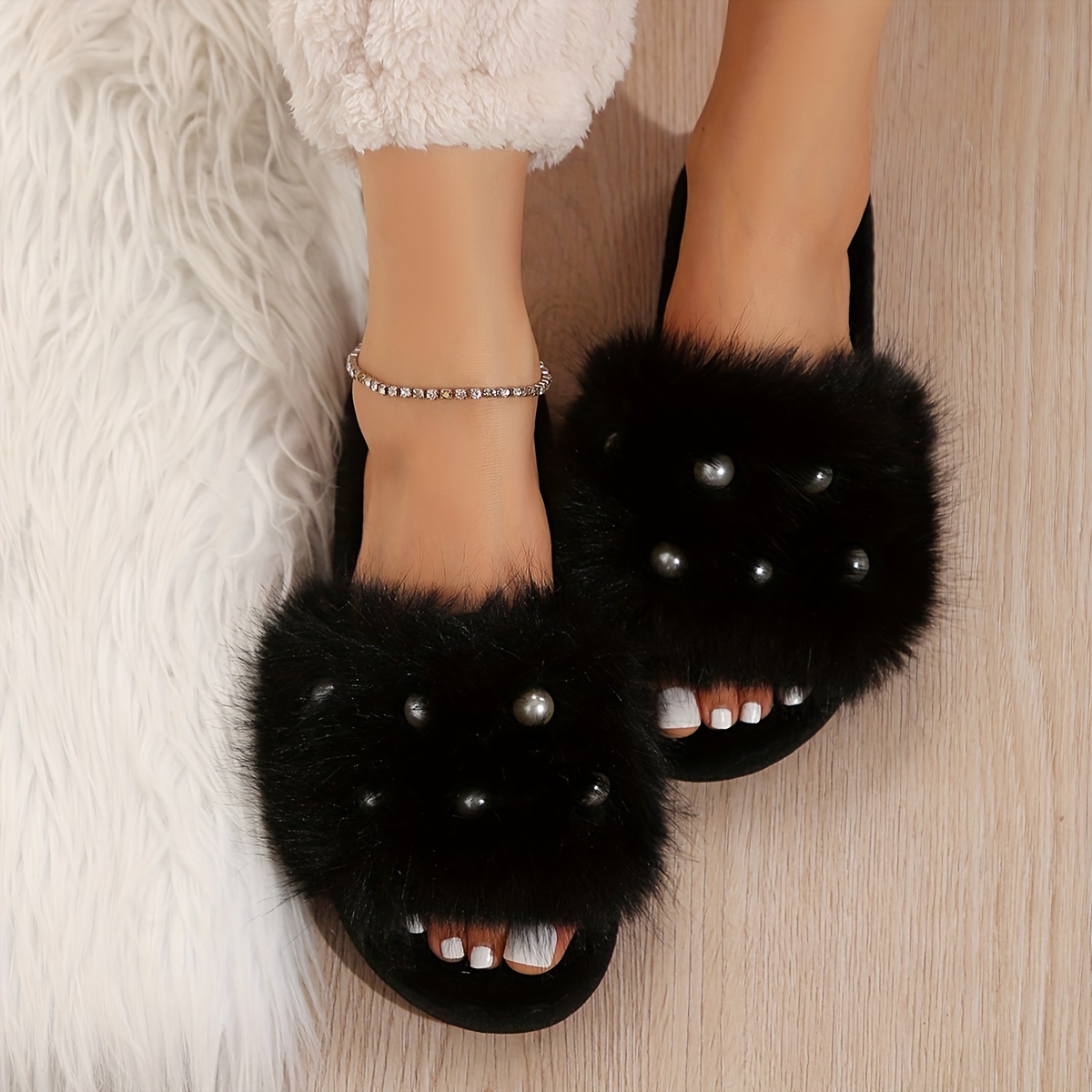 Fuzzy Faux Pearl Home Slippers, Soft Sole Plush Lined Indoor Shoes, Non-slip Floor Mute Slippers, Winter & Autumn