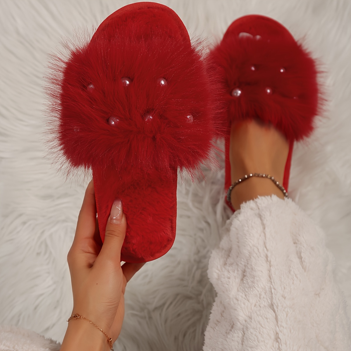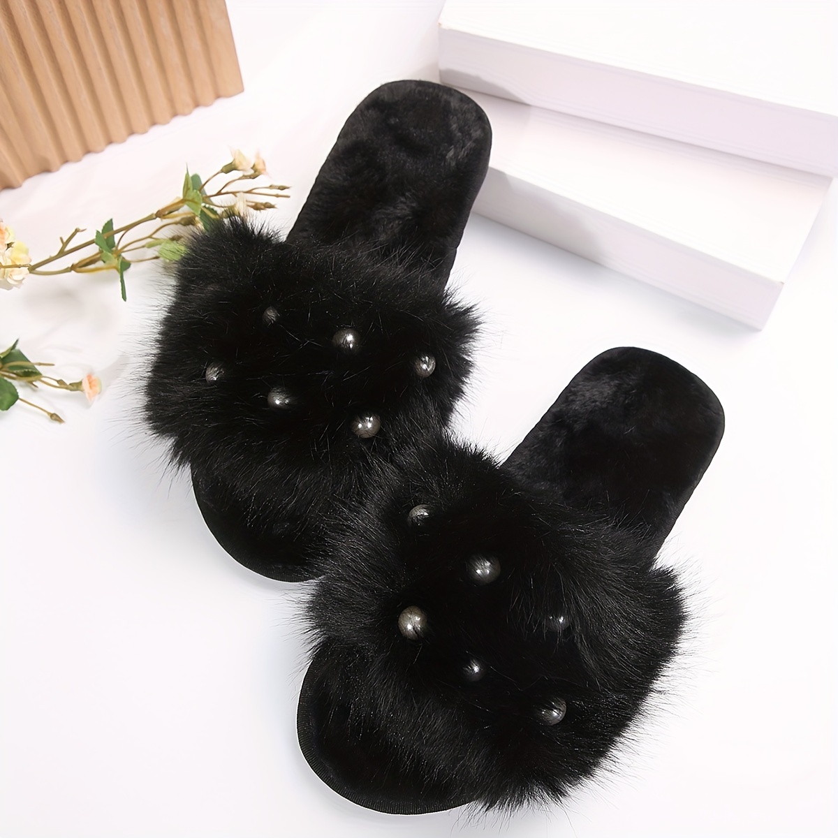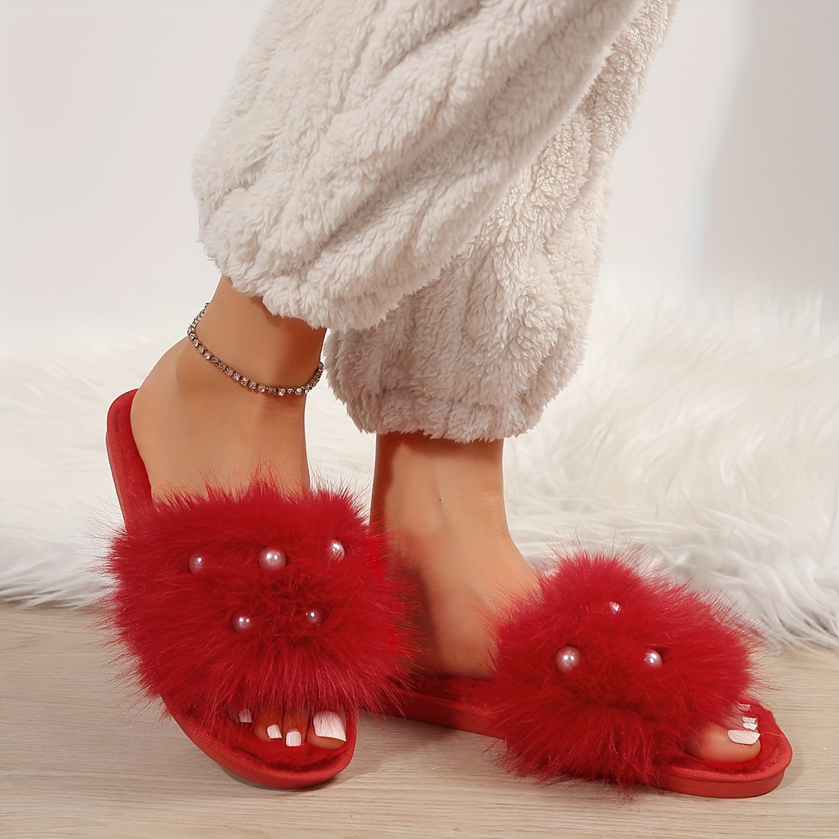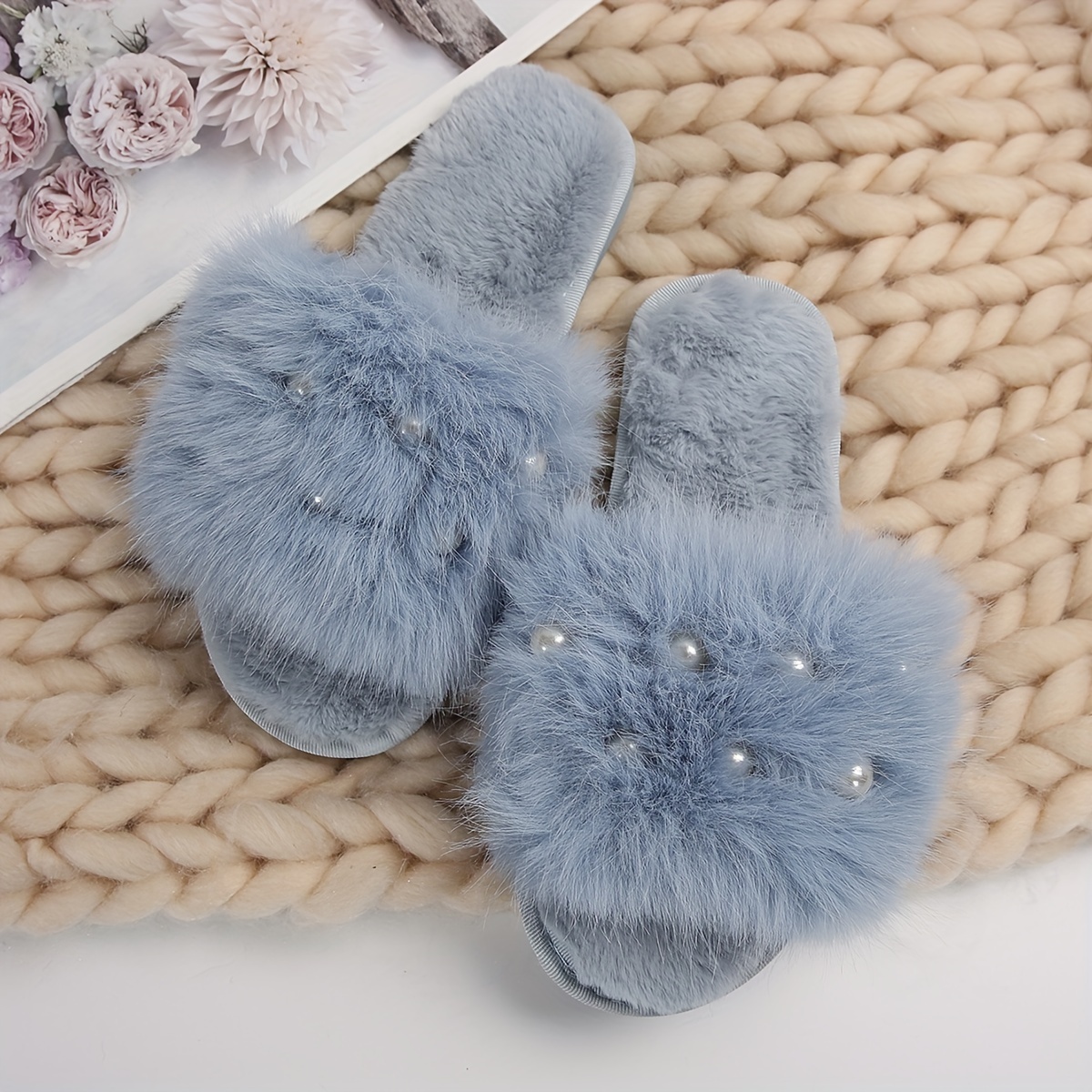 Fuzzy Faux Pearl Home Slippers, Soft Sole Plush Lined Indoor Shoes, Non-slip Floor Mute Slippers, Winter & Autumn