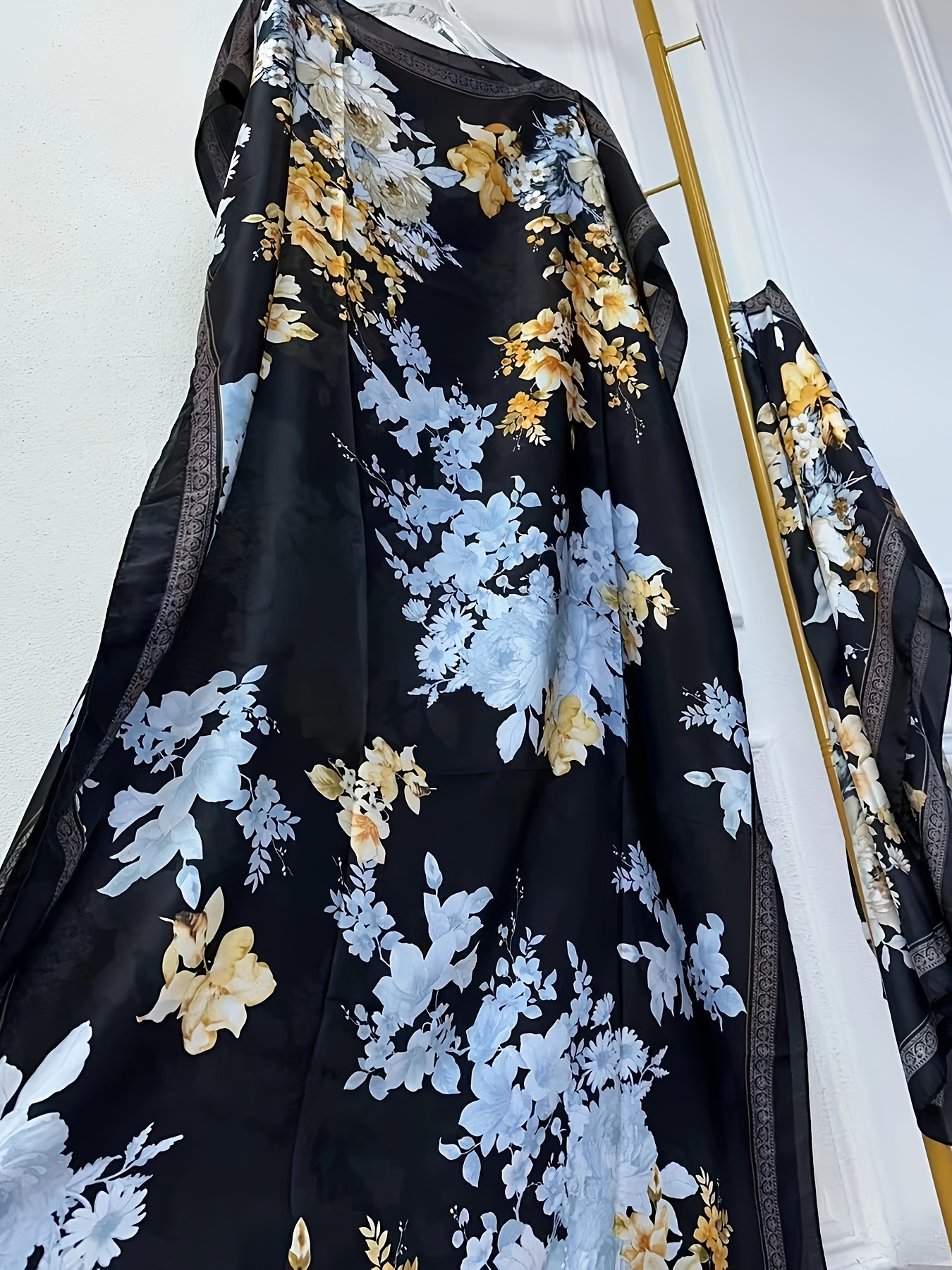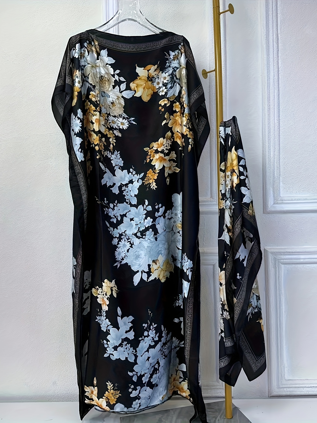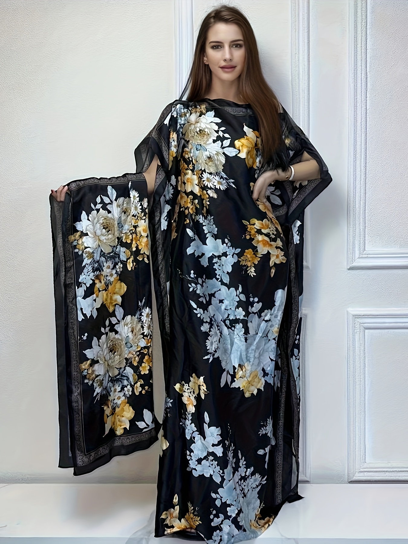 WINYI Women'S Long Kaftan Dress, Polyester 100% Crew Neck Tunic with Belt, Loose Fit All Over Print, Middle Eastern Bohemian African Style, Beach Cover Up, Elegant Evening Abaya for Dubai, Spring/Summer Collection