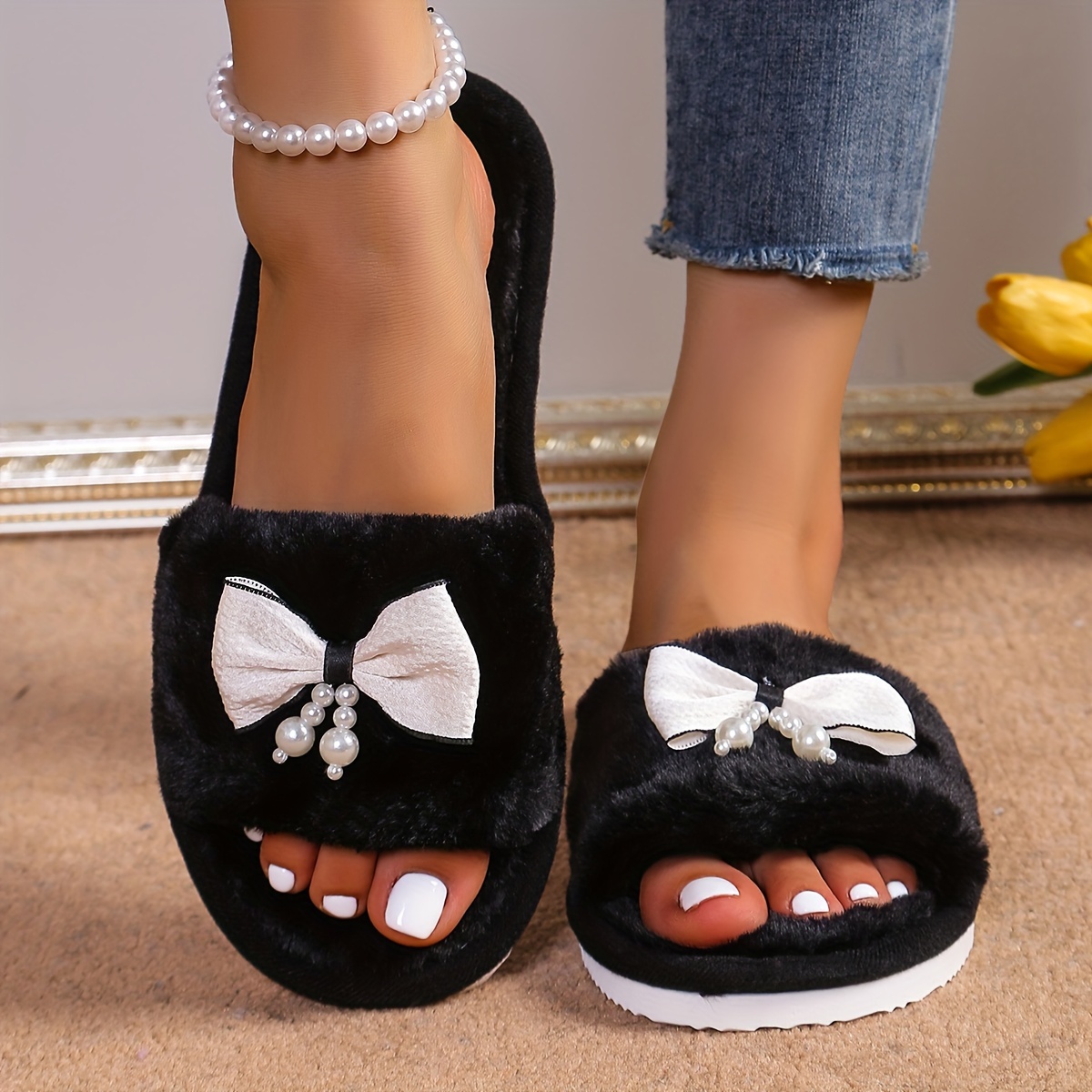 Women'S Black Fuzzy Slippers with Pearl Bow, Cartoon Pattern, Slip-on House Shoes, All-Season Indoor Footwear, Fabric Upper/Inner, EVA Sole, Hand Washable